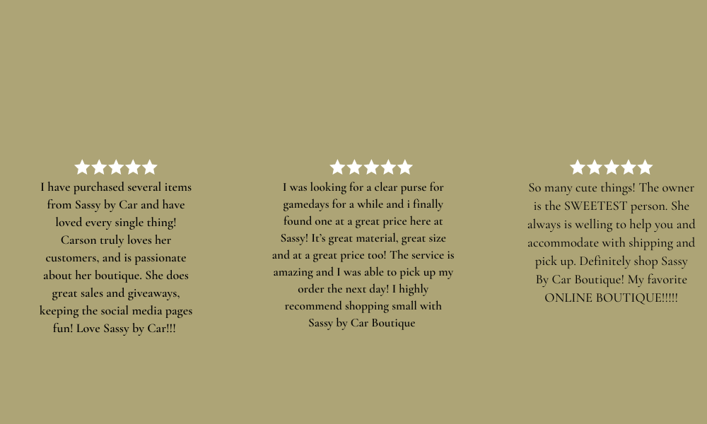 Hey y'all I am Car. Thank you so much for being here and shopping at Sassy! I started this dream of opening a boutique in May of 2021. I have always had a love for fashion and making YOU feel confident in the clothes you put on. Nothing is better than having clothes that make you feel confident and look beautiful.