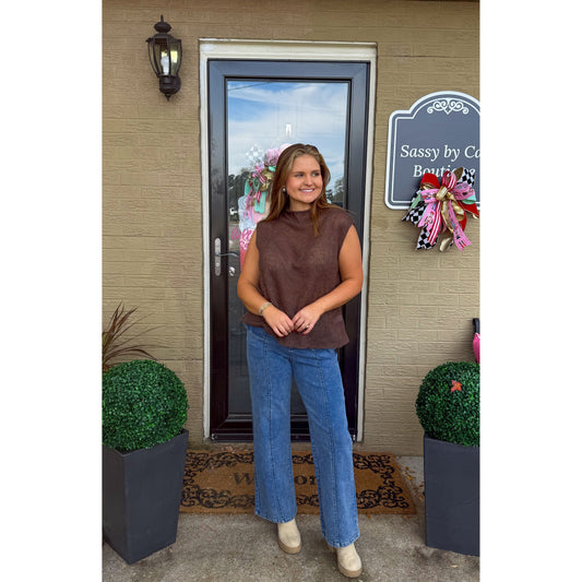 Mock Neck Cutout Top, Dark Brown