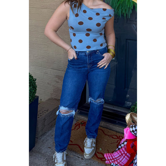Polka Dot Asymmetrical Detail Top, Blue/Brown