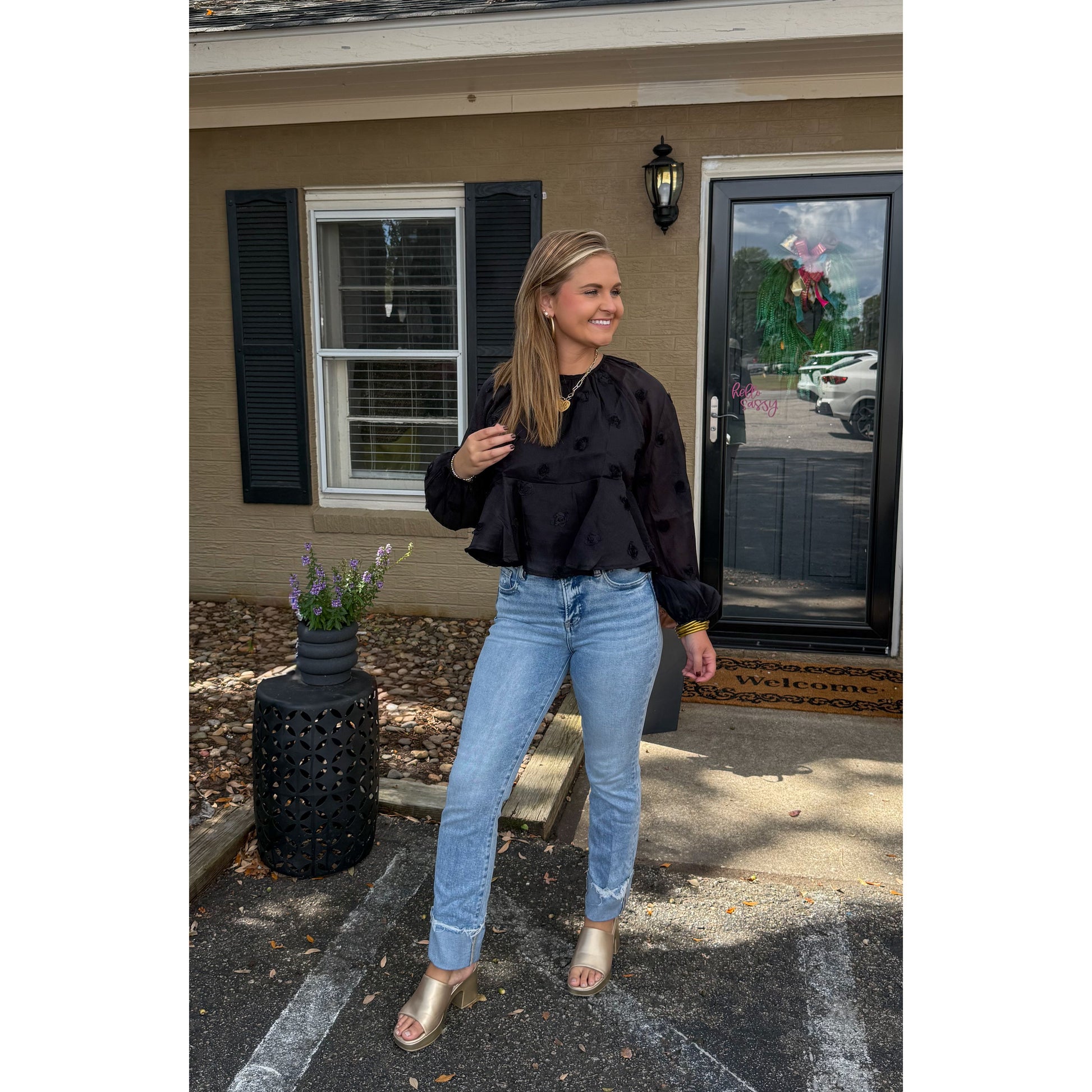 Black long sleeve detail blouse. Mesh detail. Top is lined. Keyhole closure along the back. Flower appliqué along the top. Pleated detail along the bottom of top.