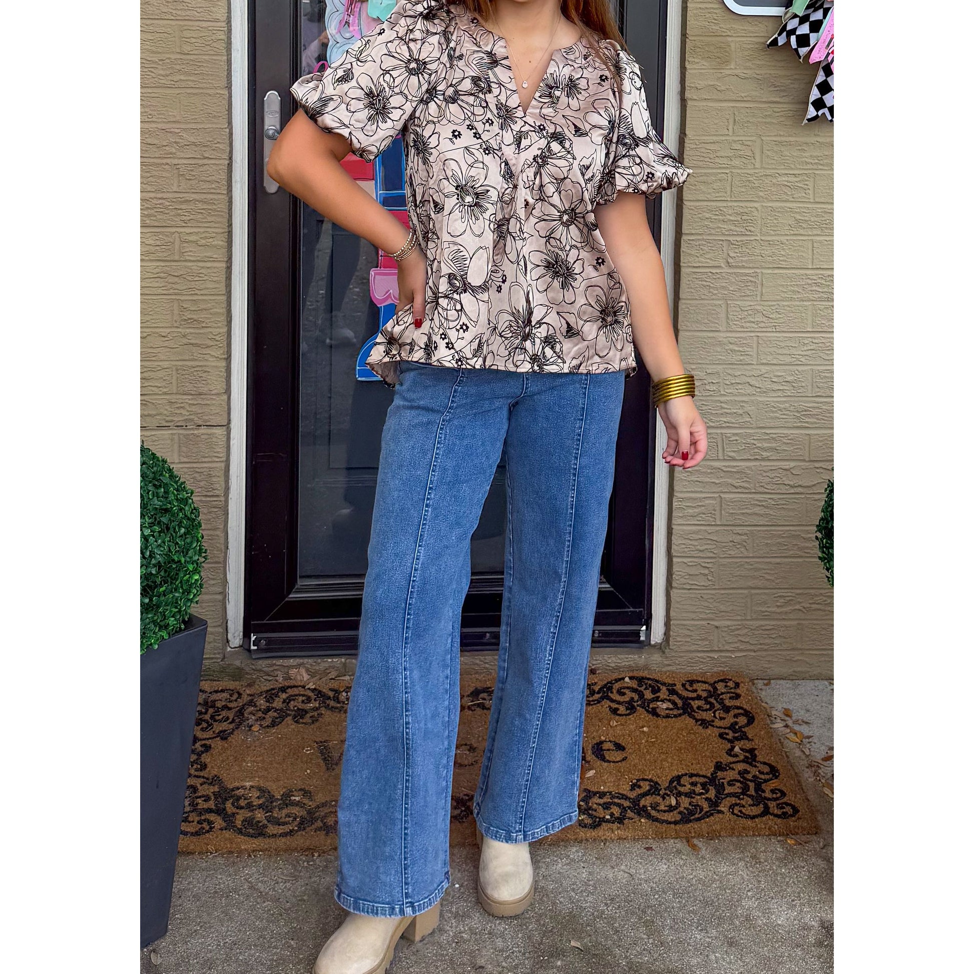 Taupe blouse with puff sleeves and black velvet floral detail.