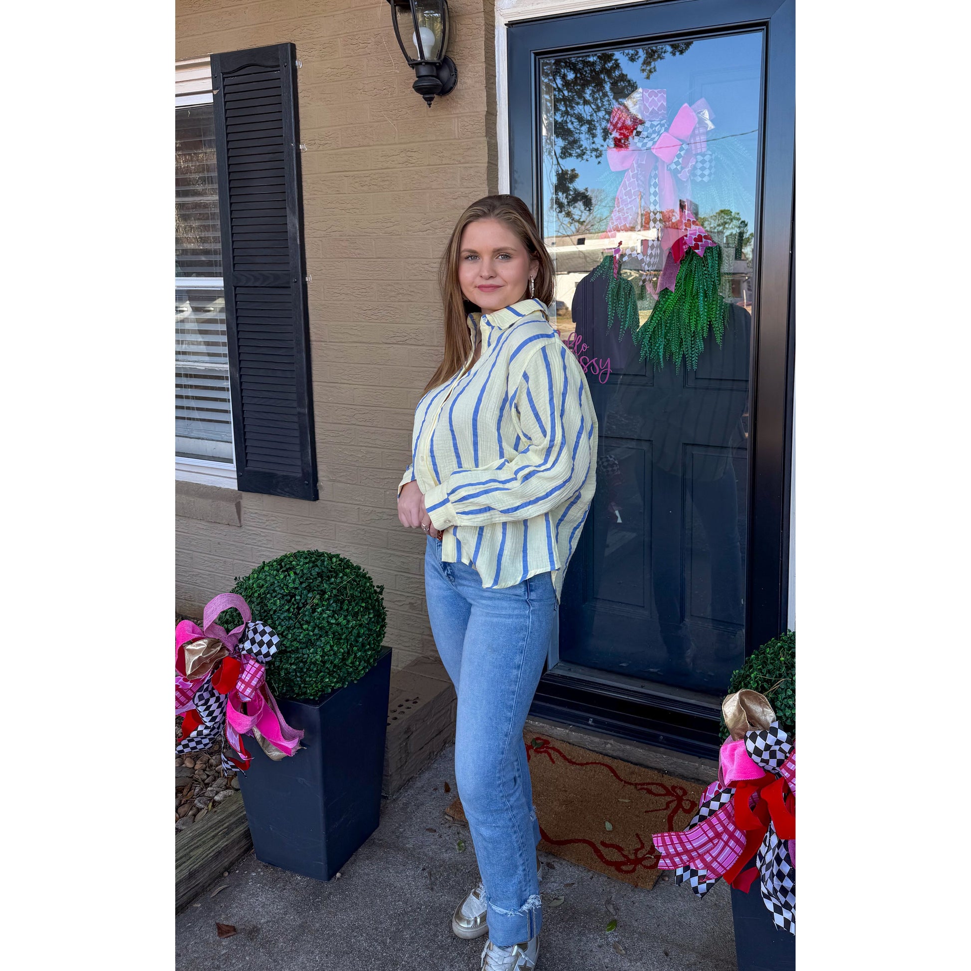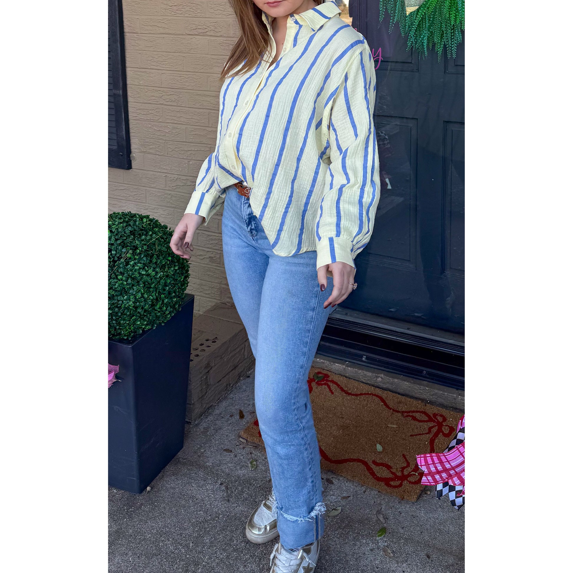 Butter yellow/blue stripe button down detail top with collar detail. Top is looser fitting/oversized.