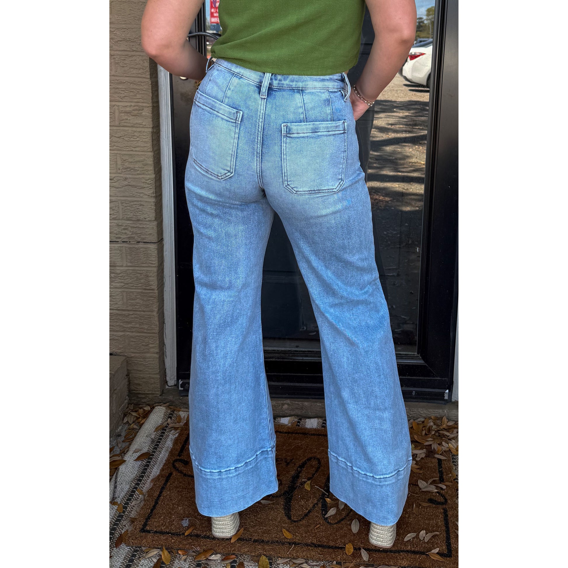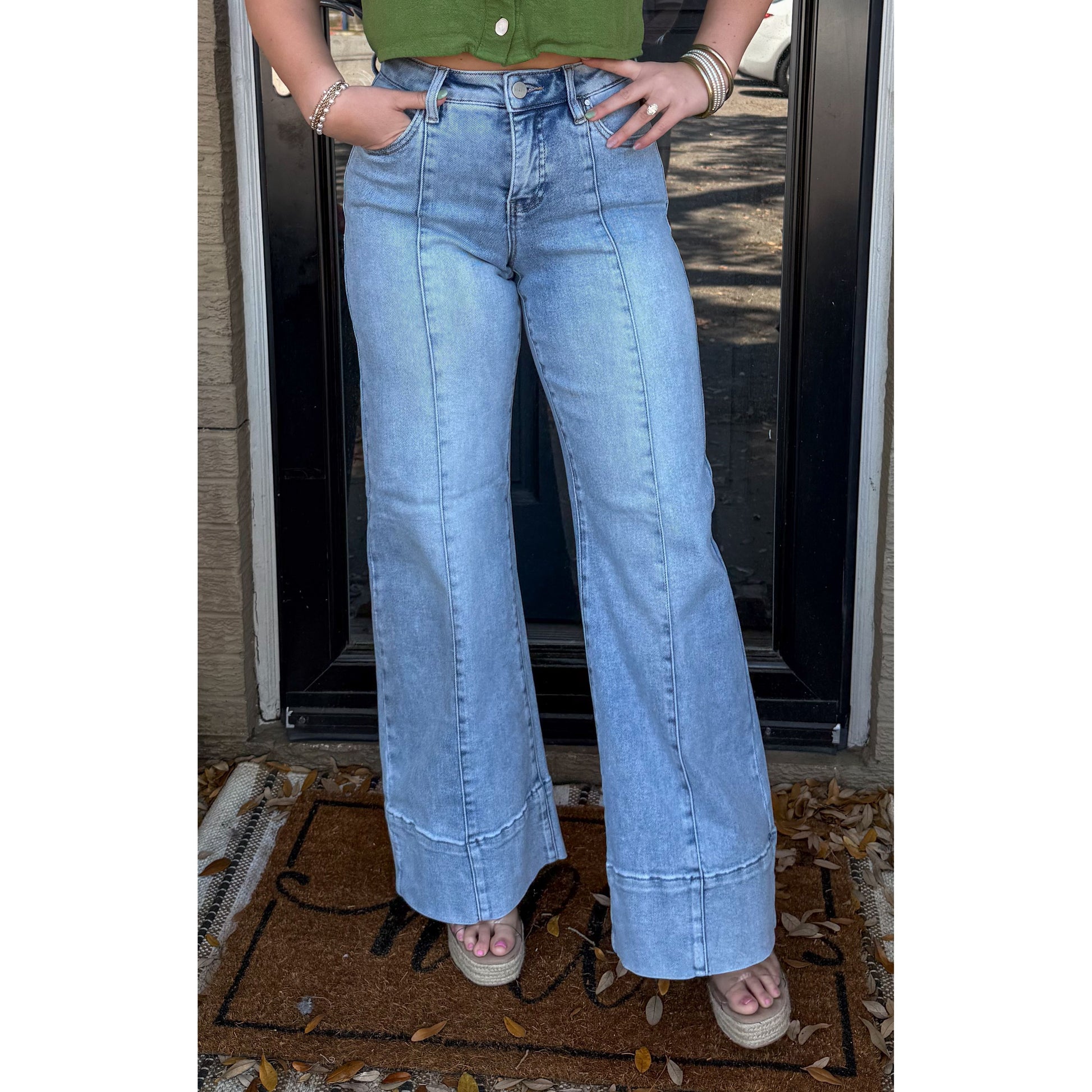 RISEN JEANS! Light wash tummy control mid rise jeans with flare leg.