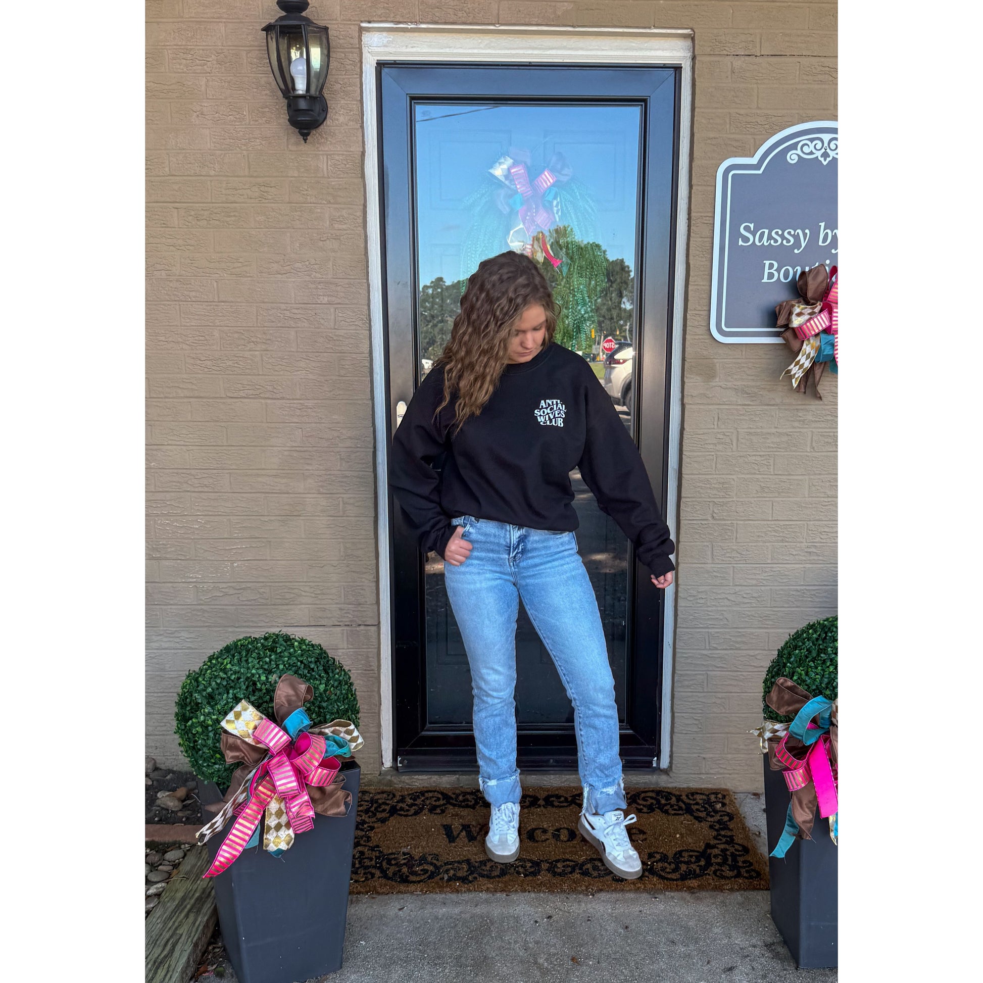 Black sweatshirt with white 'Anti Social Wives Club' on the back of sweatshirt and on left front chest.