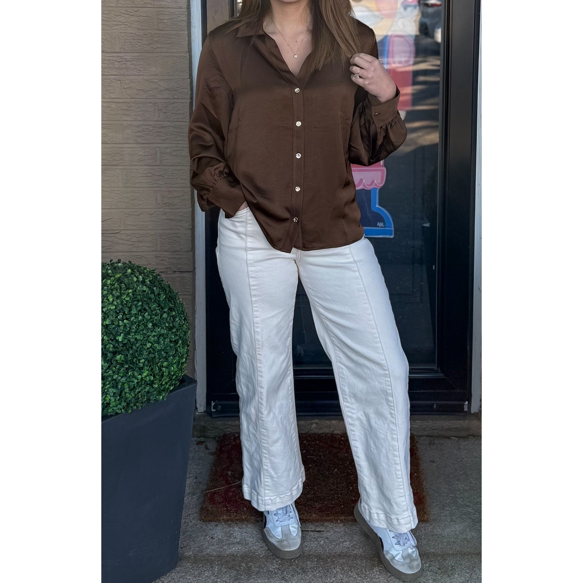 Satin material long sleeve blouse in chocolate brown with collar detail and gold button down detail.