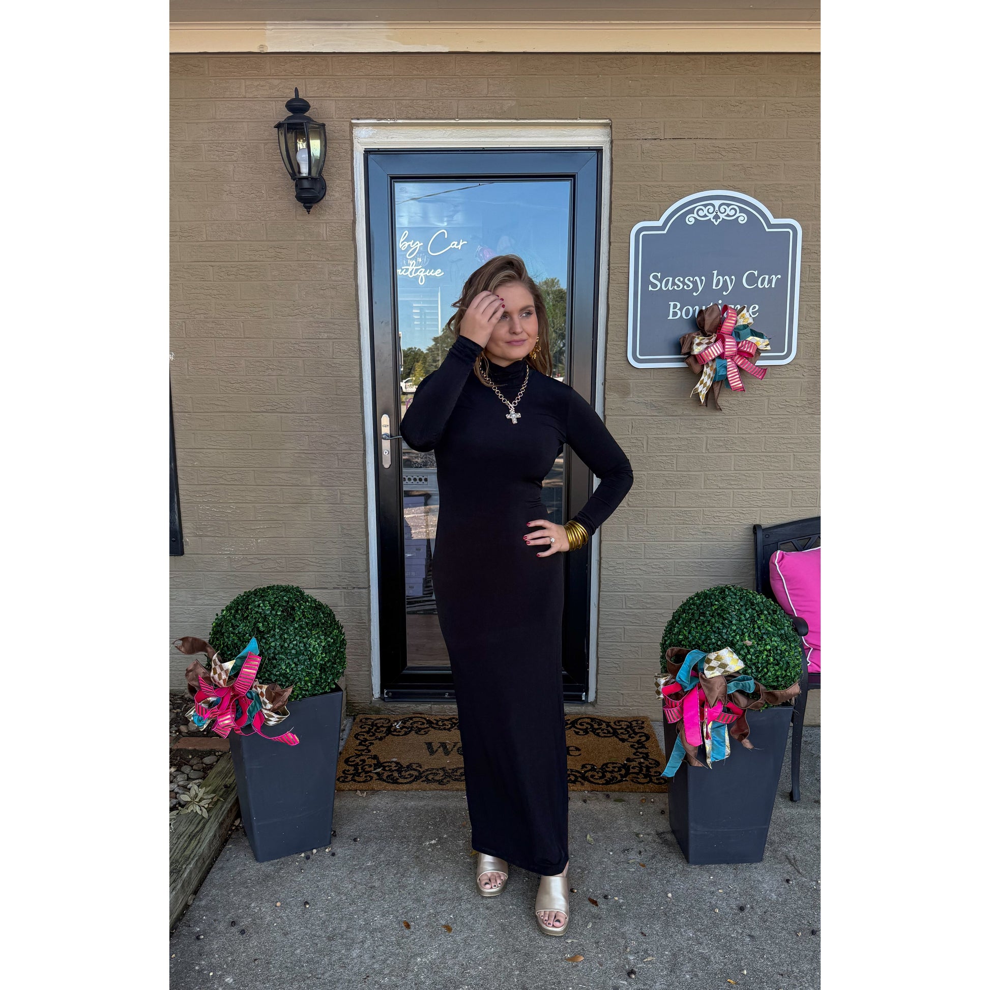 Fitted maxi dress in black. Turtleneck with long sleeves. Even though it's fitted it does have great stretch. Perfect to wear by itself or layer!