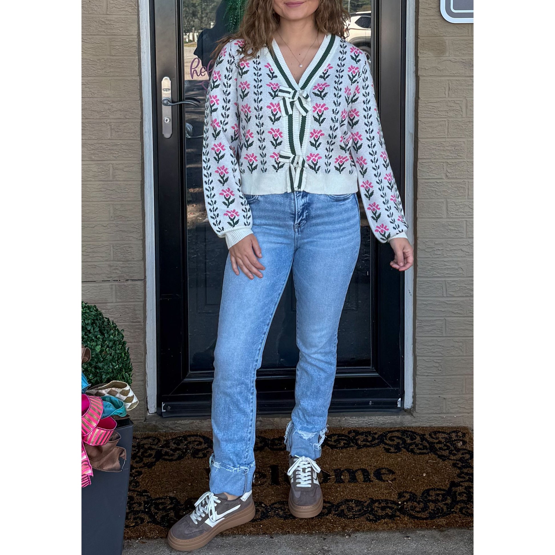 Multi-color pattern v-neck cardigan. 2 bow snap button closure cardigan with v-neckline. Balloon sleeves. Stripe detail along the collar and front of top.