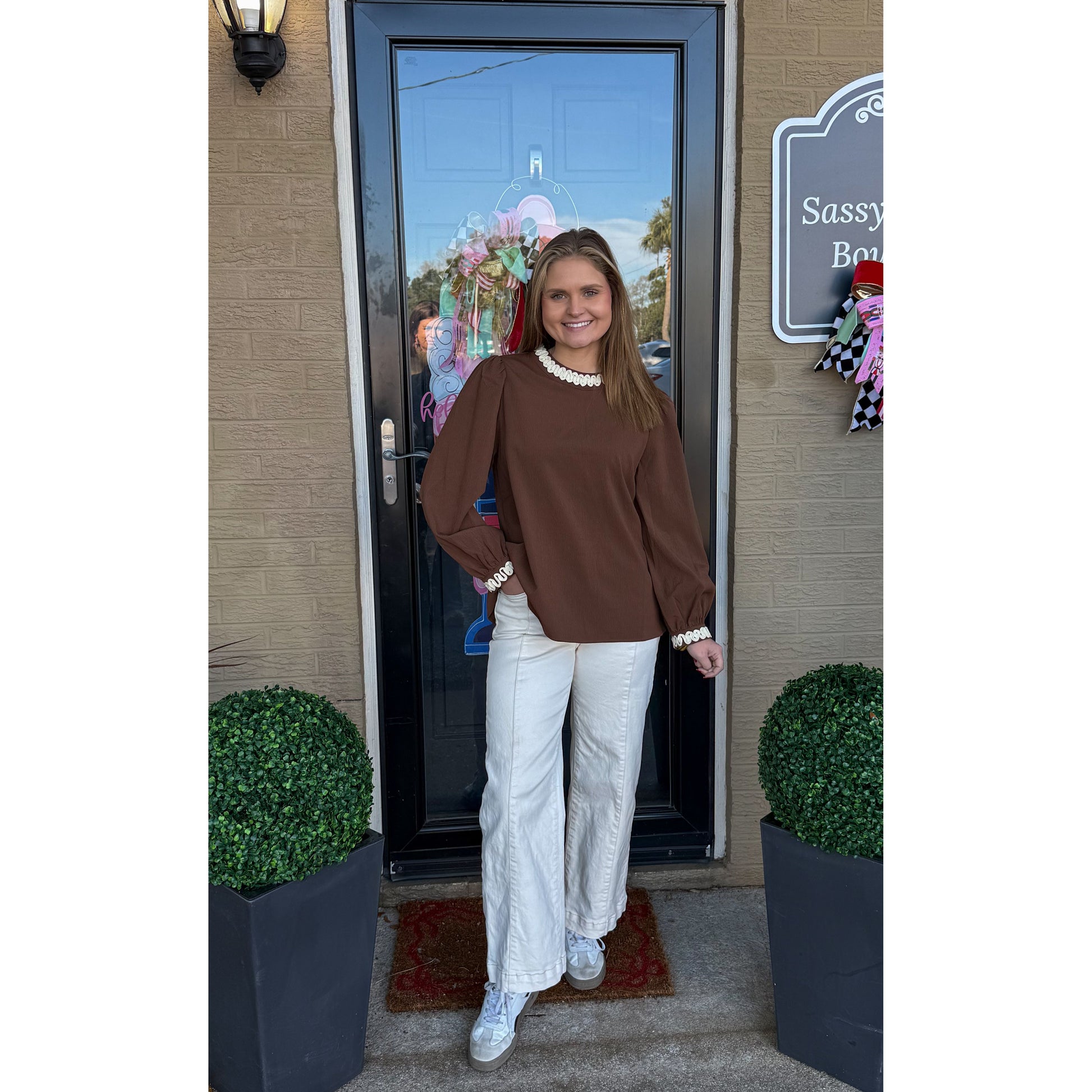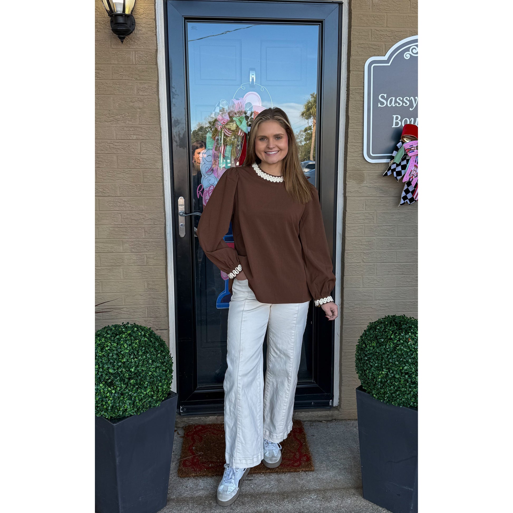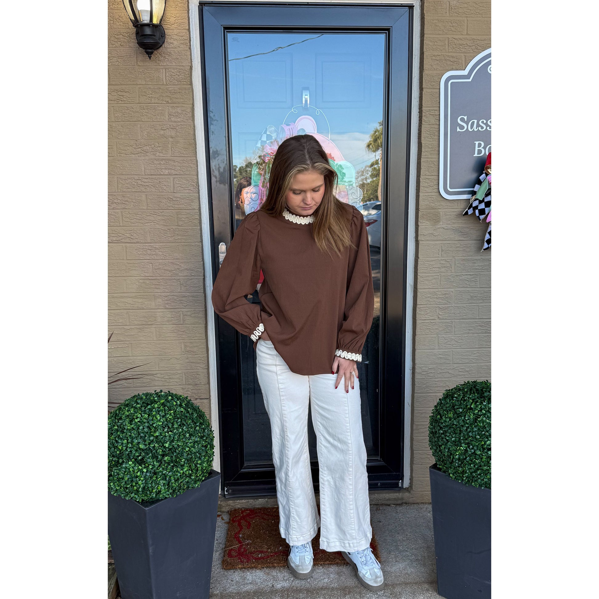Long sleeve blouse in brown with ivory detail along the collar and cuff of sleeves. Two keyhole closure in the back of blouse. Top is looser fitting.