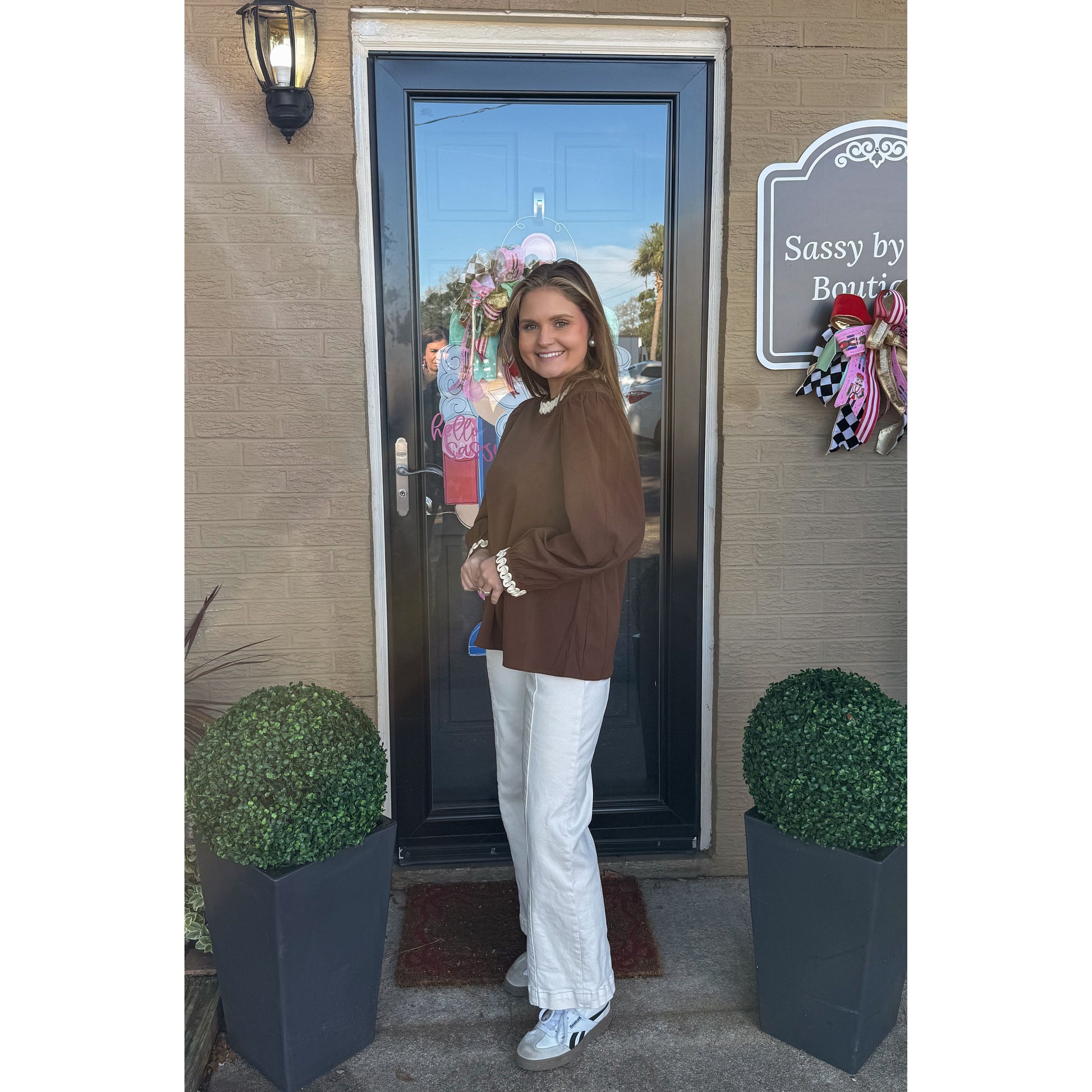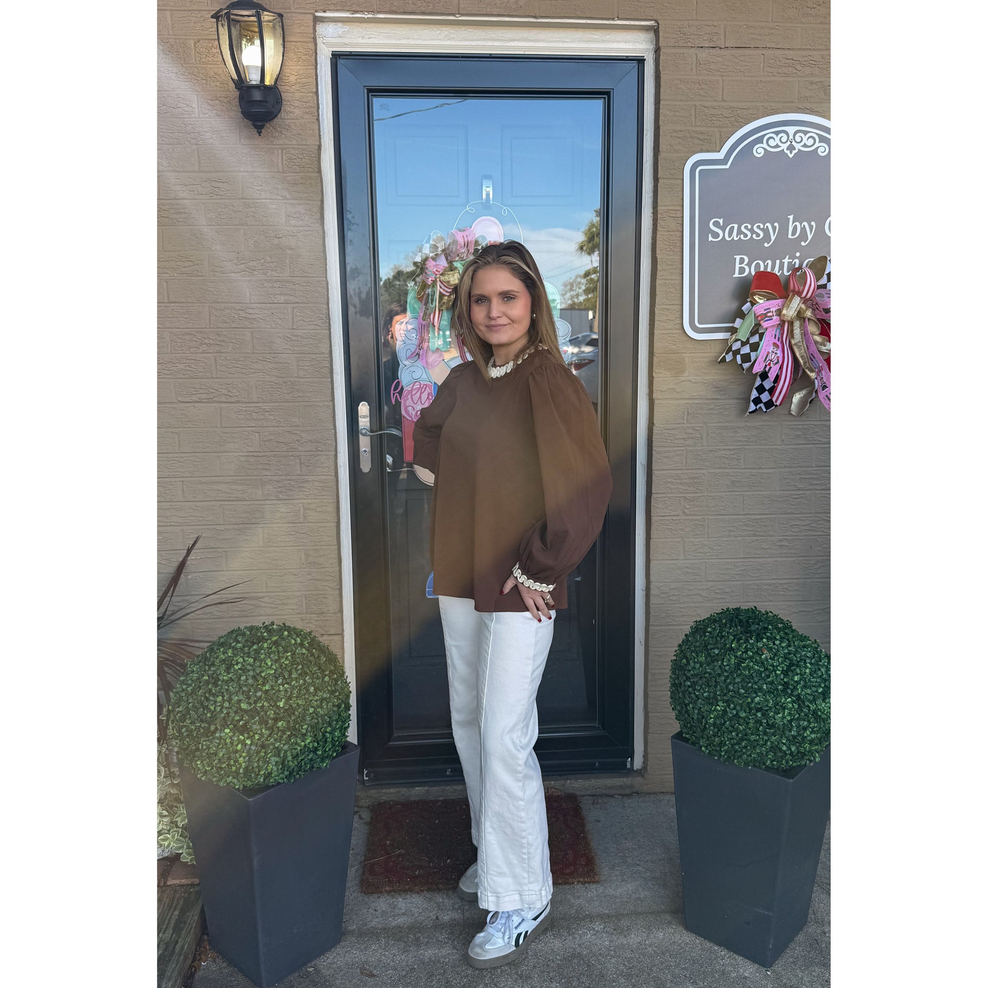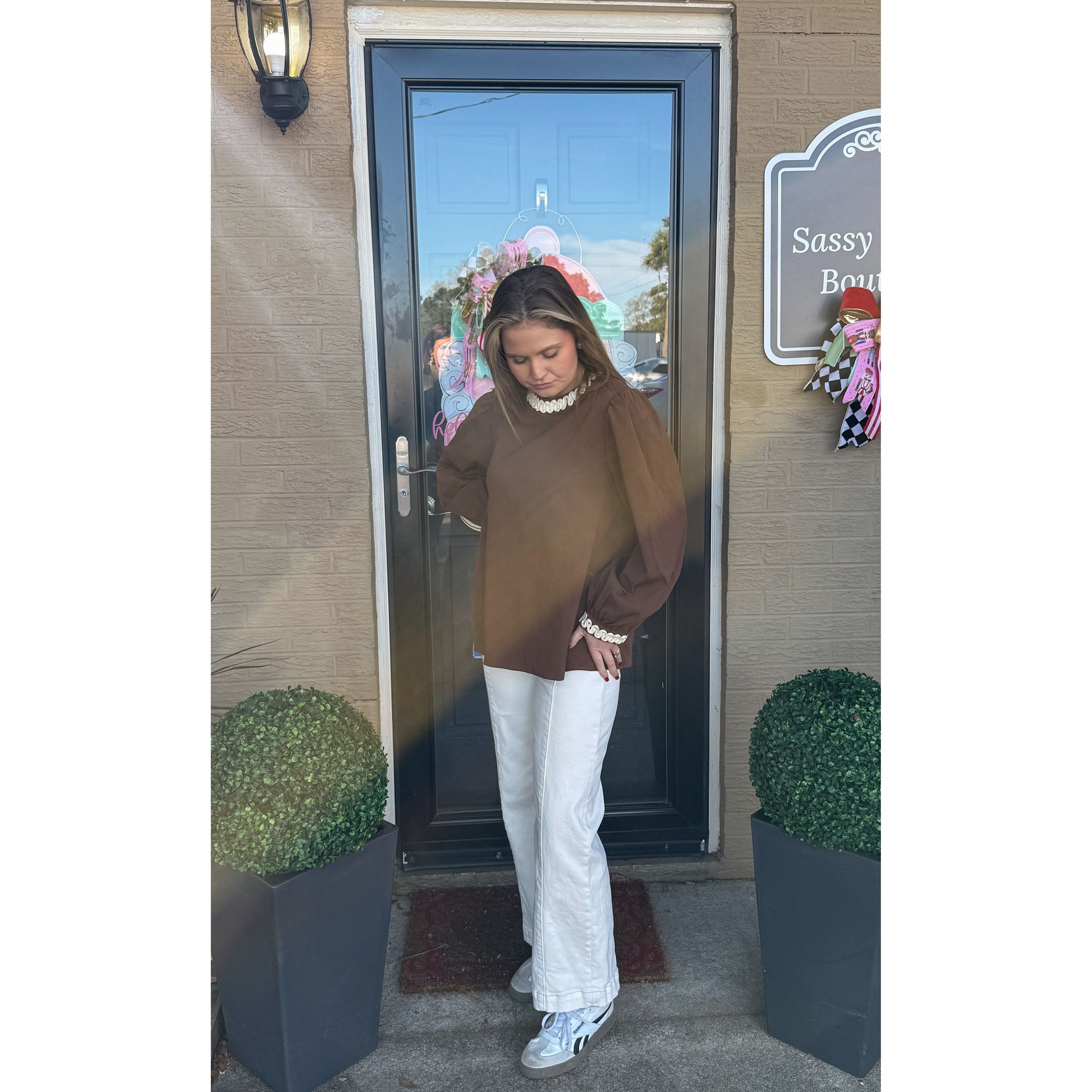 Long sleeve blouse in brown with ivory detail along the collar and cuff of sleeves. Two keyhole closure in the back of blouse. Top is looser fitting.