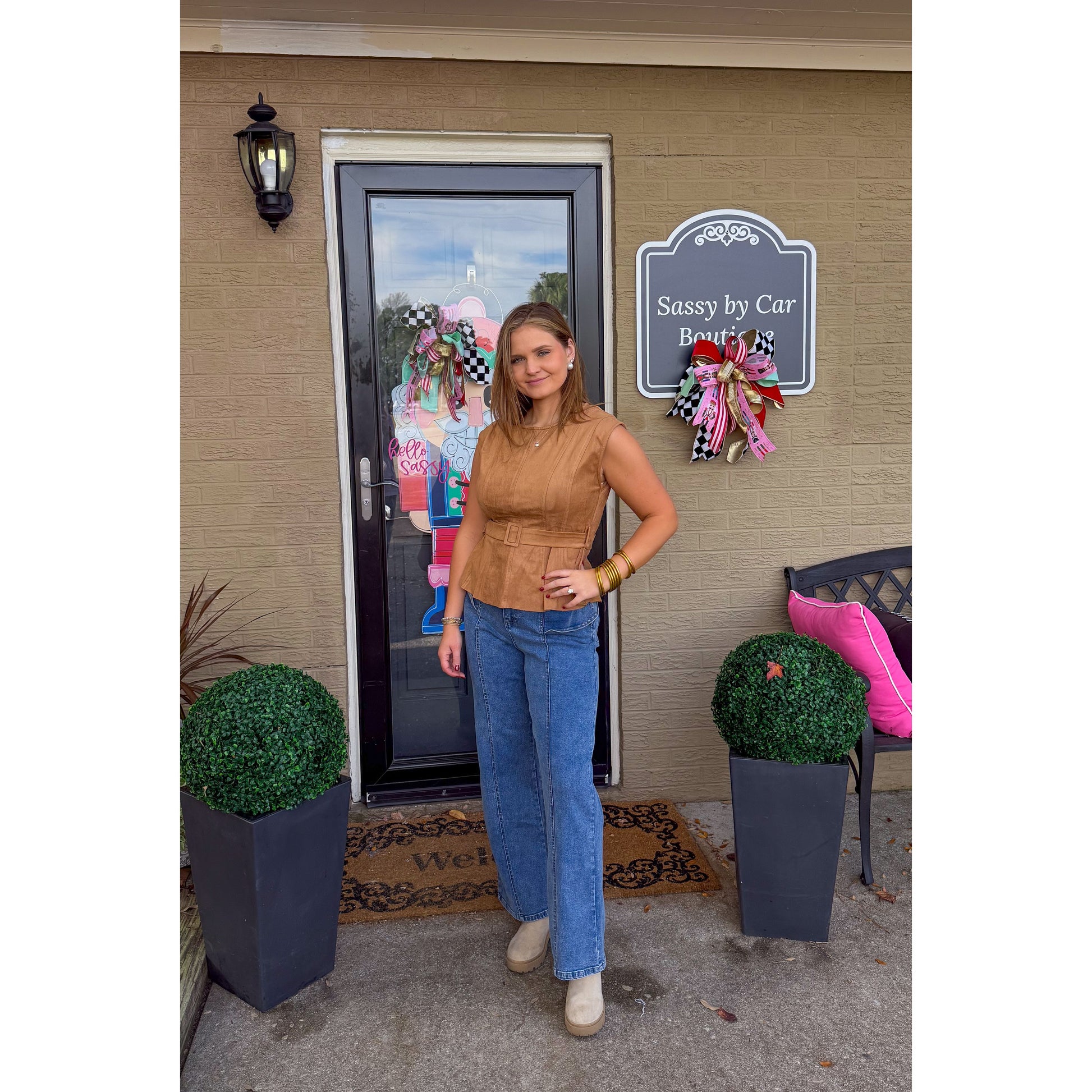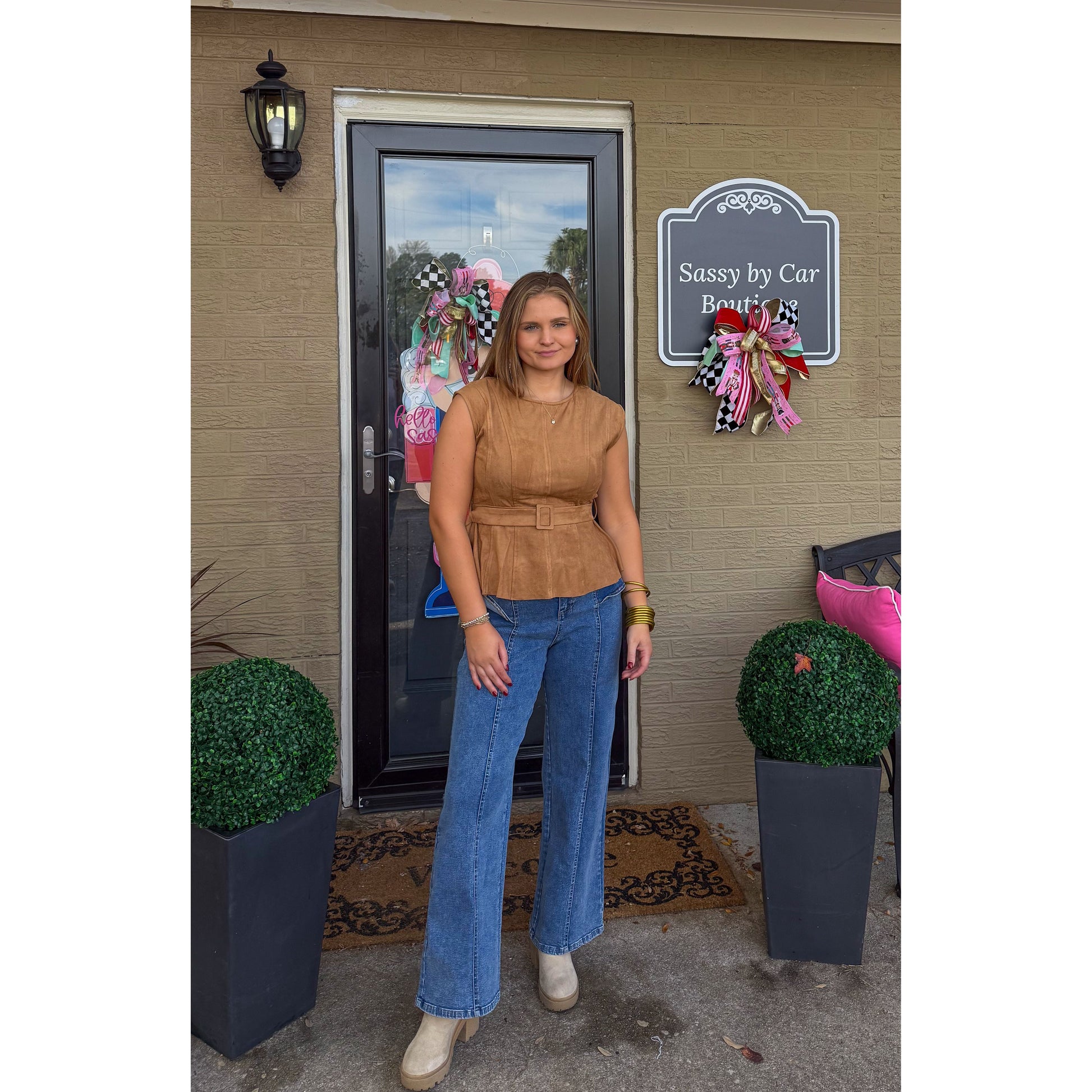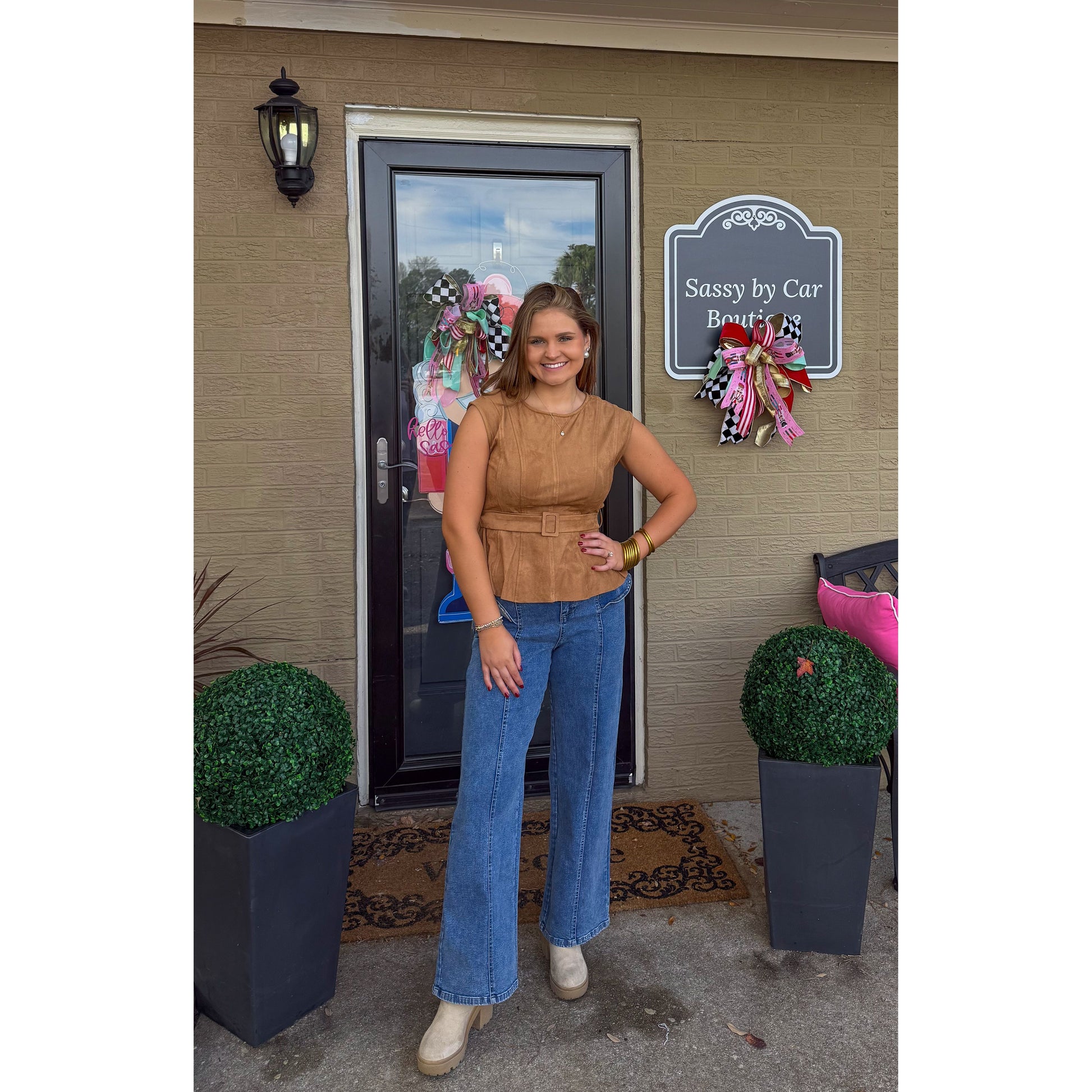 Camel color faux suede blouse with belt around the waist of top and back zipper closure.