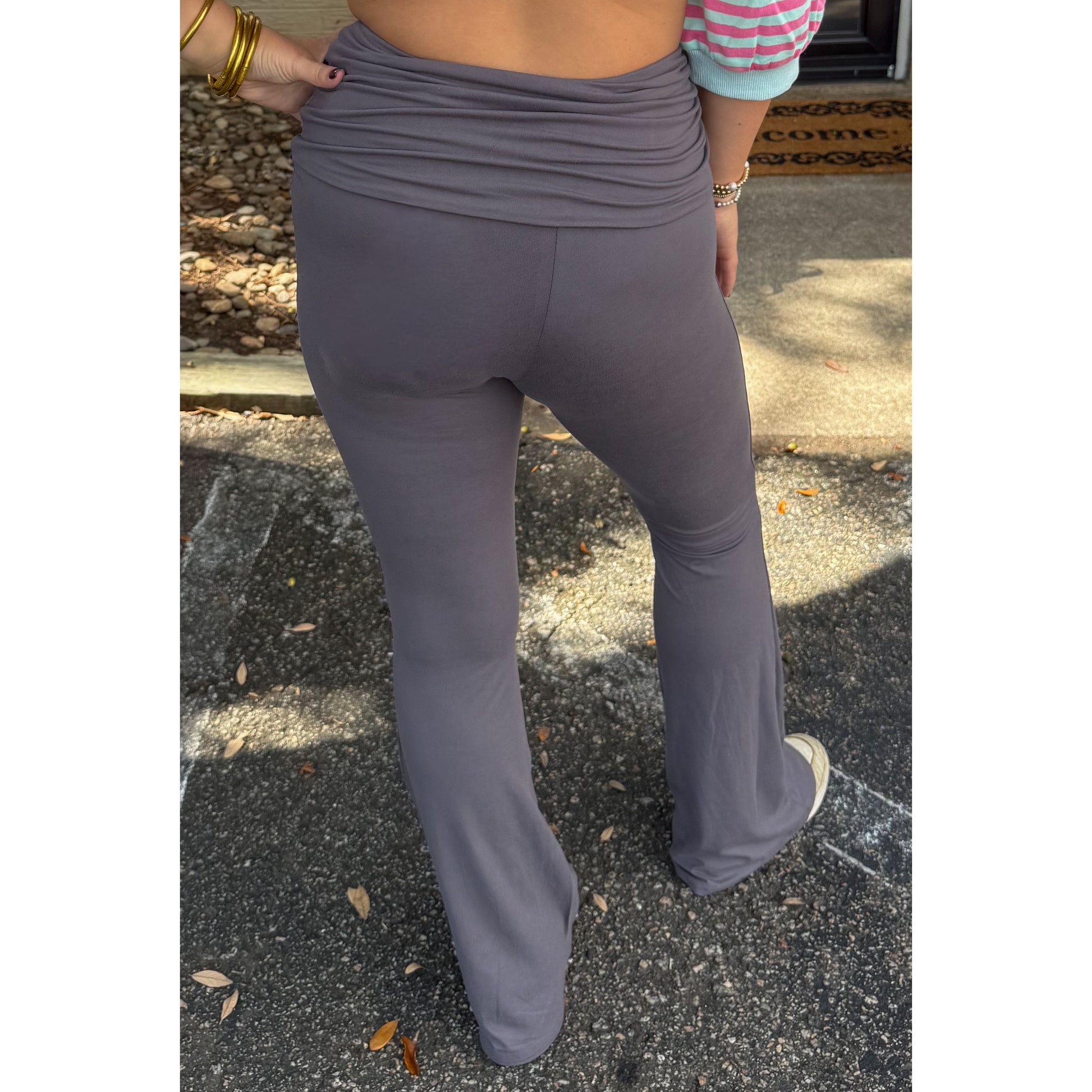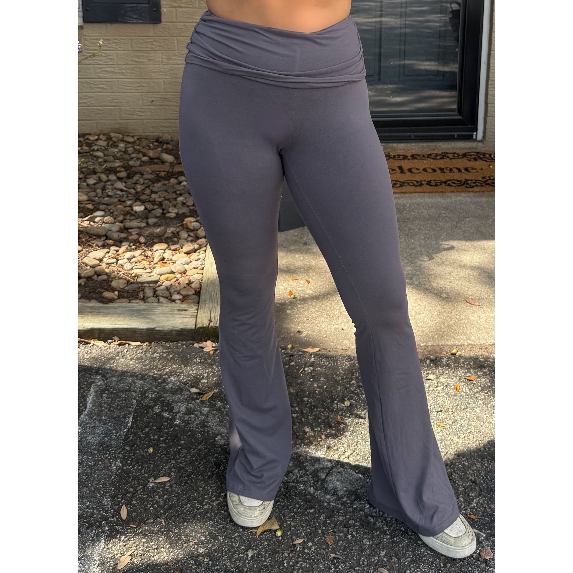 Jersey material yoga pants in grey. Low waisted with flare leg and has ruching detail along the waist with flap over.