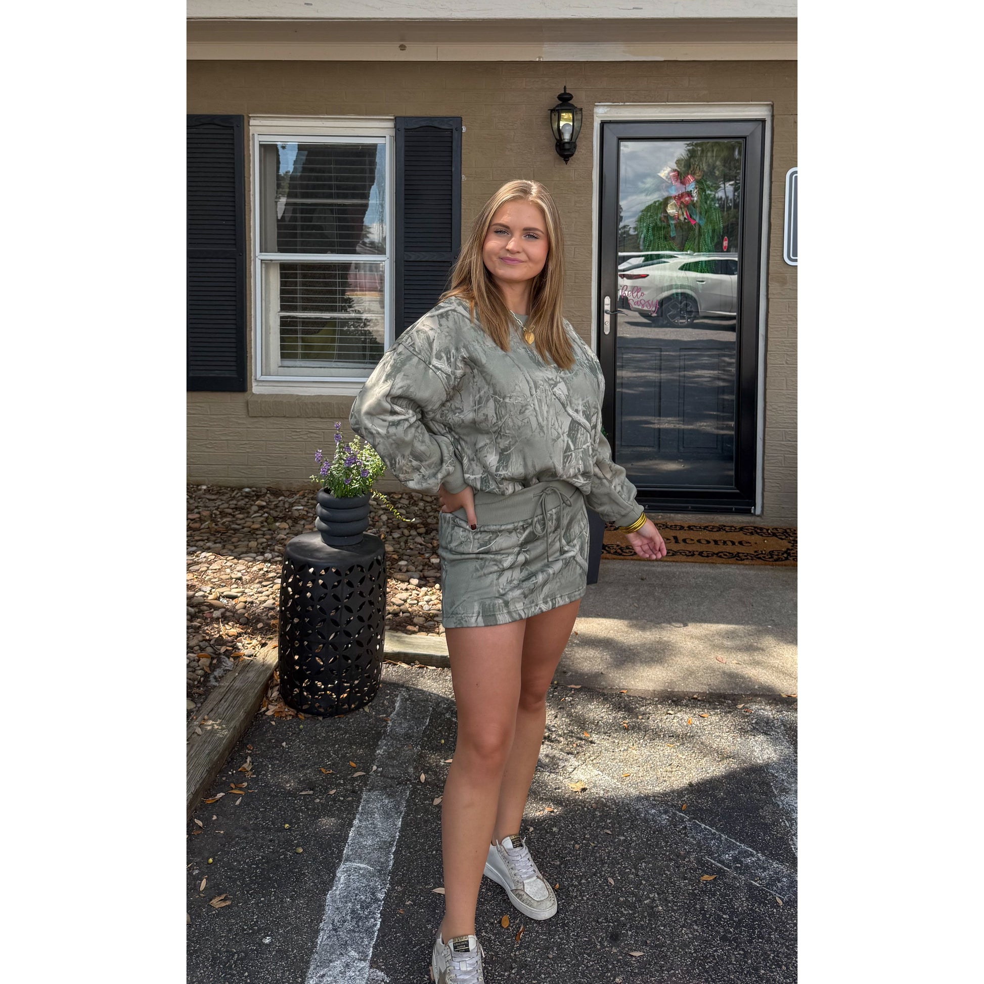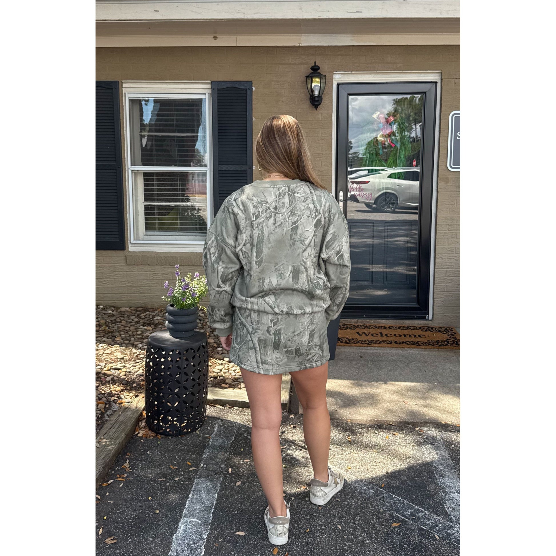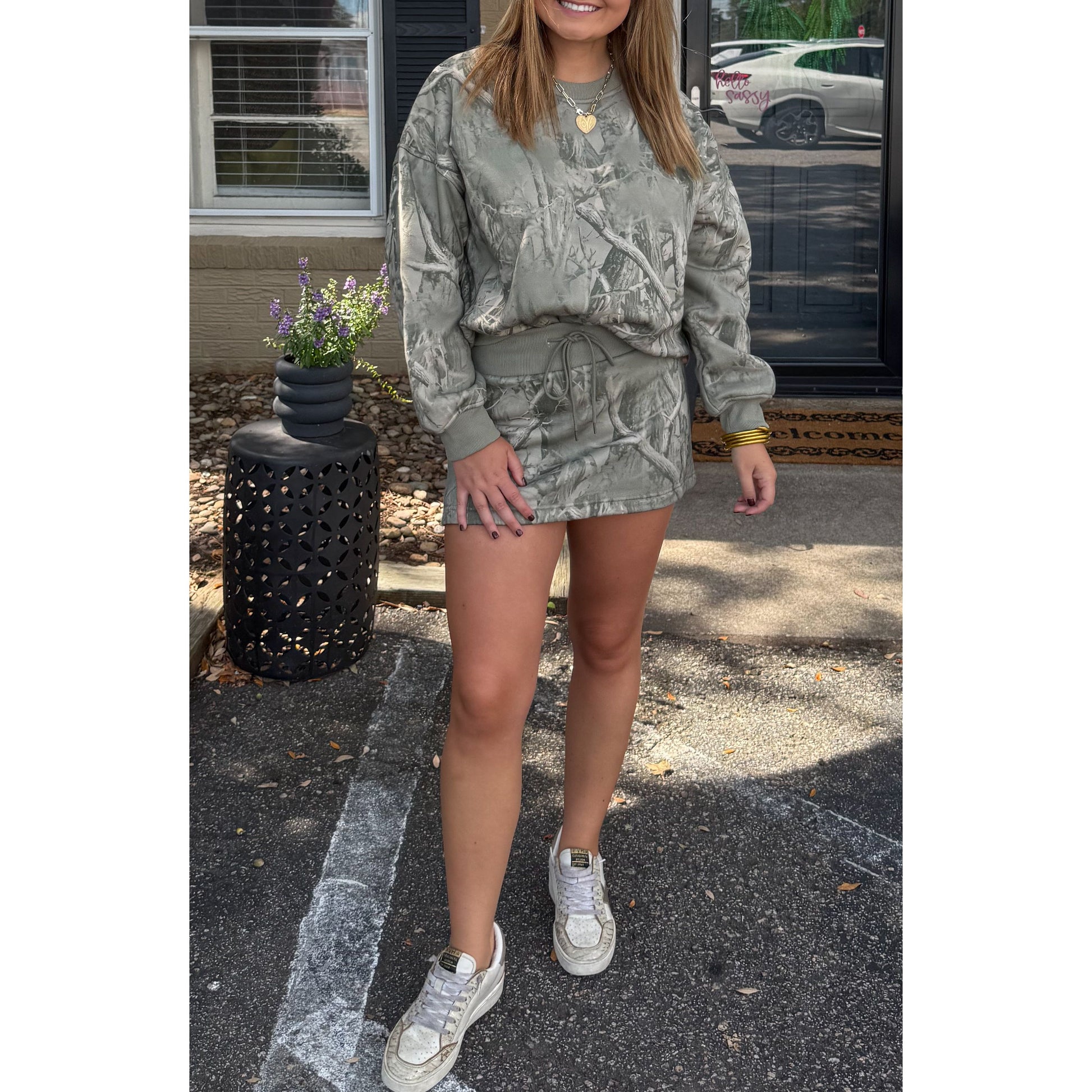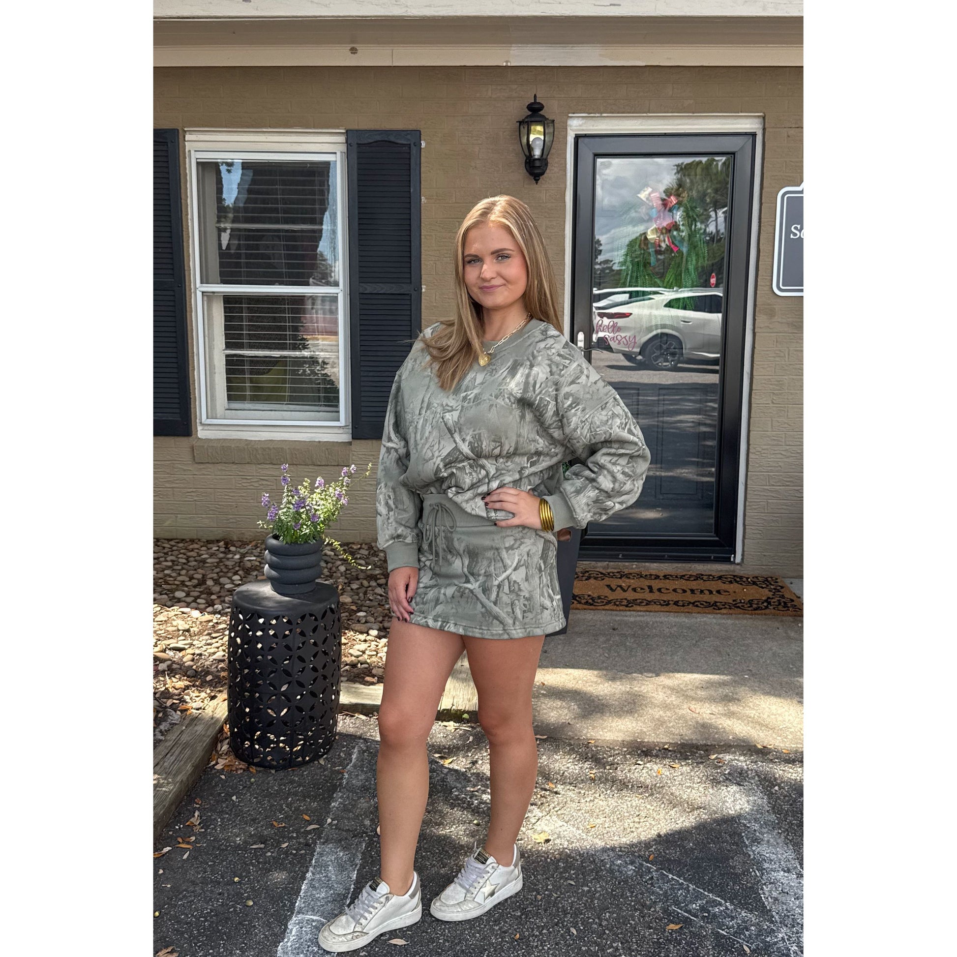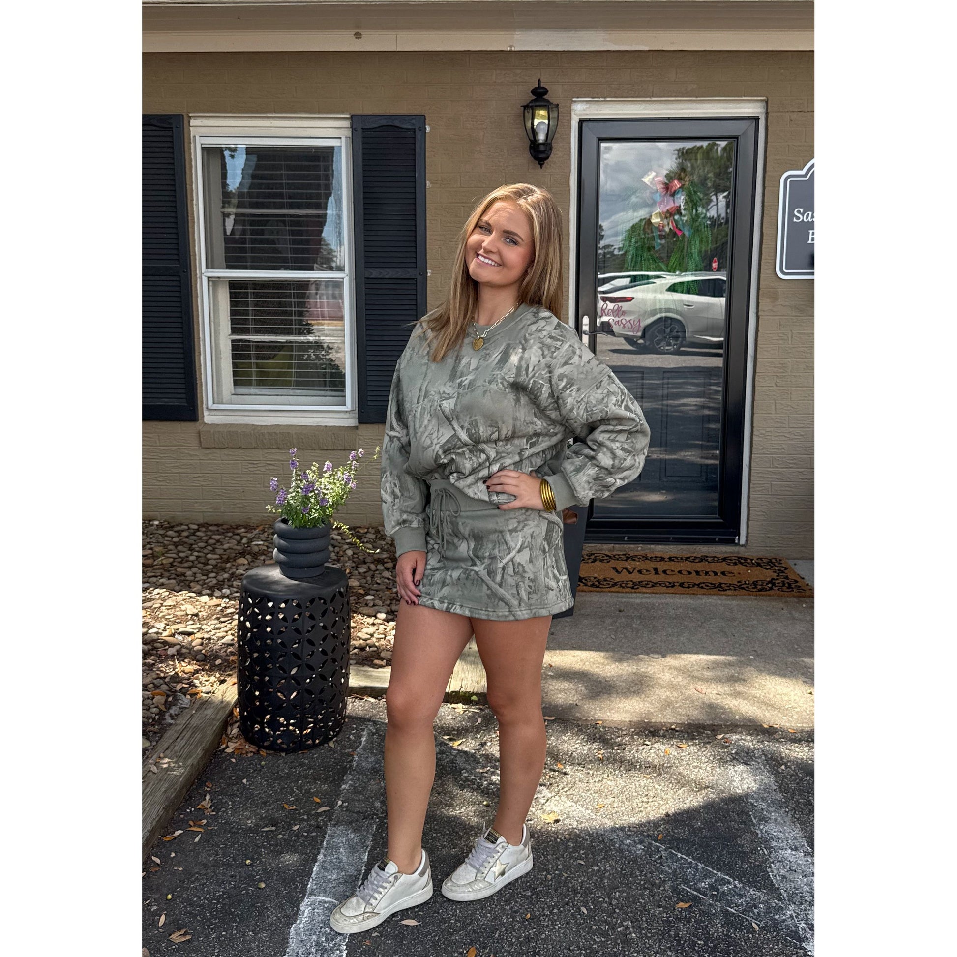 This is going to be a best seller! Camo print lounge set. Oversized sweatshirt. Waistband of skort with tie detail to make tighter or looser. Skirt has built in shorts.
