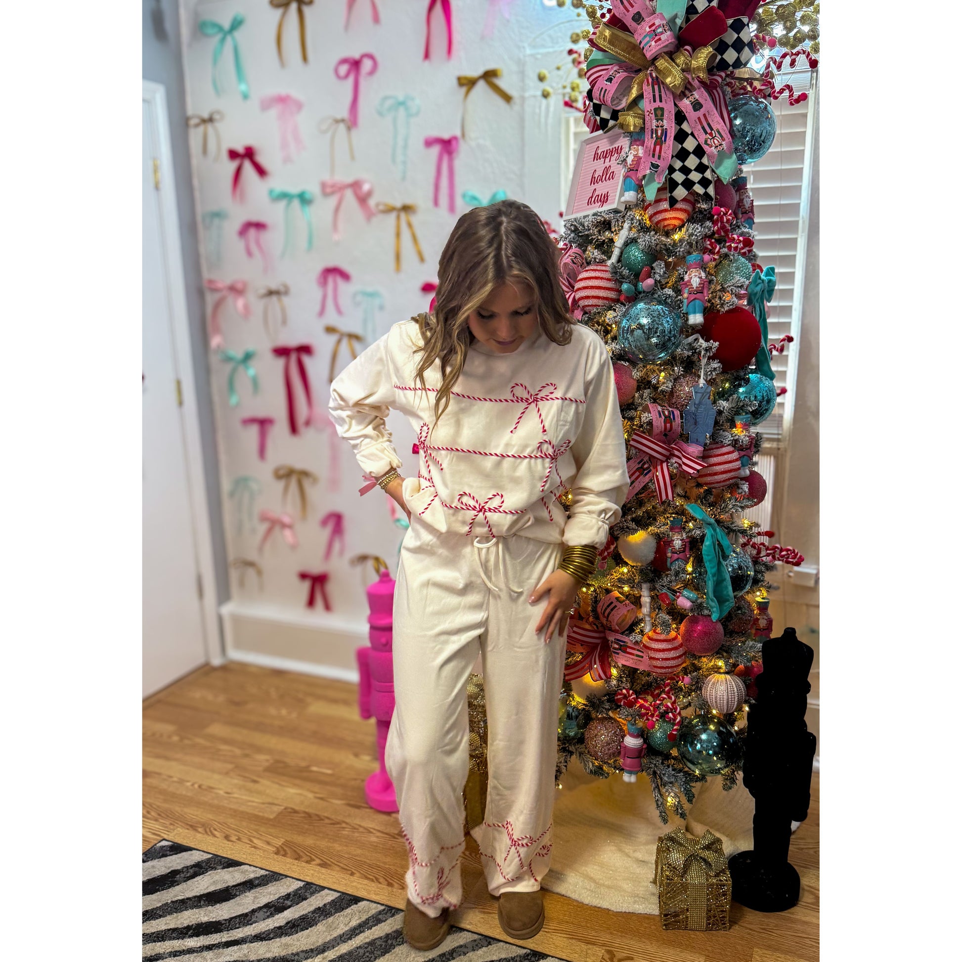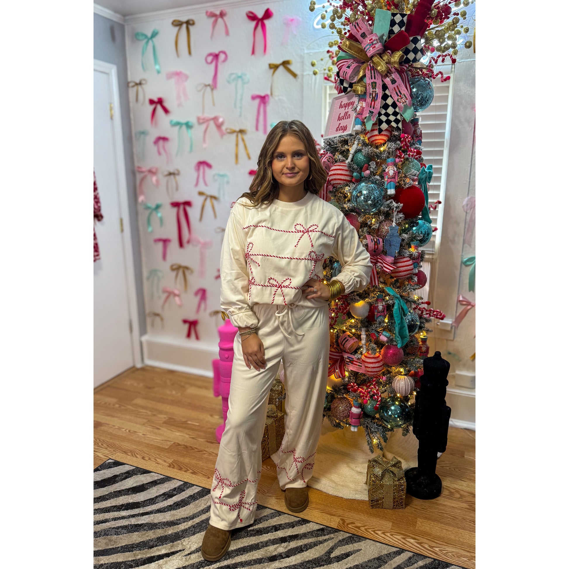 How cute is this?! Candy cane detail lounge set. Sold as a set. Top is long sleeve and pockets are flare leg with elastic waistband.