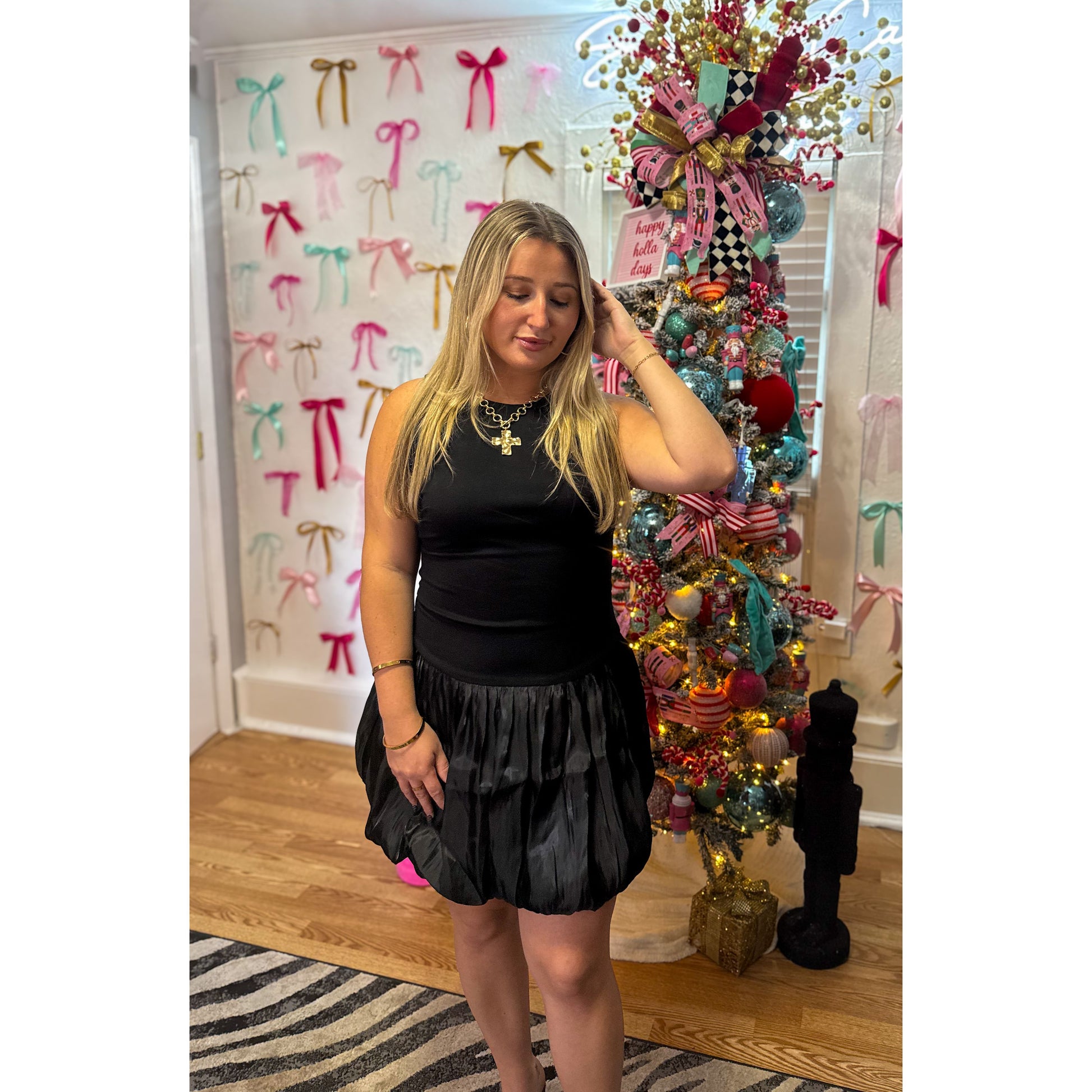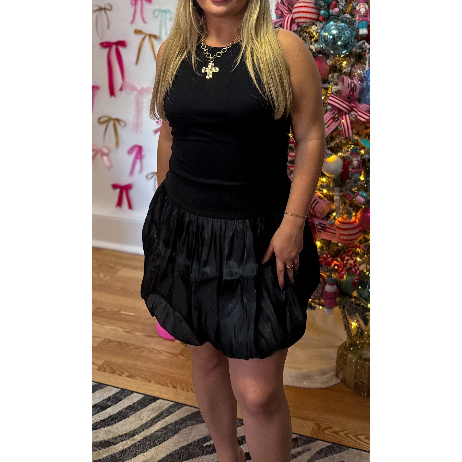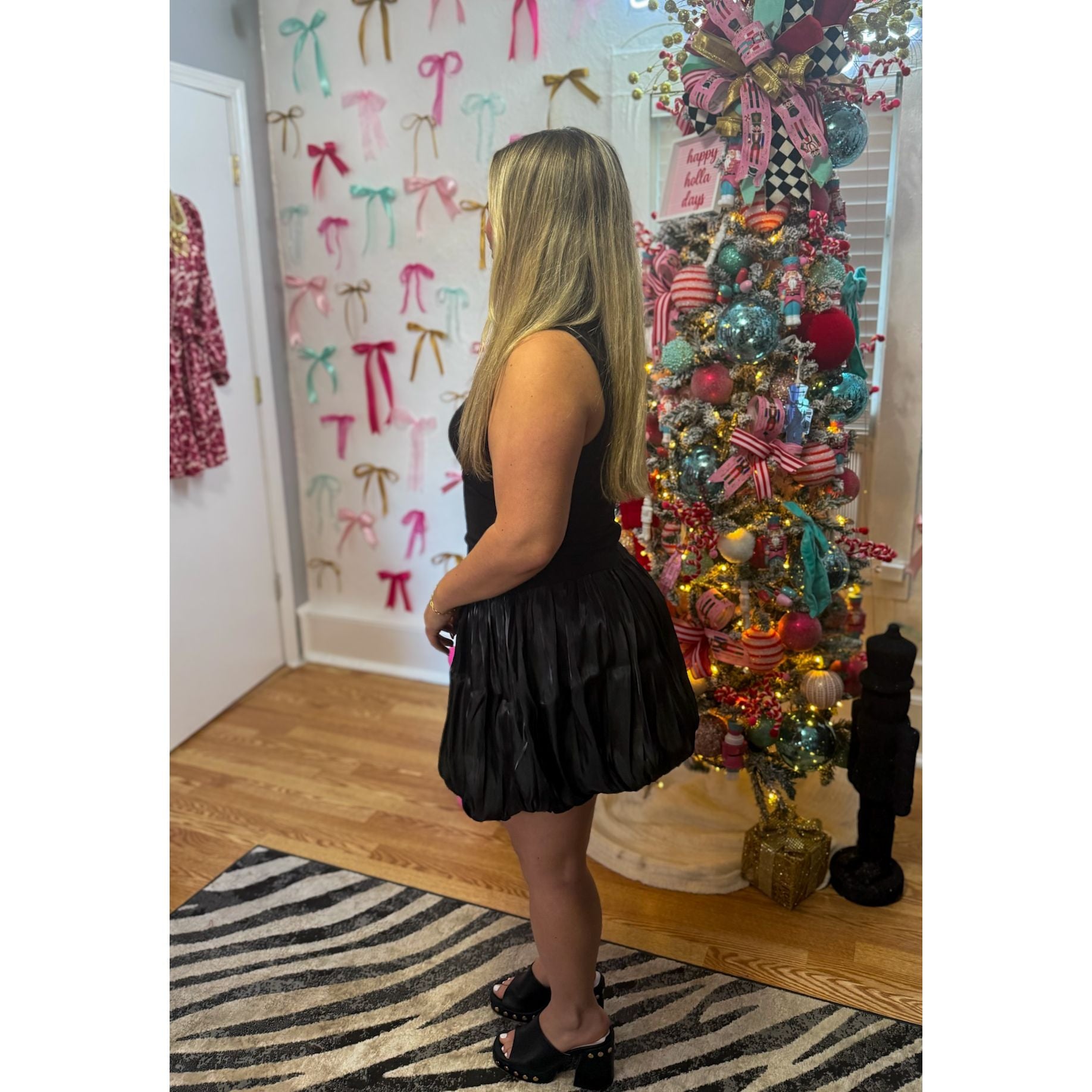 Black fitted mini dress with flares out detail along the waist of dress. Zipper closure along the back. Stretch material.