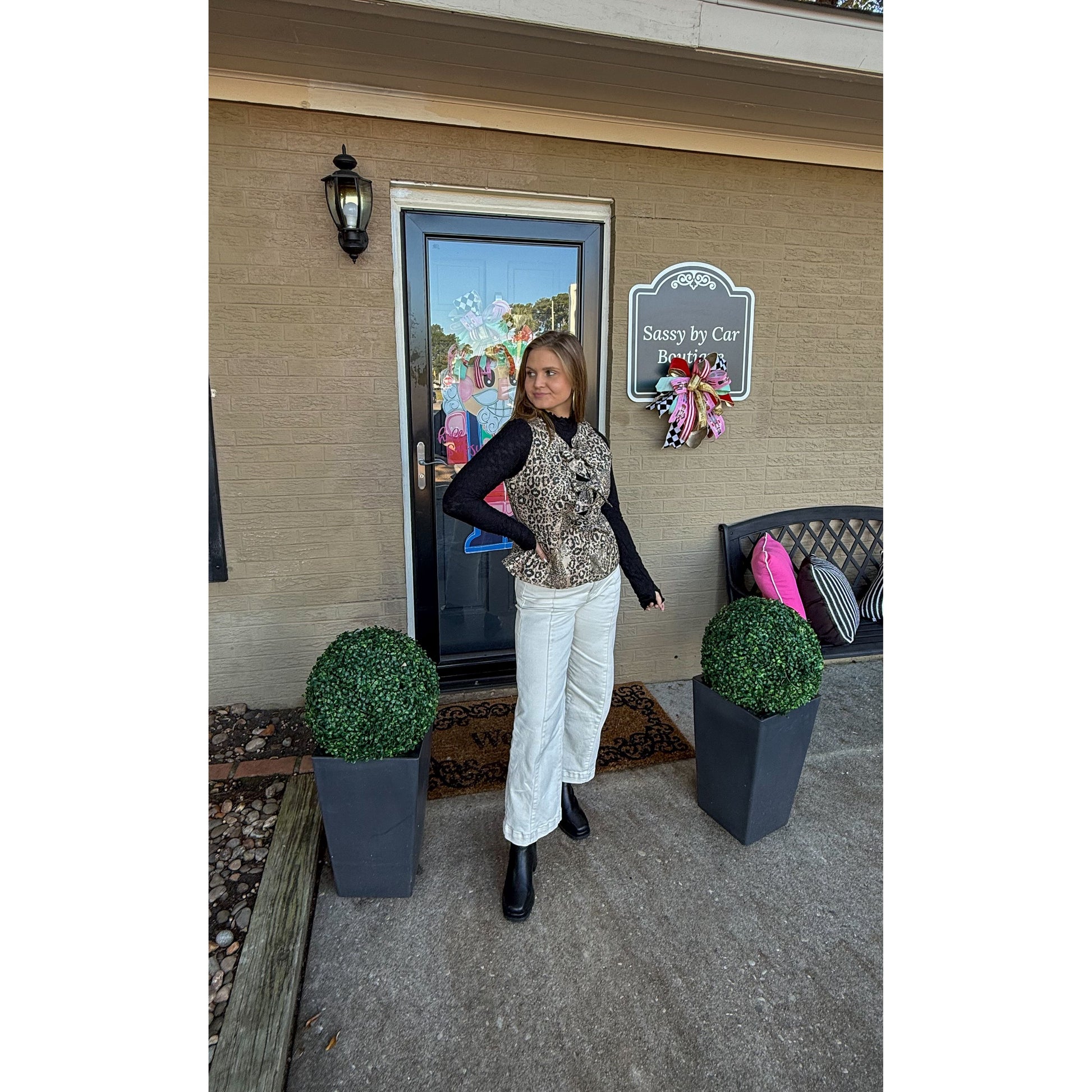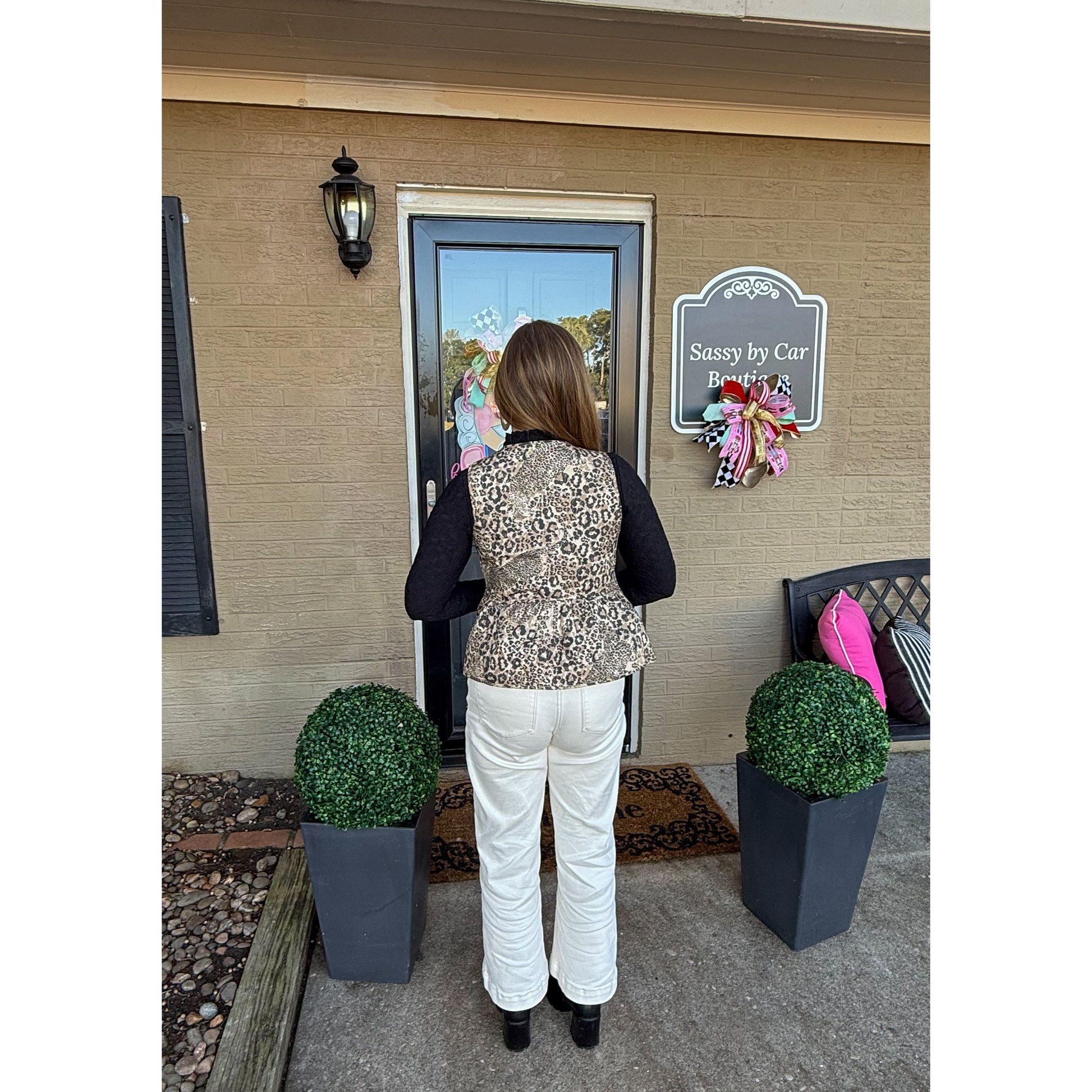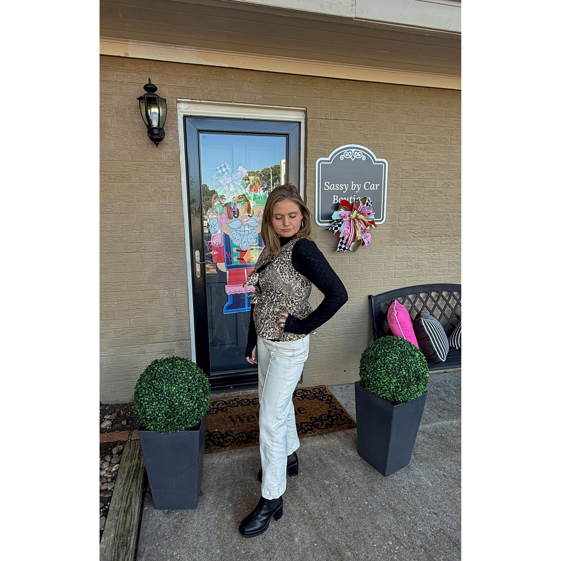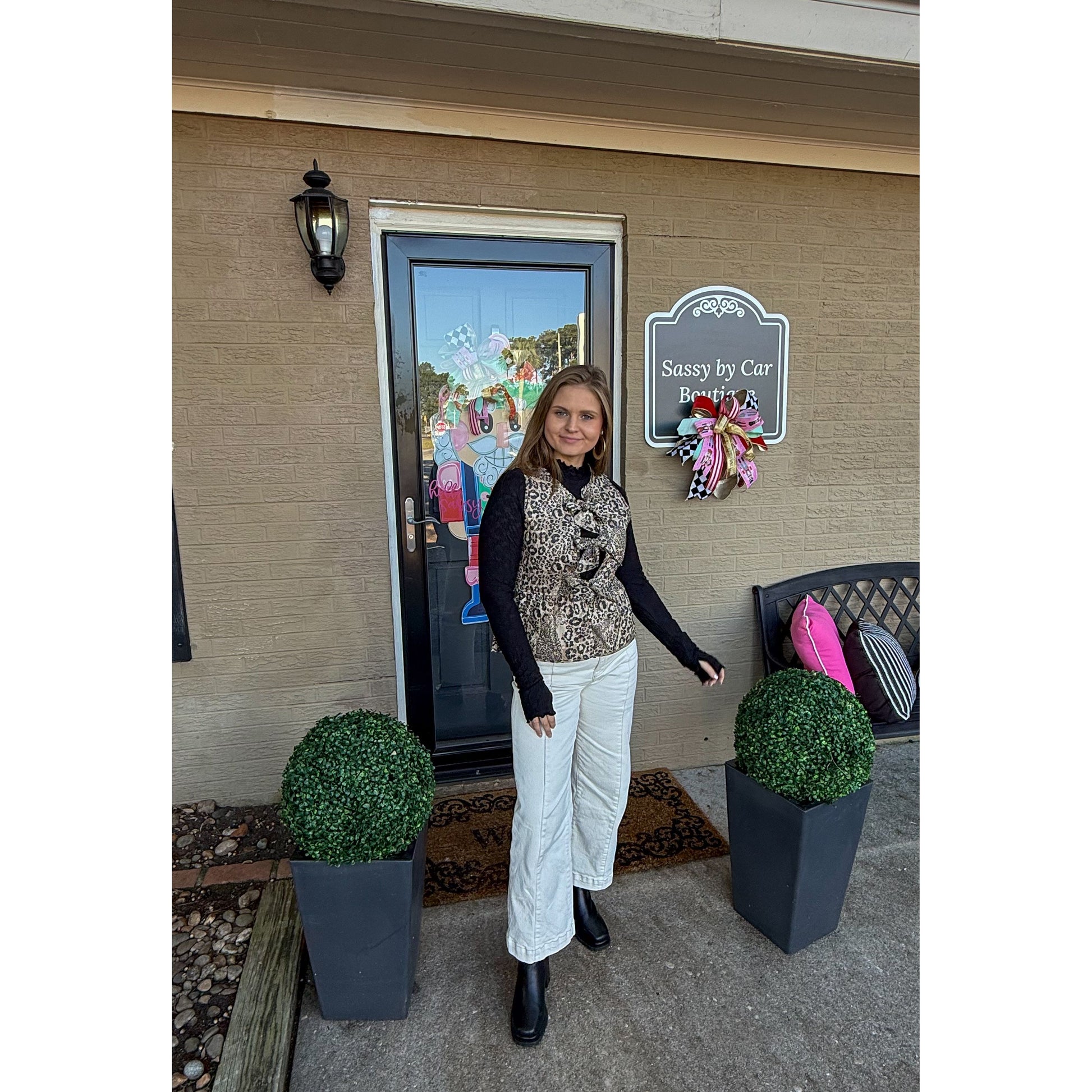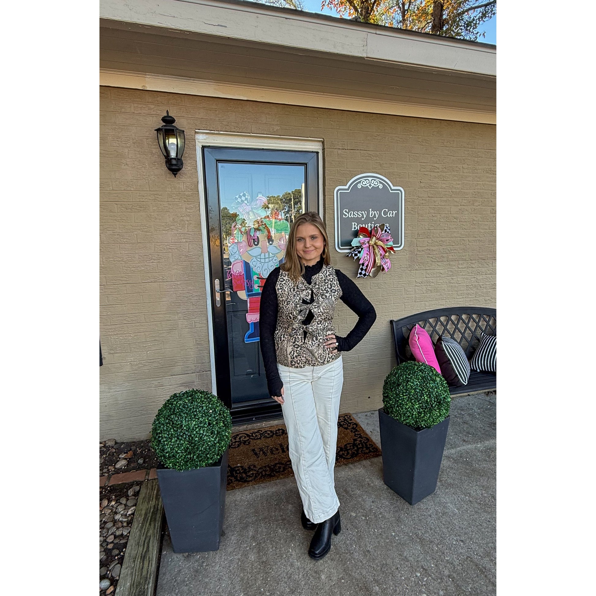 Sleeveless detail quilted puffer vest in cheetah. Three bow closure along the front.