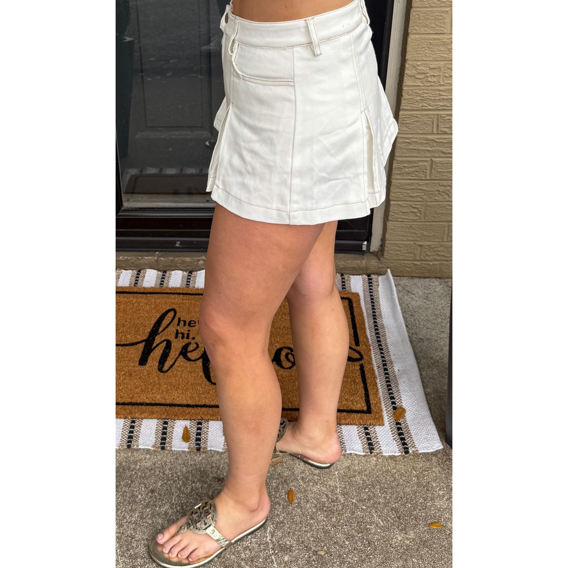 Cream denim mini skort. Pleated detail, zipper/button closure, and has pockets.