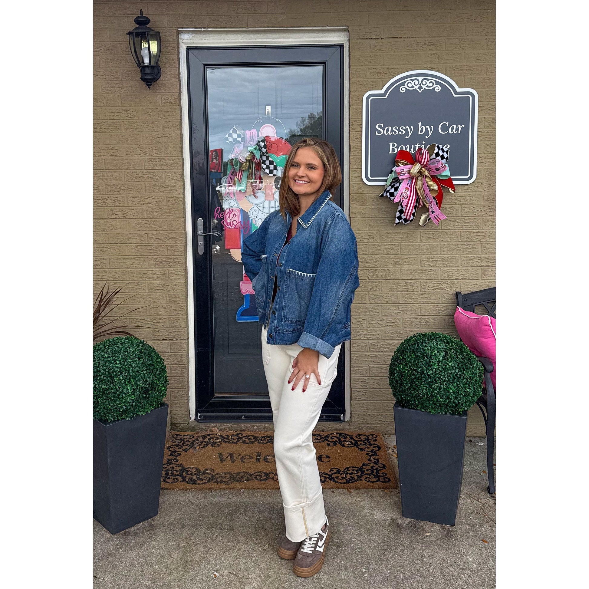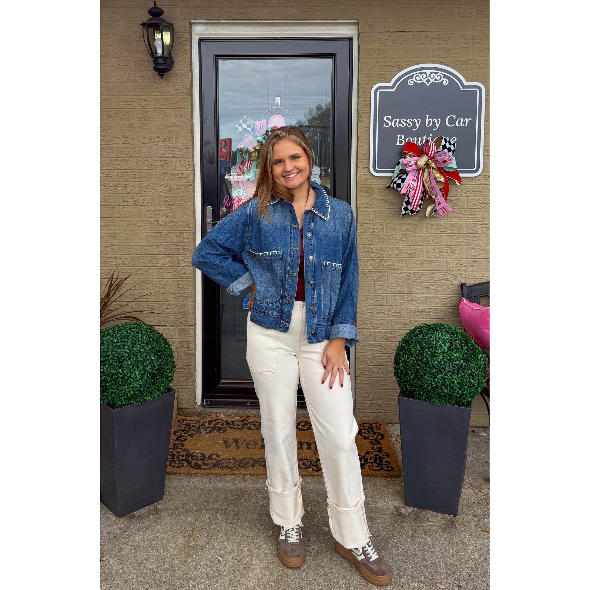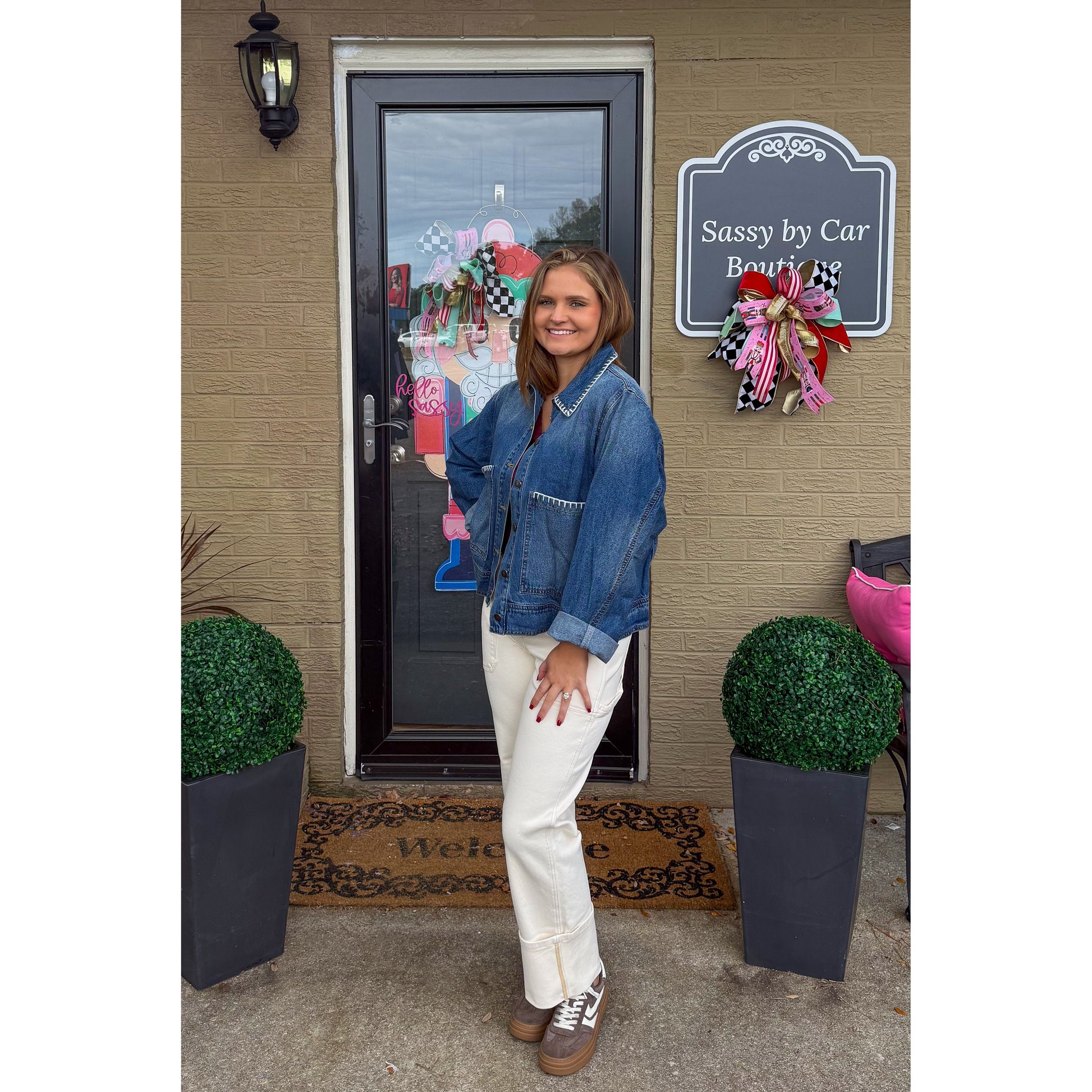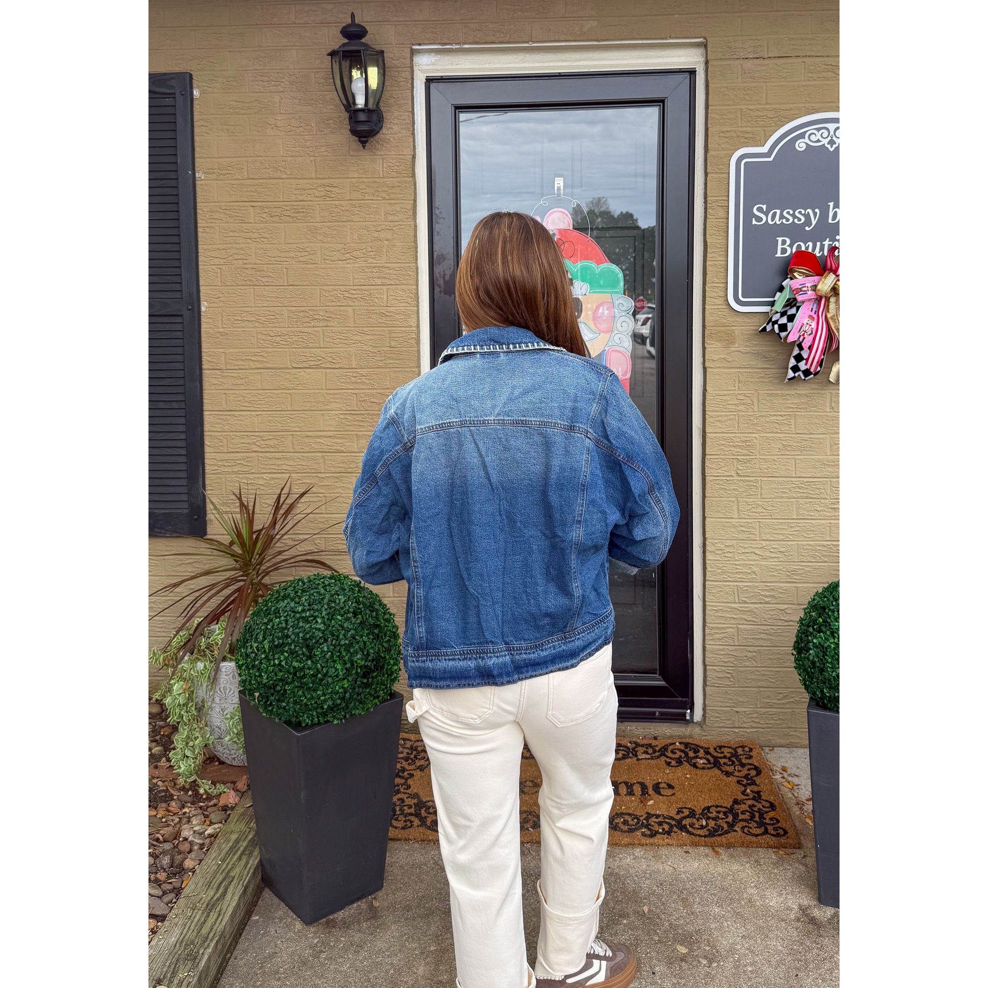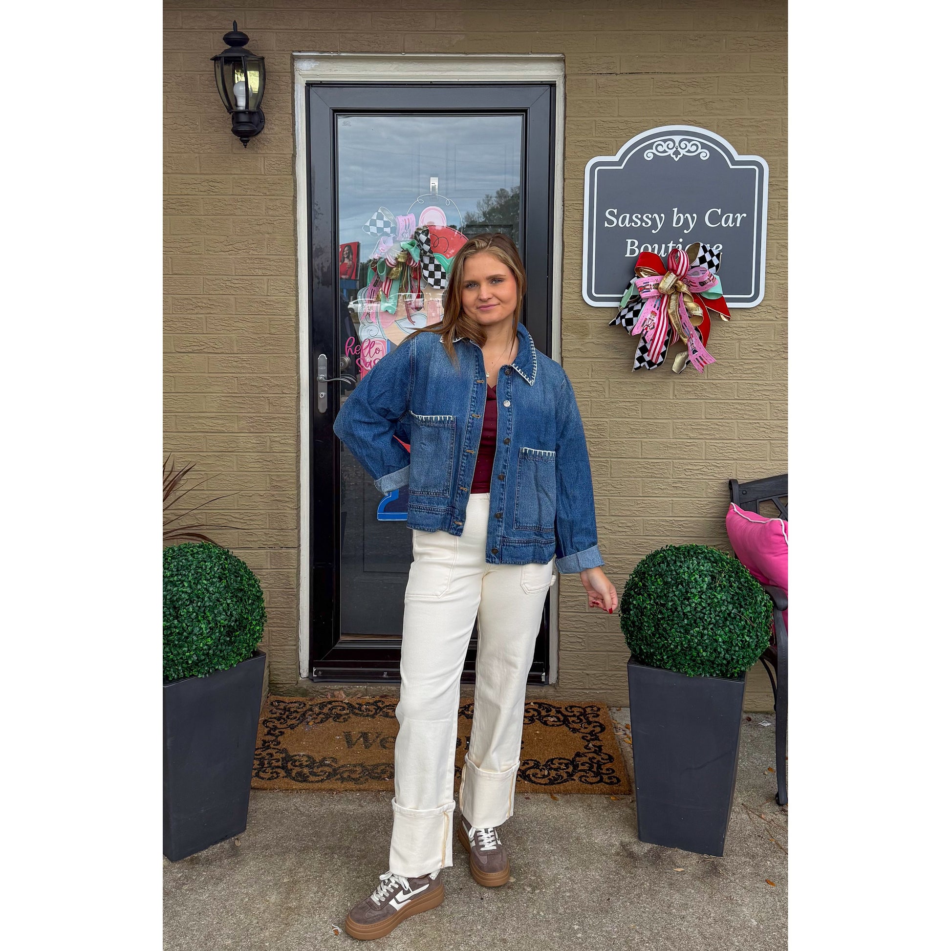 Medium wash denim jacket with white trim along the collar and pockets. Patch pockets along the front of denim jacket.
