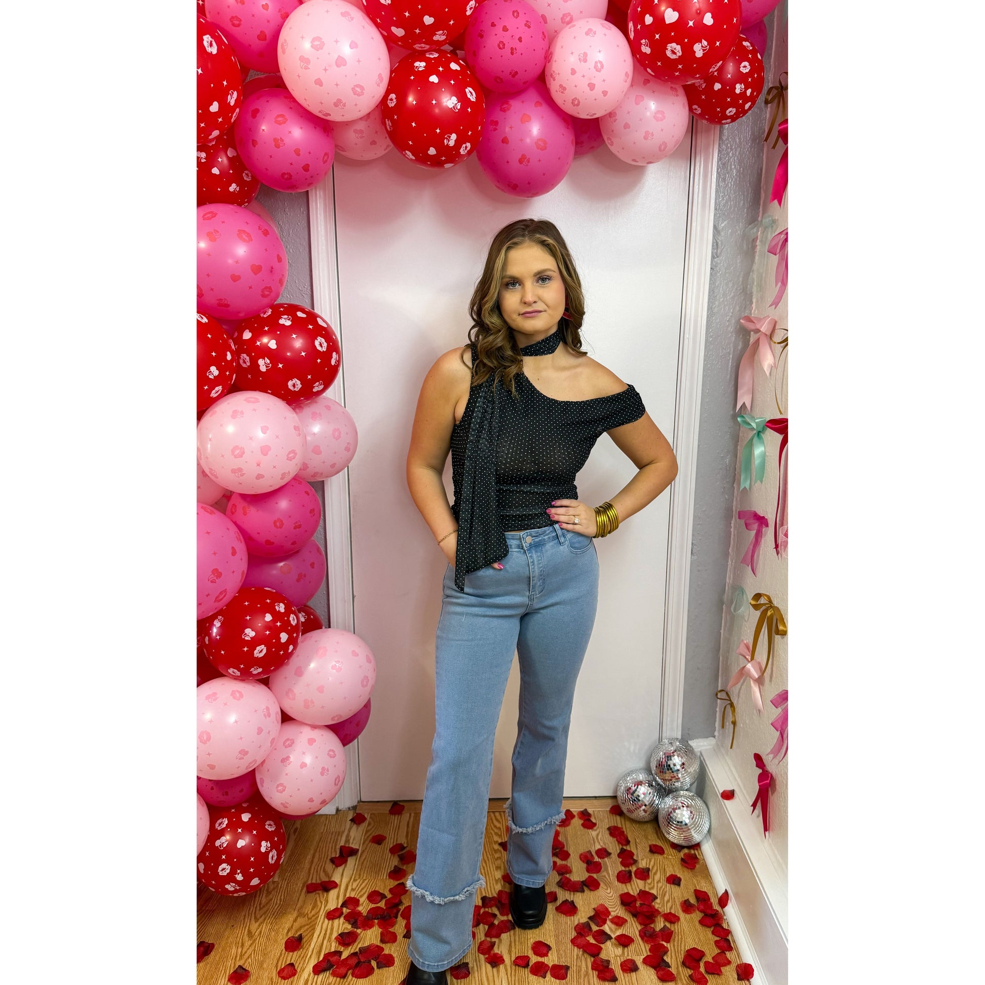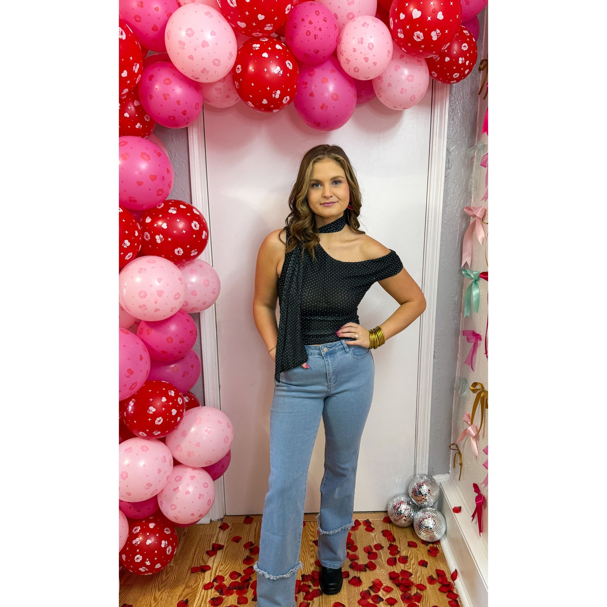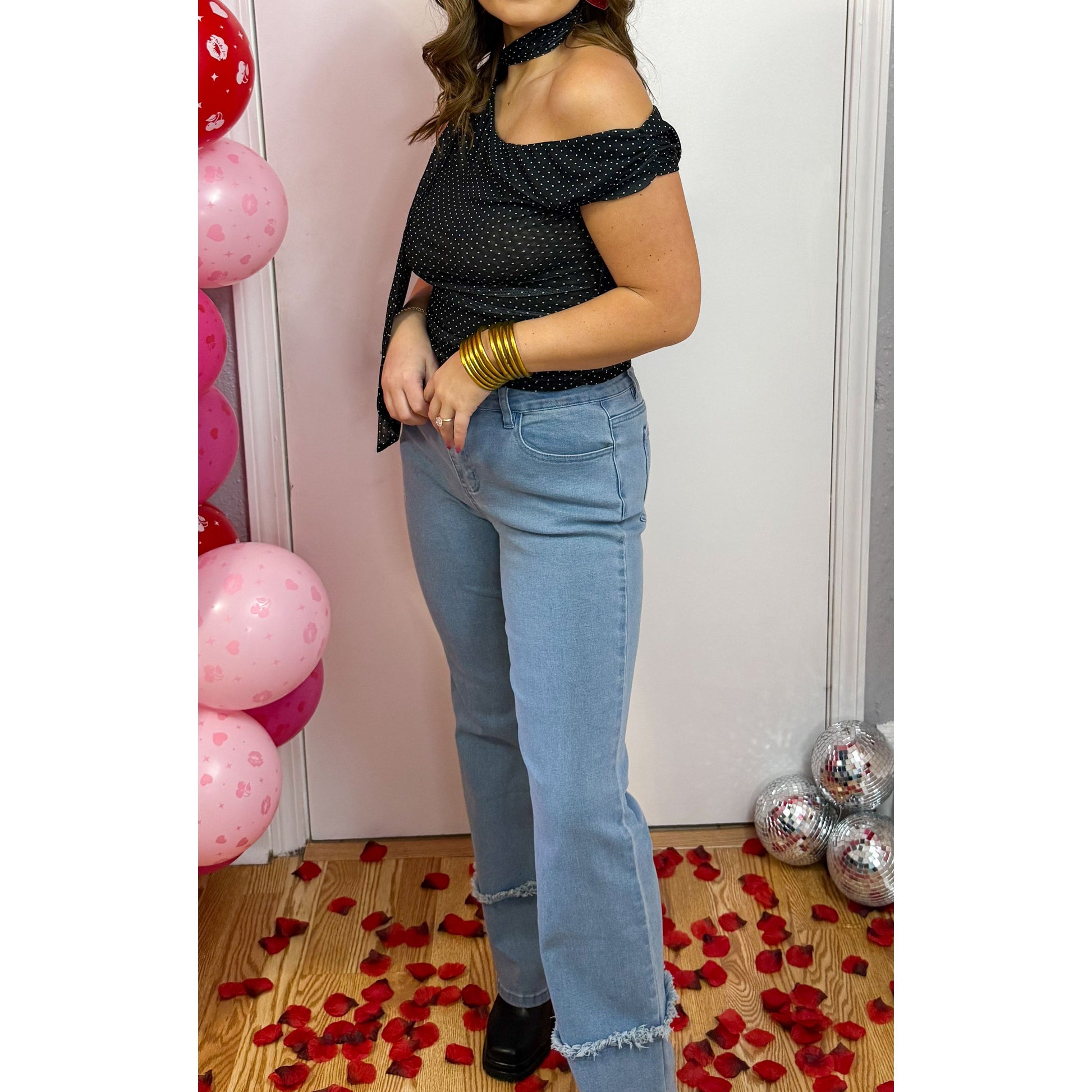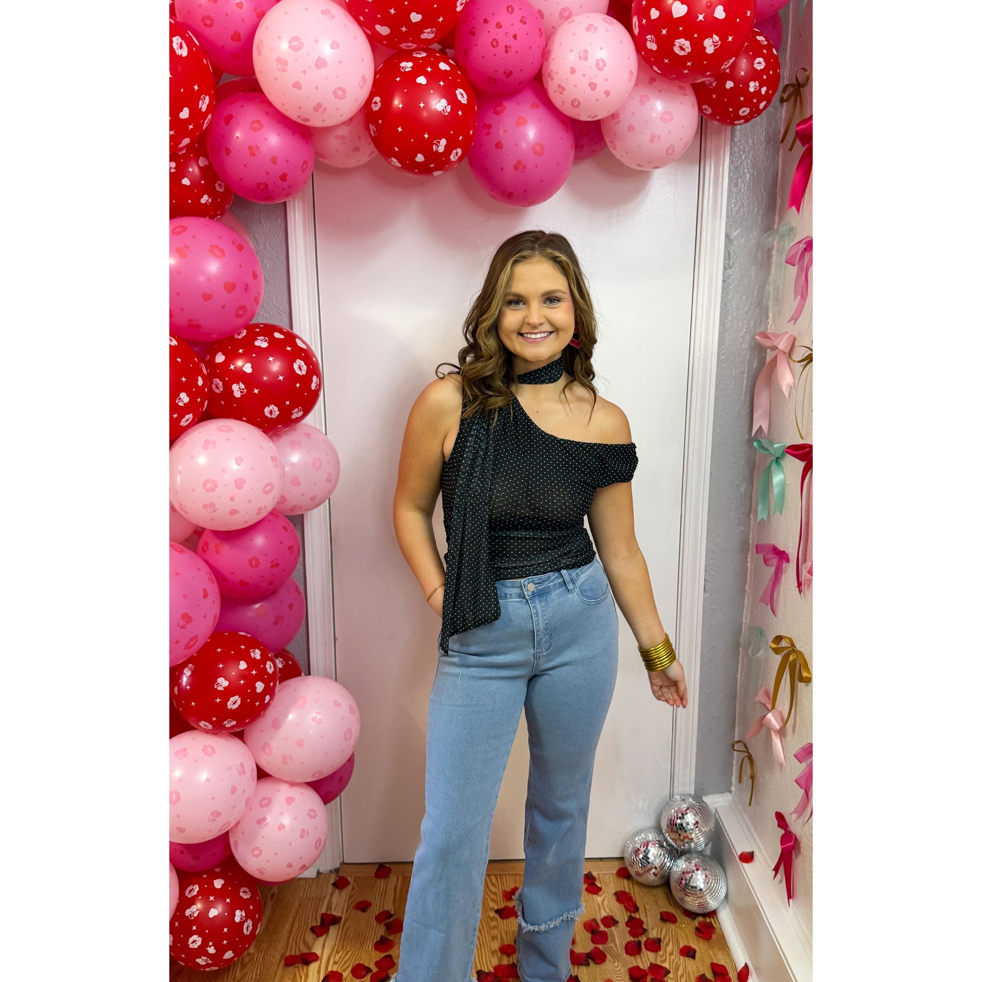 Black mesh detail top in white polka dot pattern. Asymmetrical neckline with scarf detail. Ruched detailing along the sides of top.