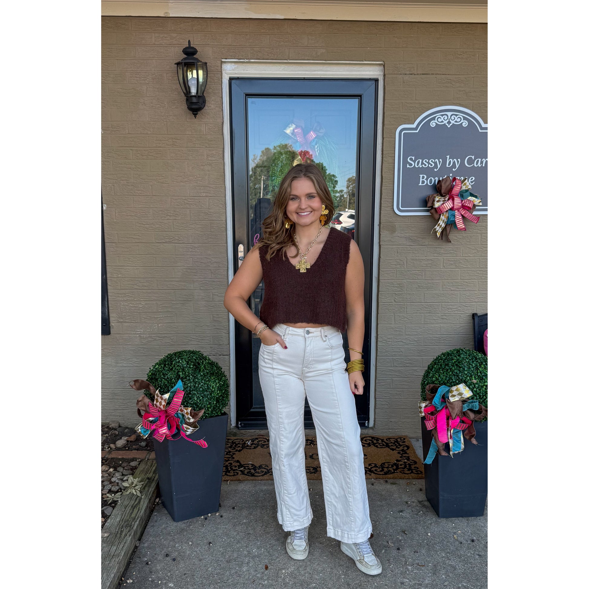 V-neck fuzzy sweater vest in espresso. Easy to wear by itself or layer.