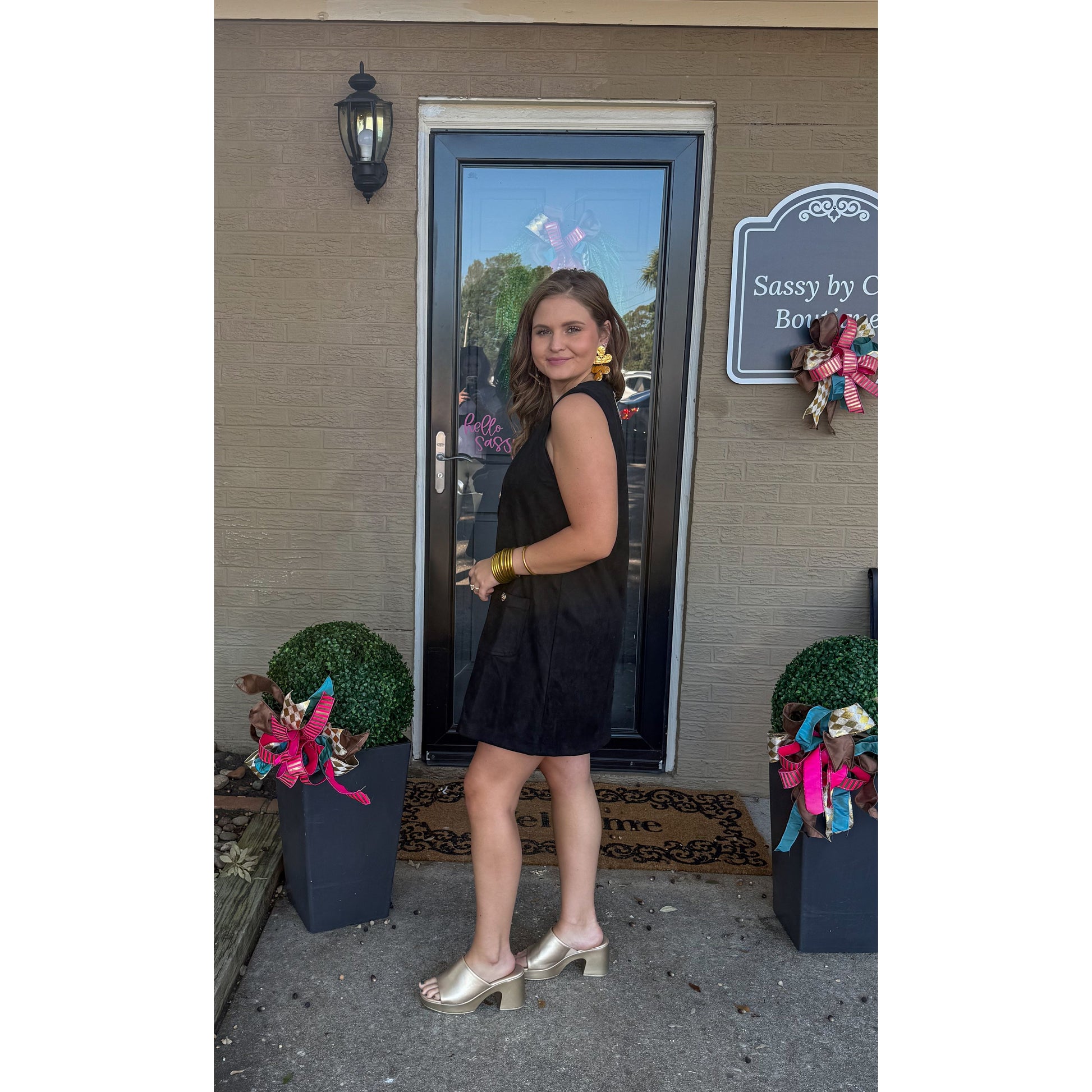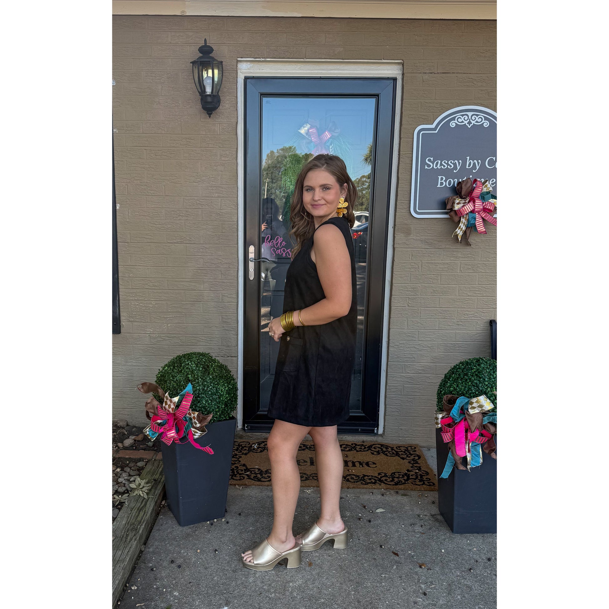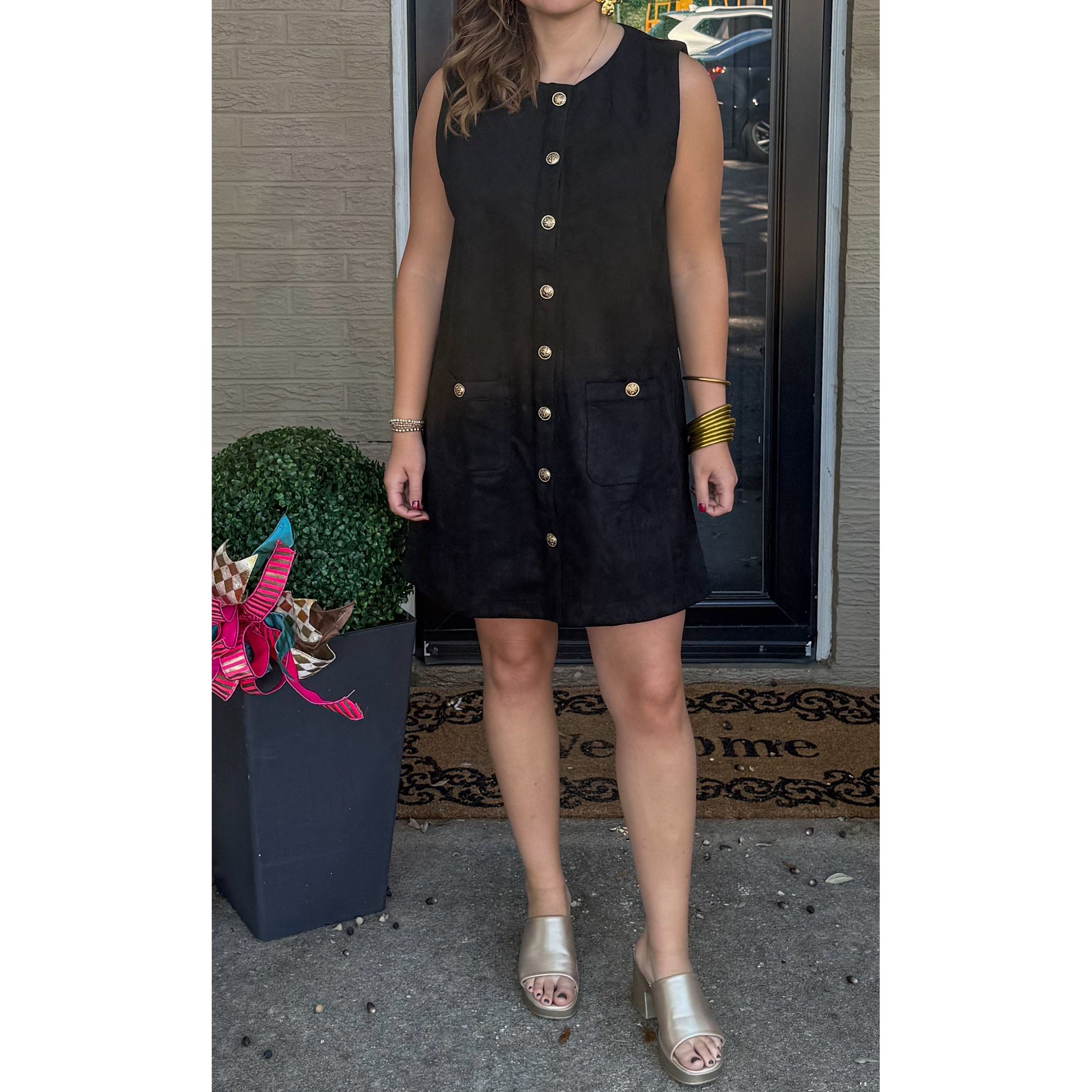 Black faux suede mini dress. Gold button closure down the dress with two front pockets.