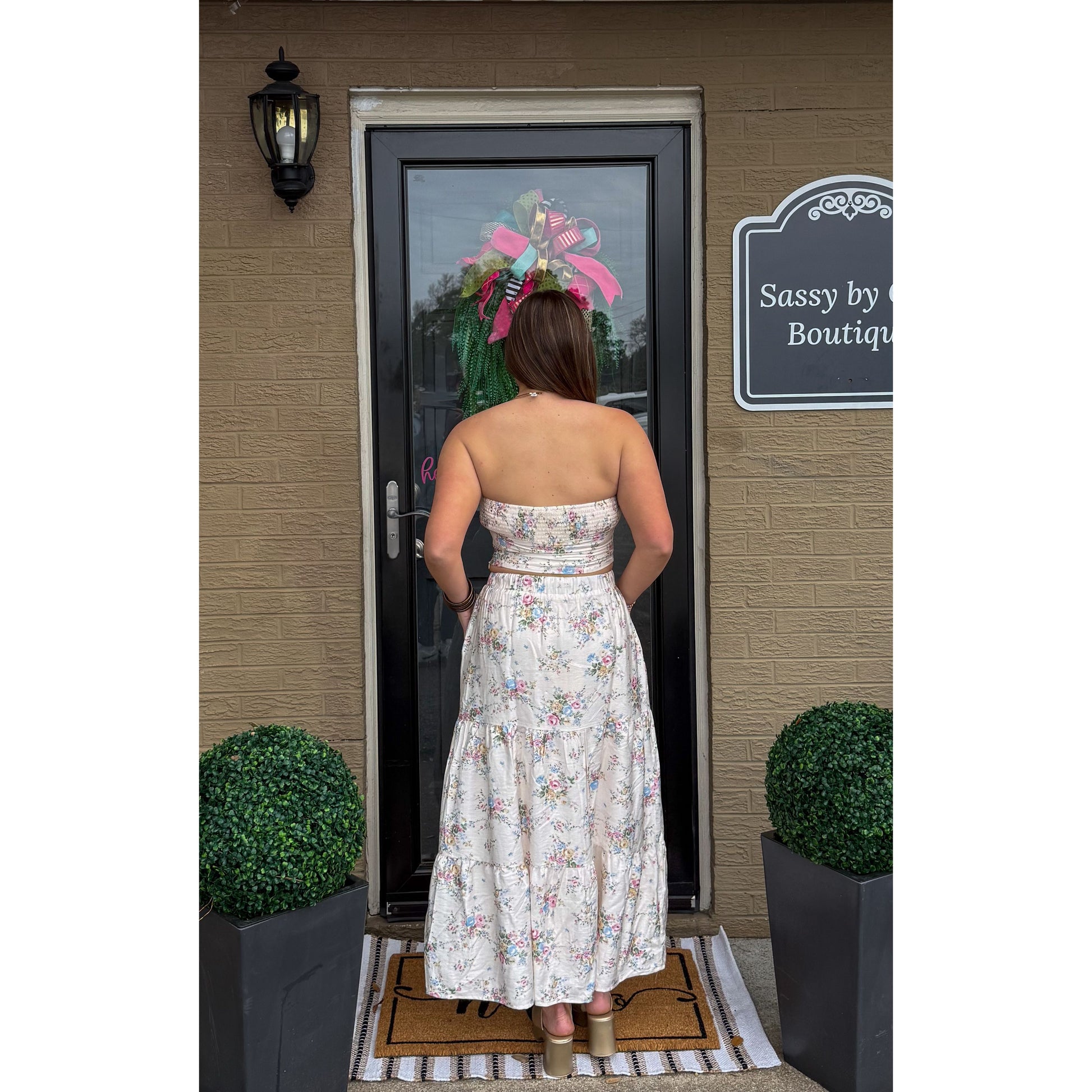 Cream multi-floral detail set - sold as a set. Tube top with zipper on the side, lace detail, smocked along the back of top, and it is fitted. Skirt is maxi, has pockets, elastic waistband, tie detail to make tighter/looser, & tiered ruffle detail.