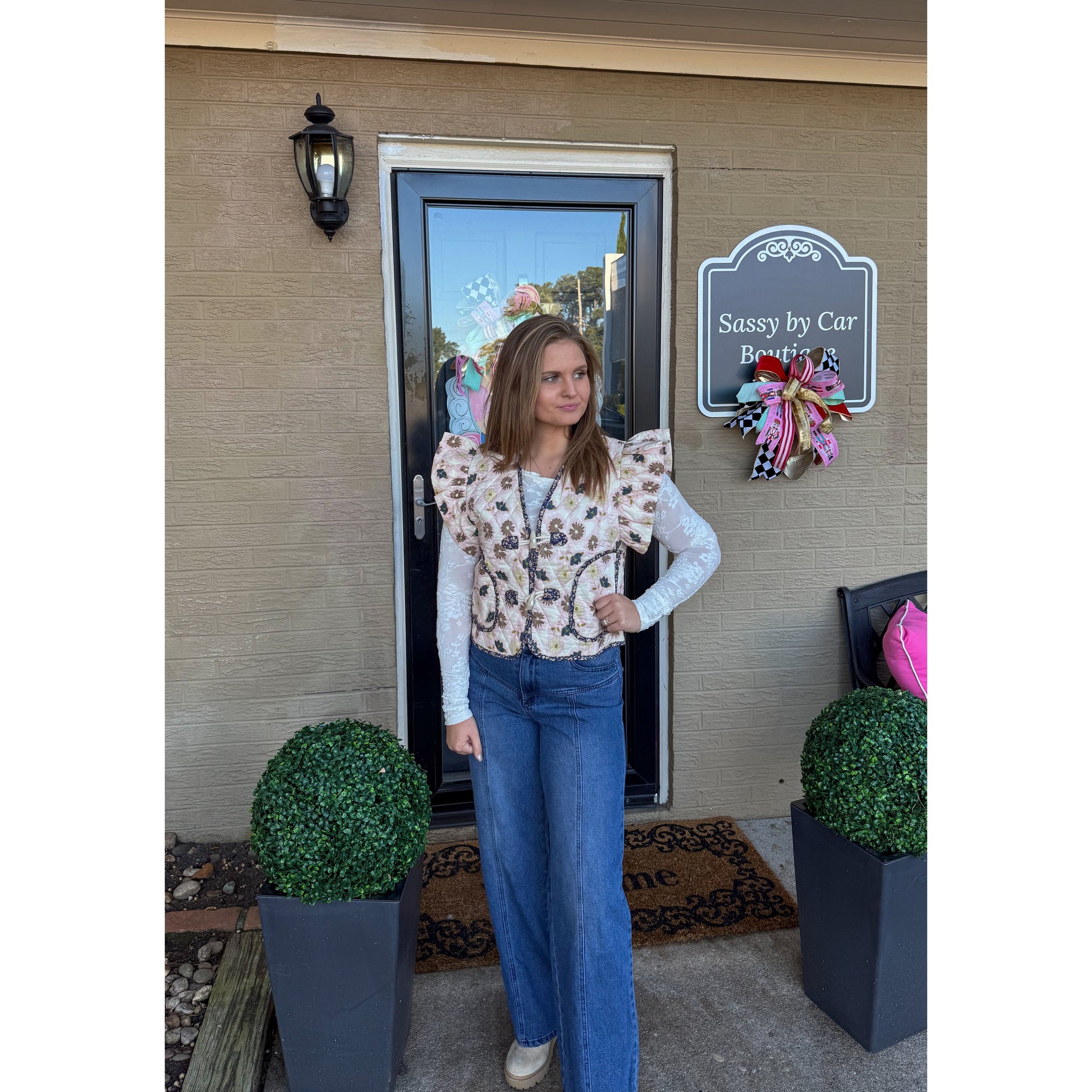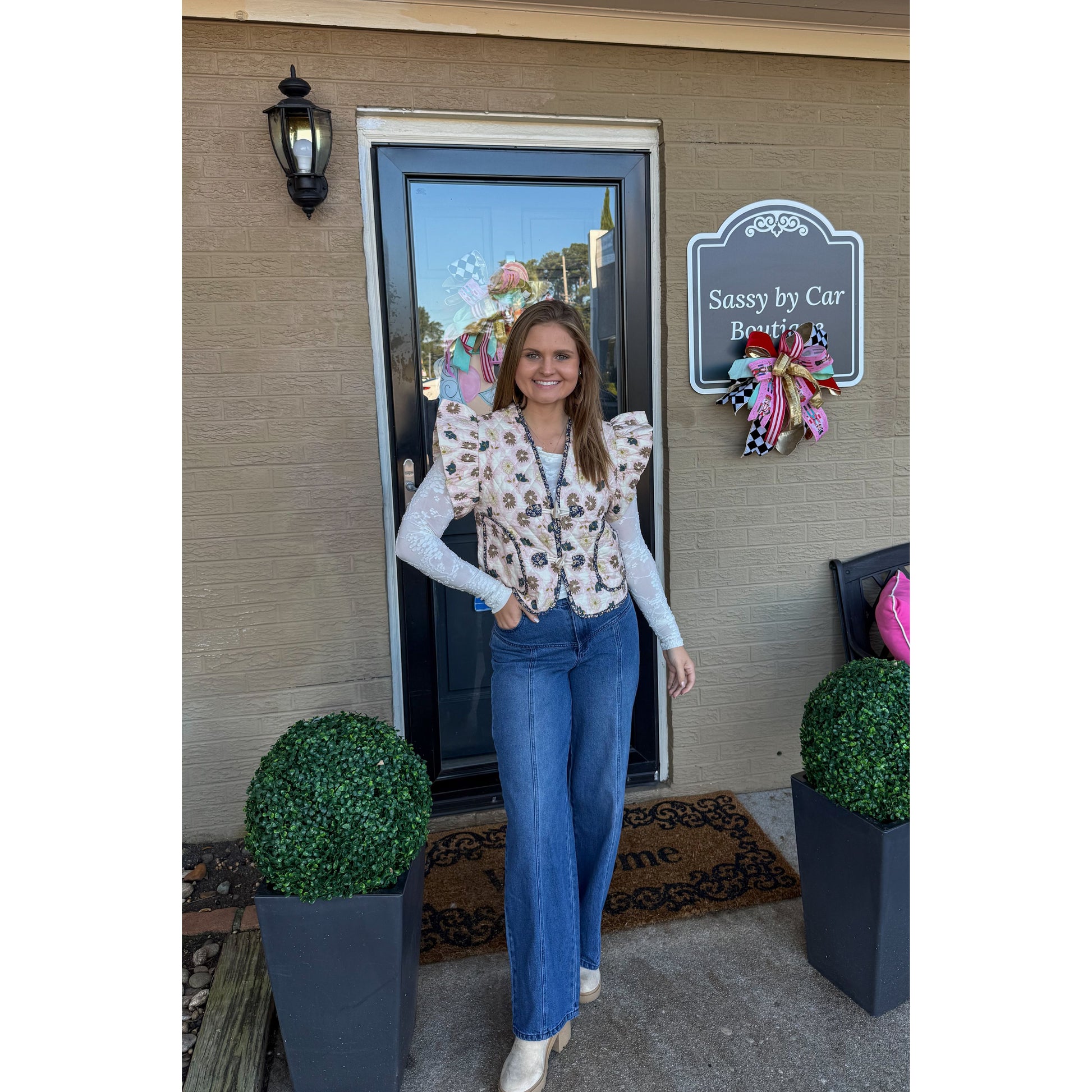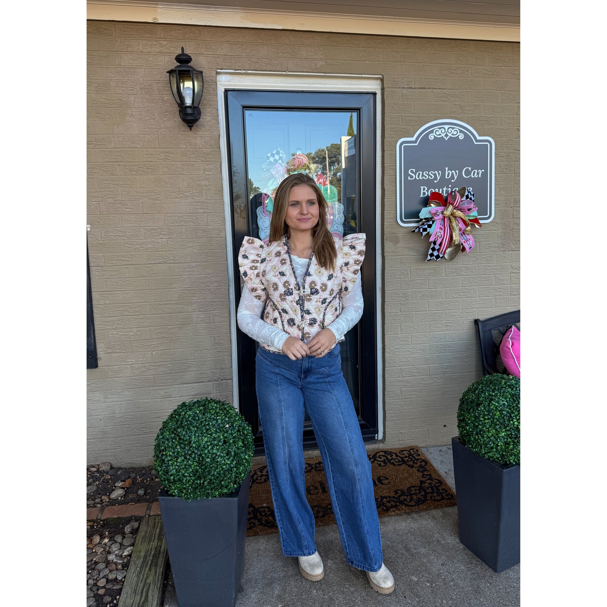Floral pattern quilted vest in pink, navy, cream, and brown. Beautiful color combo. Has closure along the front as well as pockets.