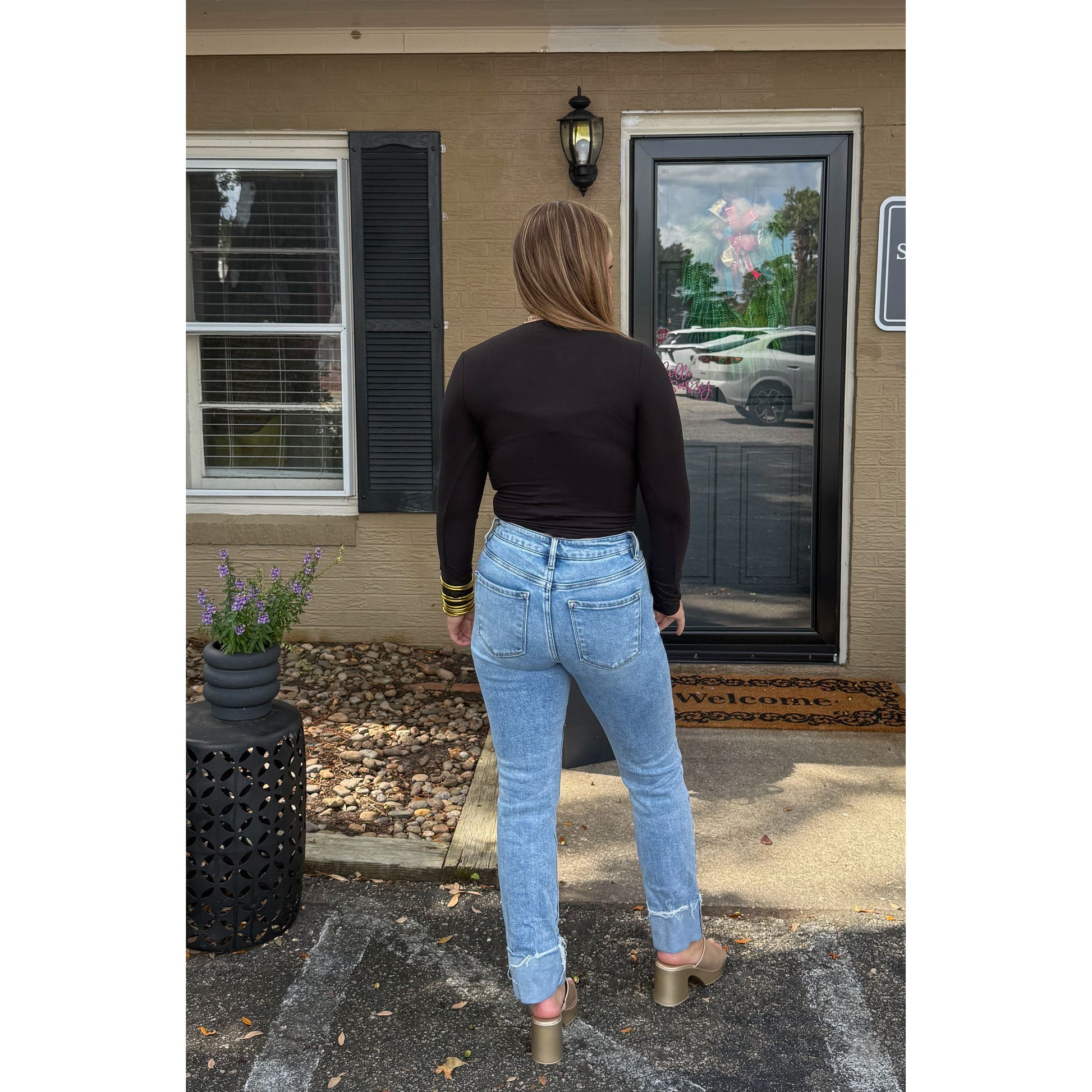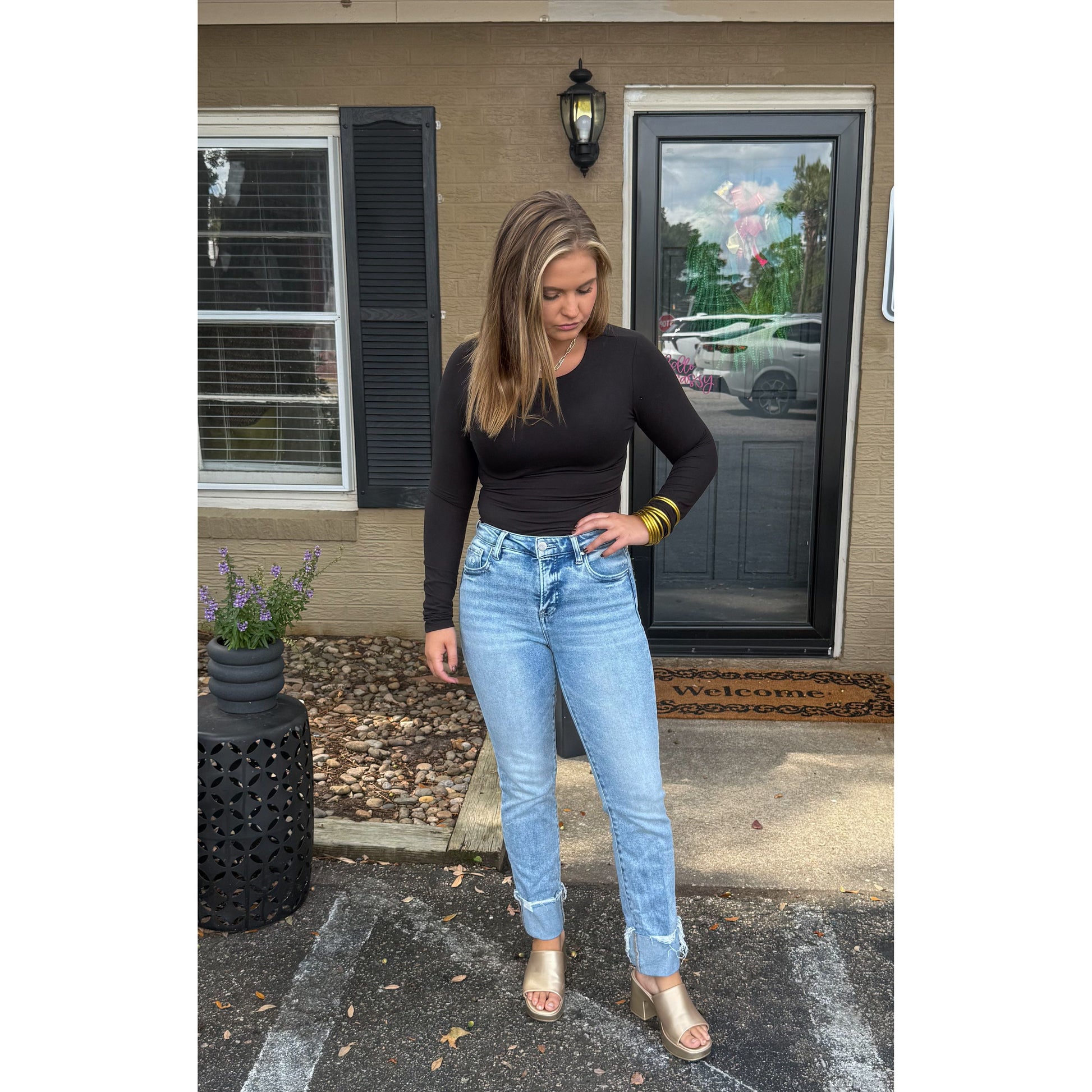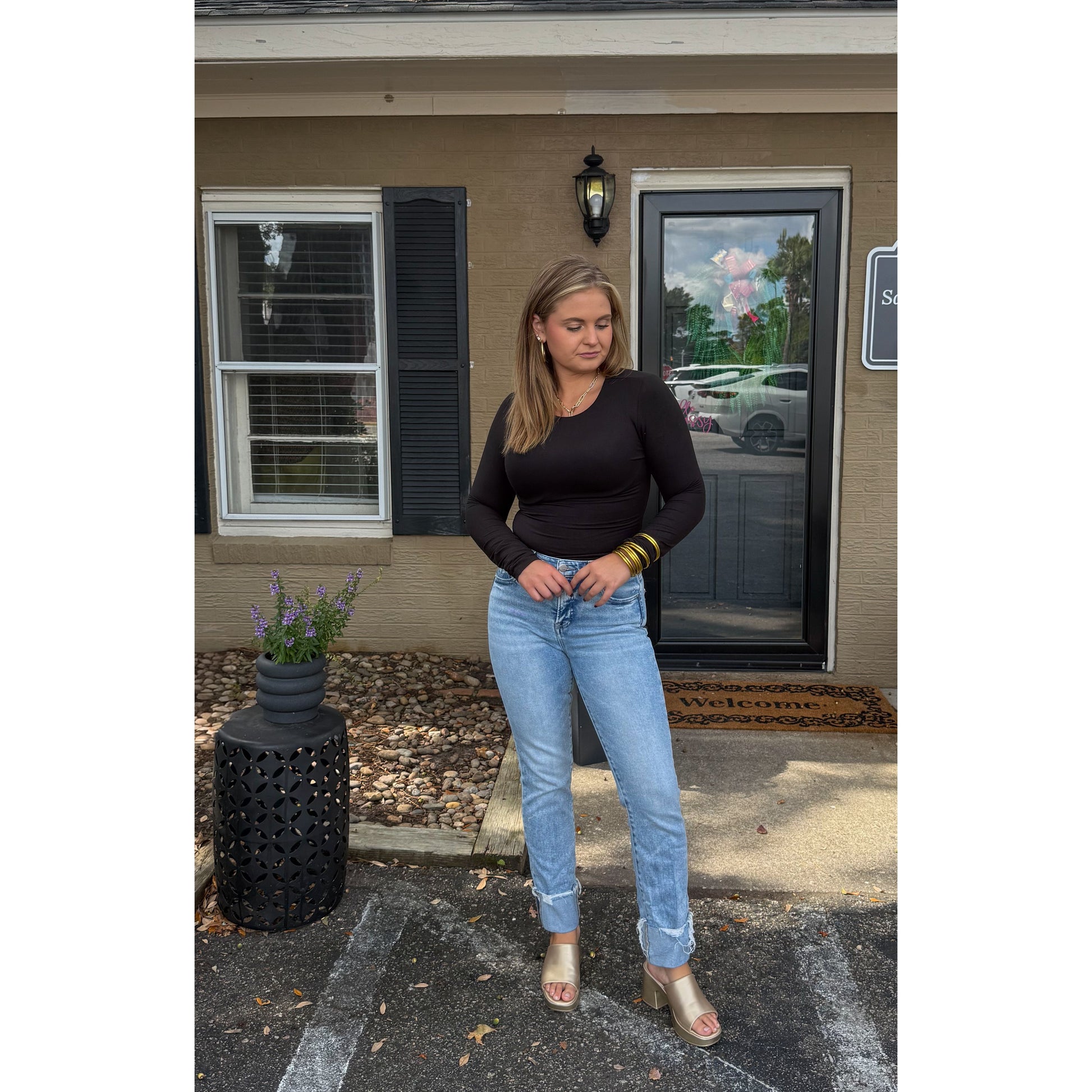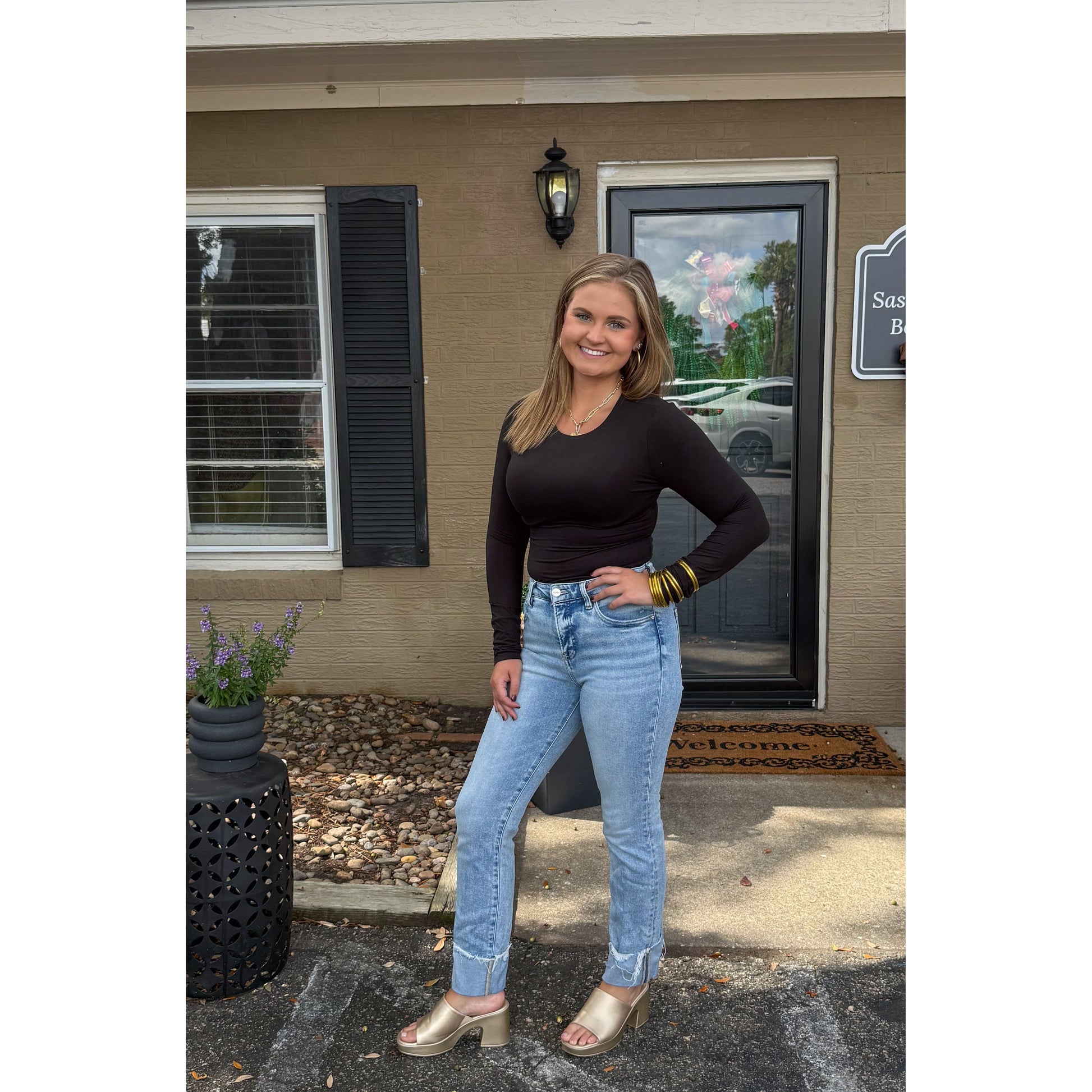 A staple that you have to have! Black fitted bodysuit with scoop neckline. Seamless material.