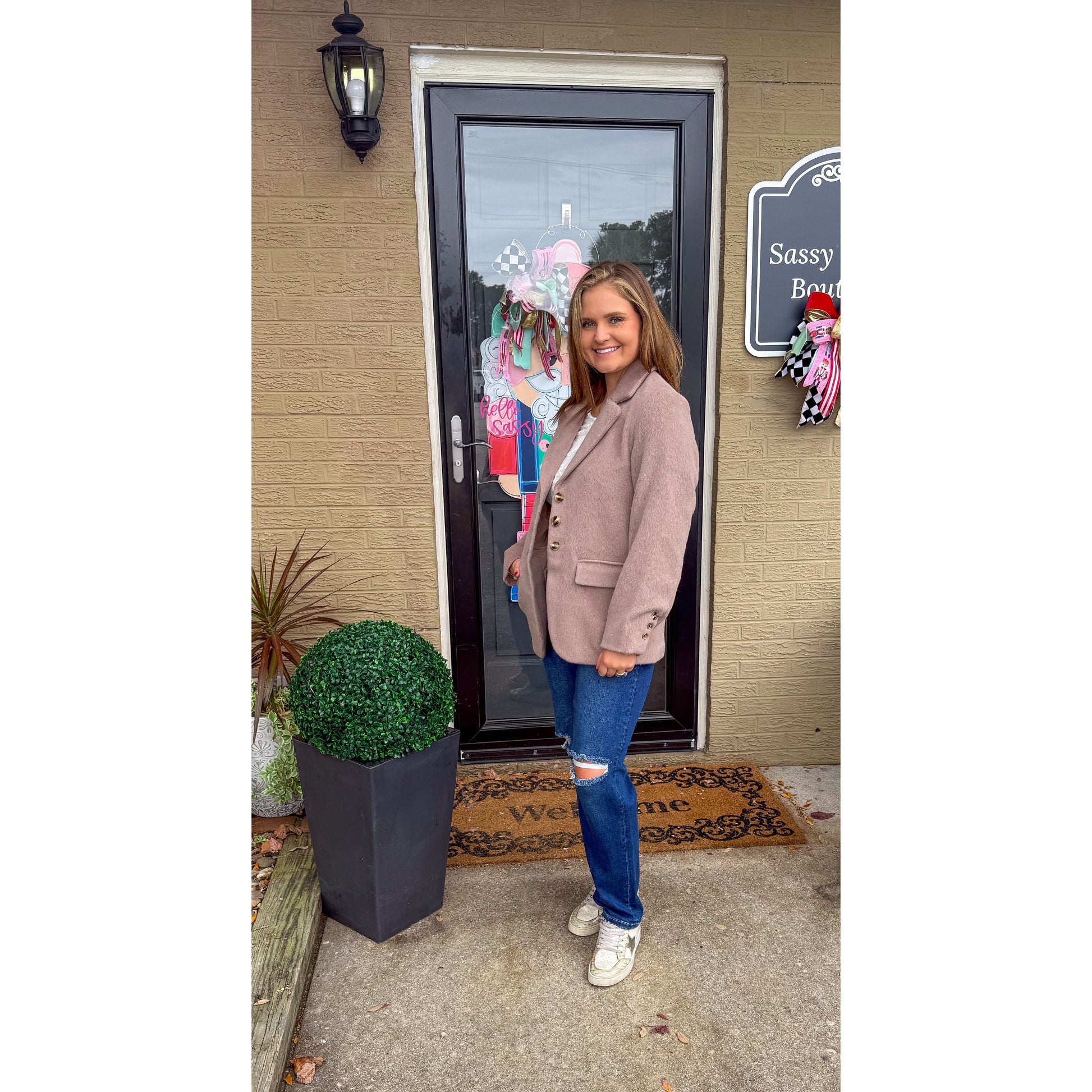 Mocha super soft blazer with button detail and pockets on the front.