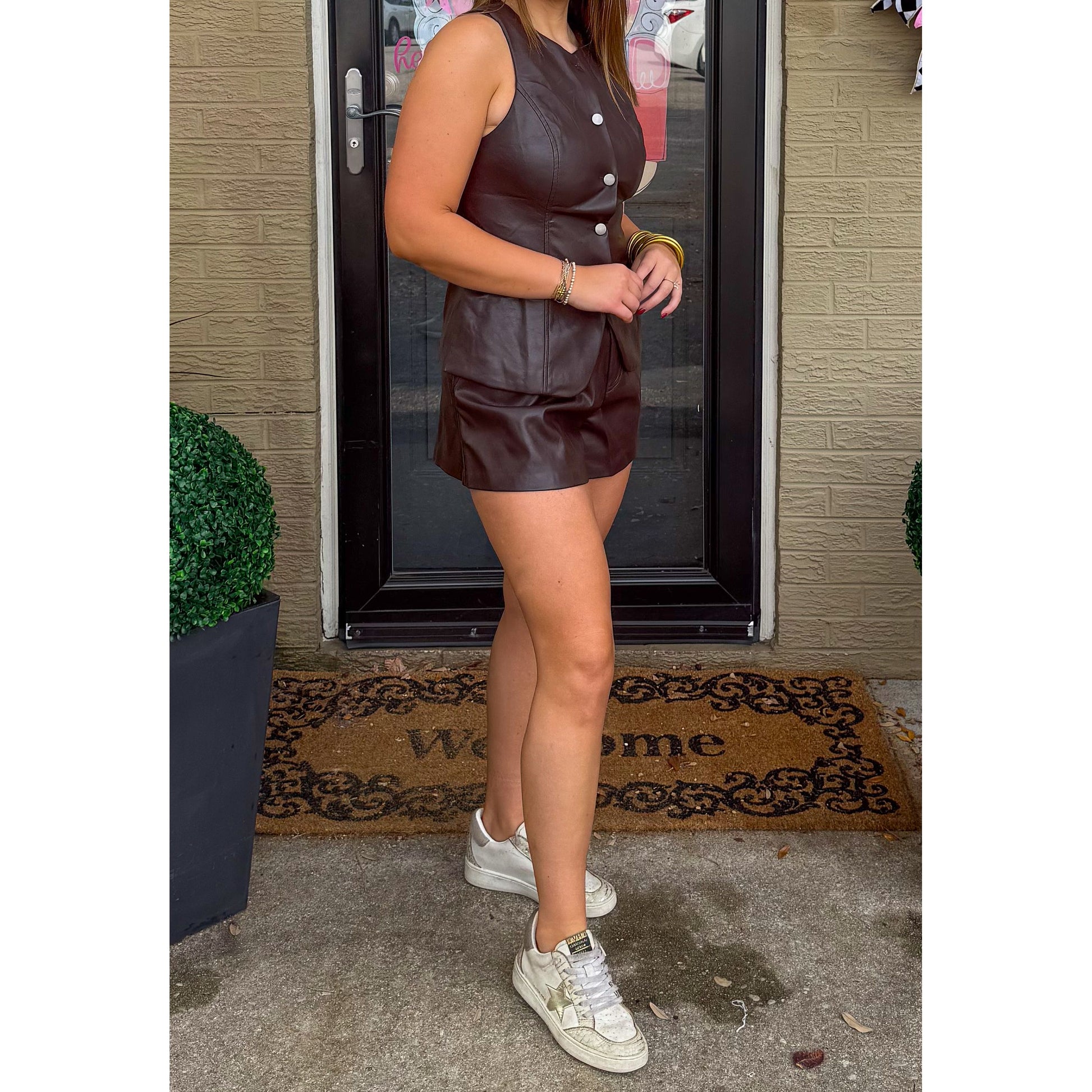 Faux leather set. Top is sleeveless with button down detail. Matching shorts have zipper and button closure. Pockets in shorts.