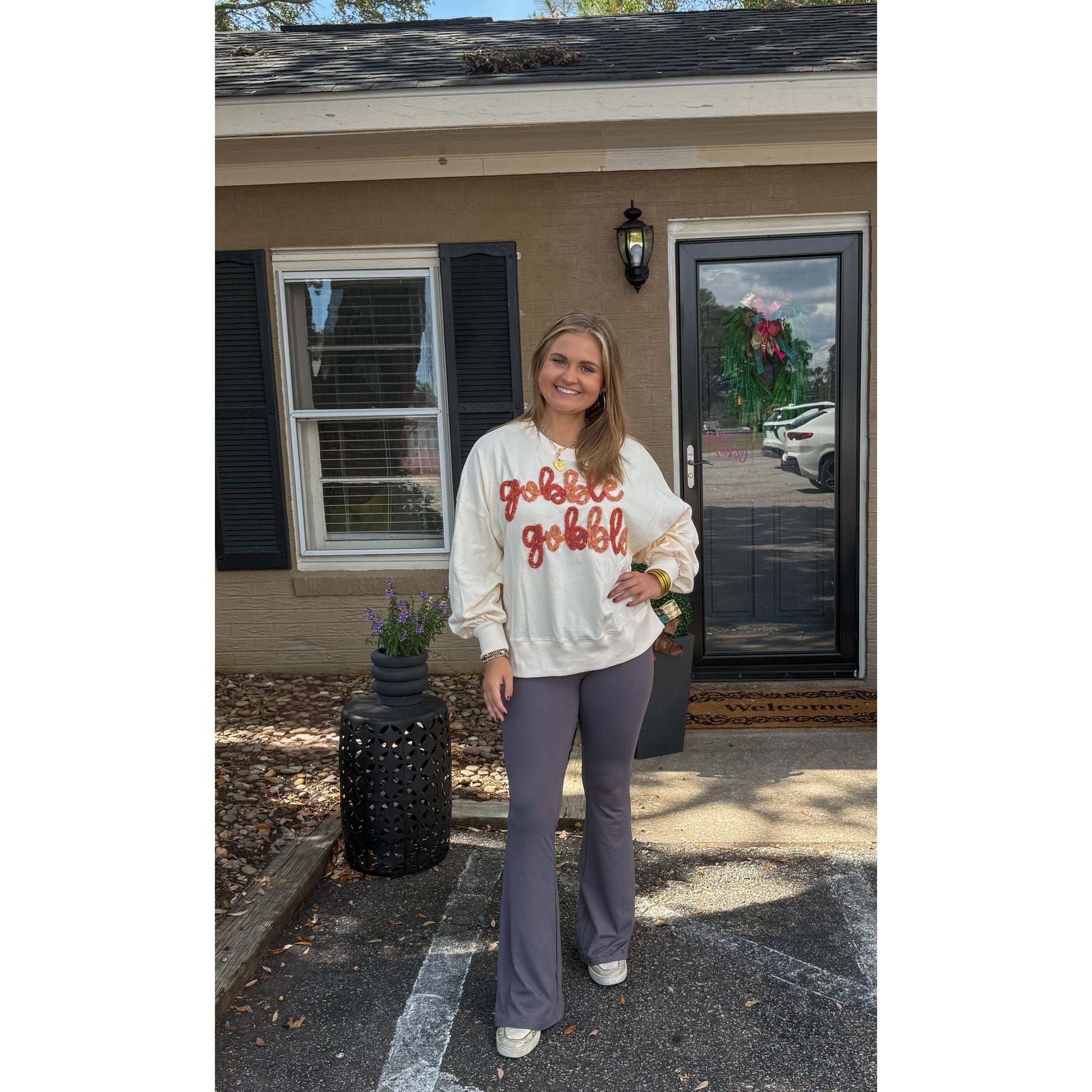Ivory oversized top. Long sleeve with balloon sleeve detail. It is lightweight. Gobble gobble pom pom detail in shades of red and orange on the front of top. If you usually wear an XL, you can wear the L in this top.