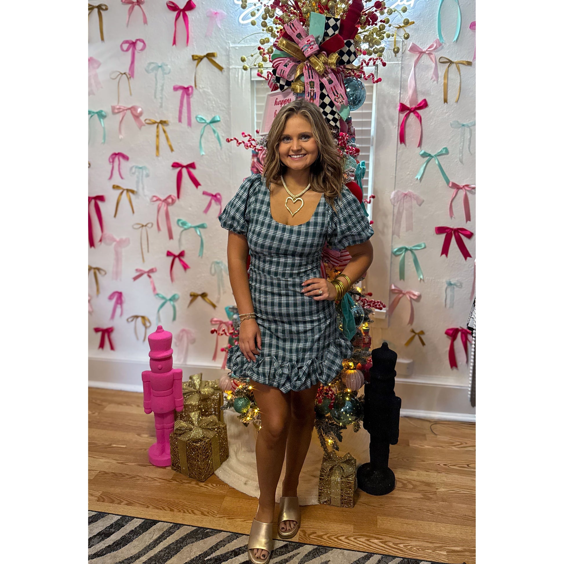 Hunter green/white plaid mini dress with puff sleeves, scoop neckline, fitted, and ruffle hemline along the detail of dress with zipper closure.