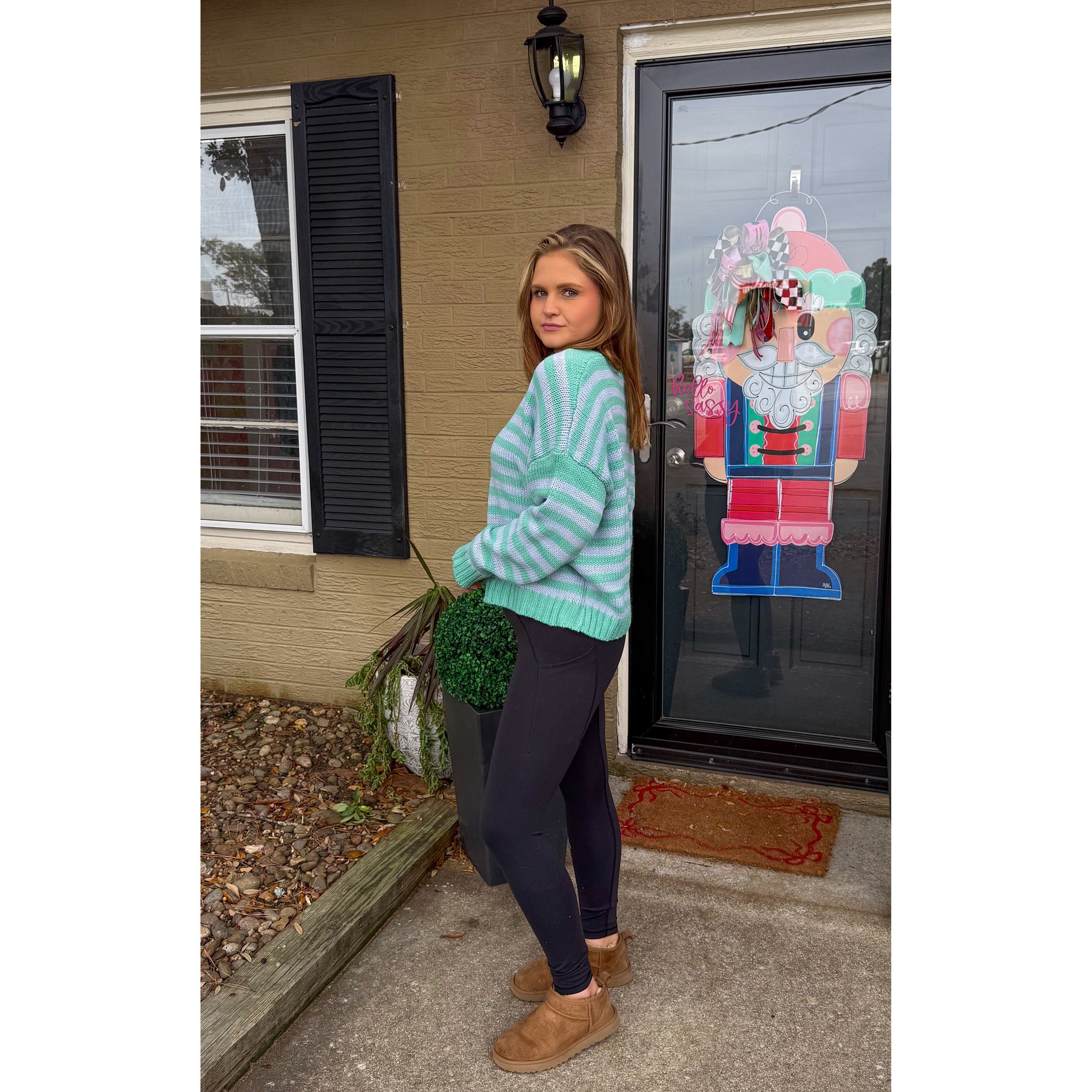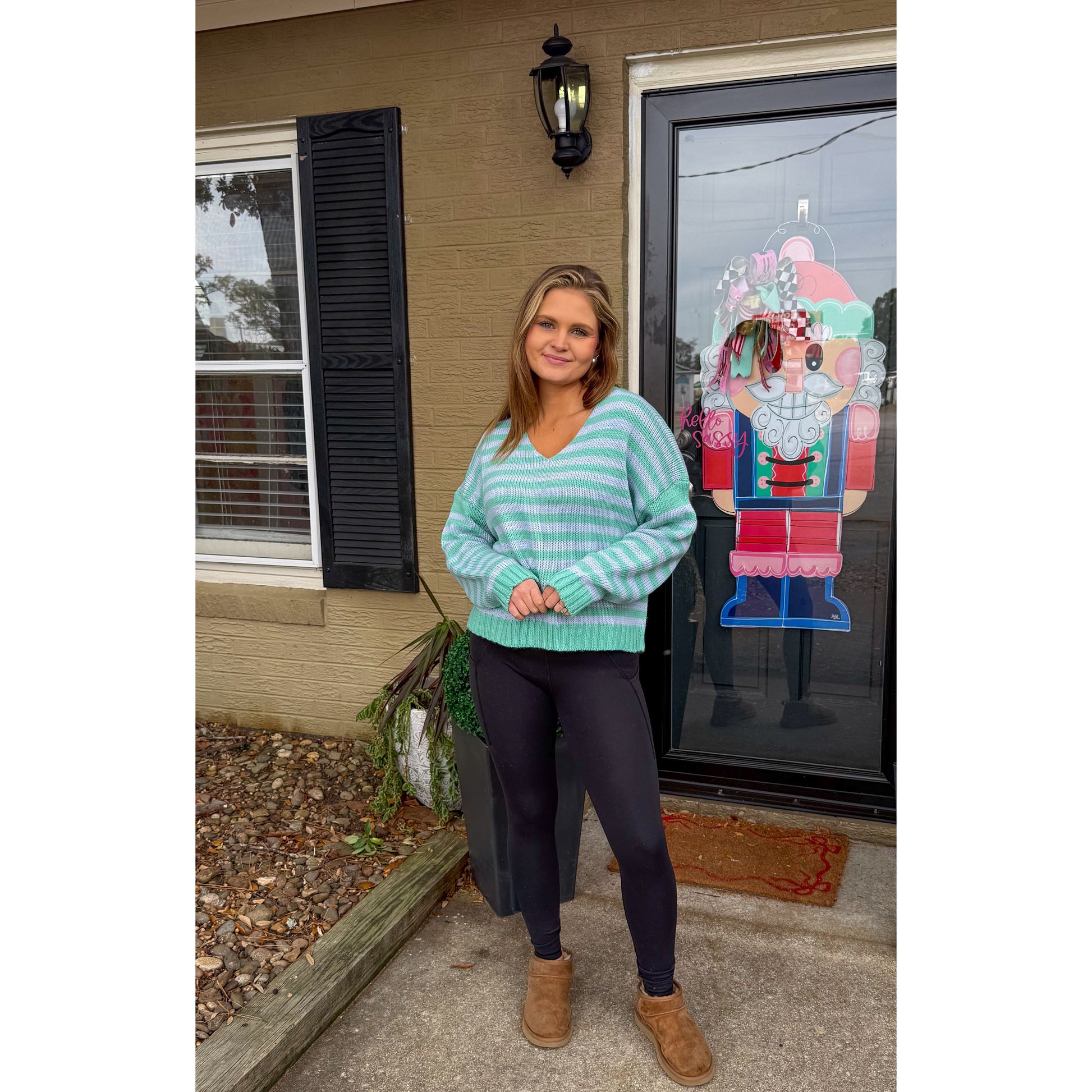 Aqua/blue stripe sweater with v-neckline.