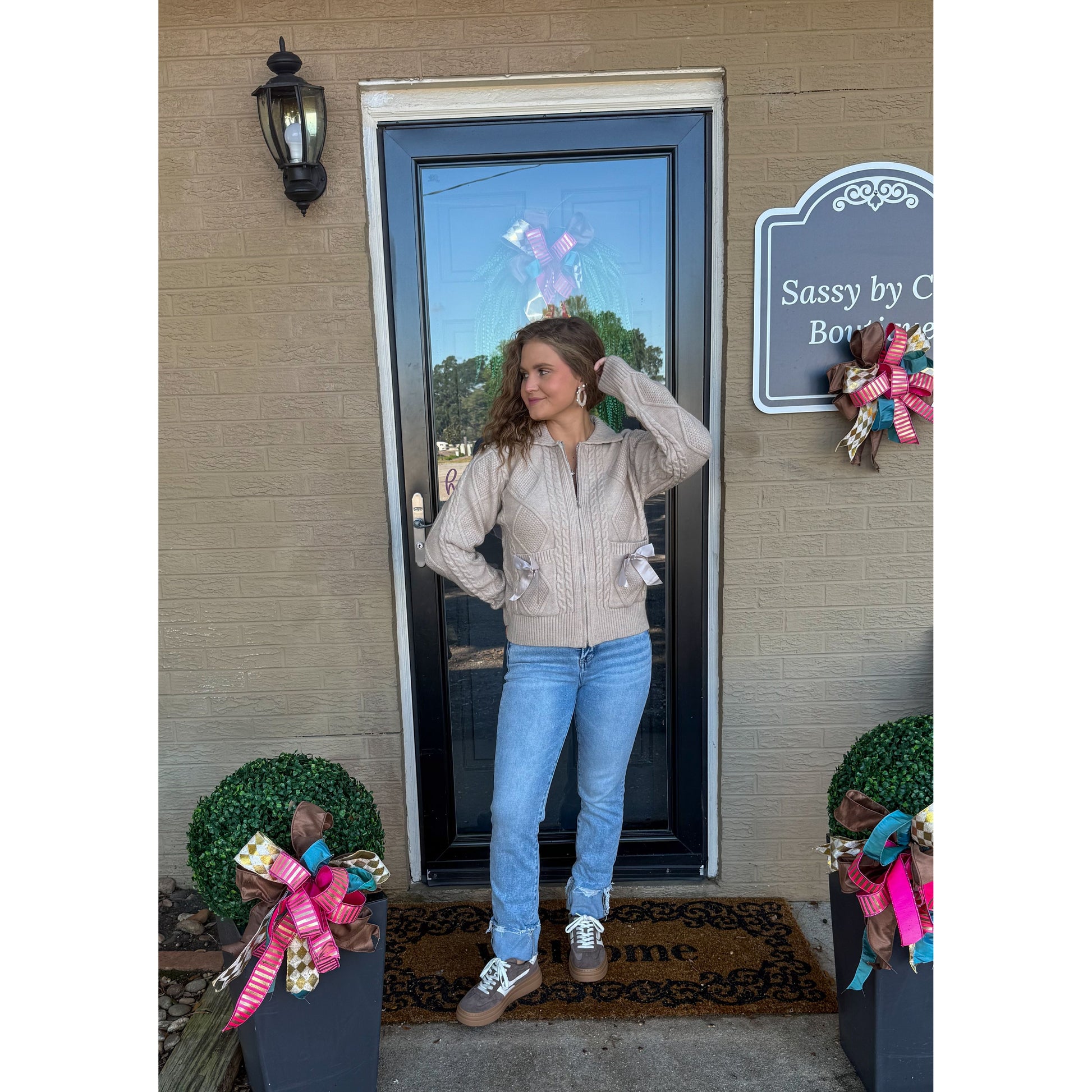 Taupe sweater knit jacket. Zipper down the front of top. 2 pockets along the front of jacket with 2 satin bows on the front. Collar detail with the zipper.