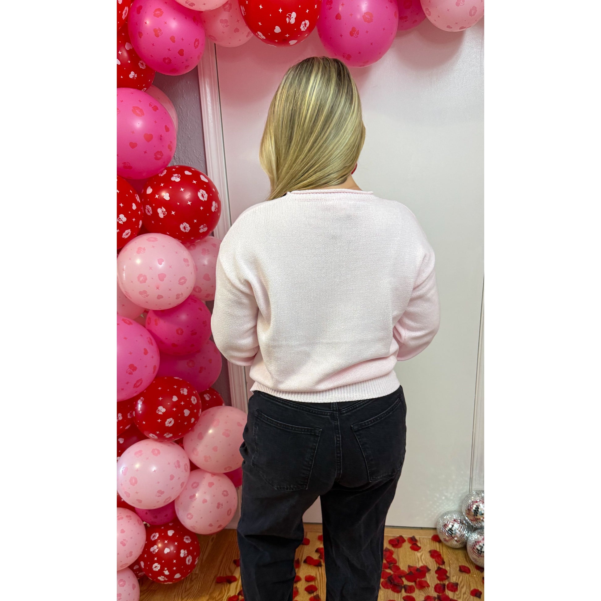 Light pink lightweight knit sweater with heart martini graphic in the front.