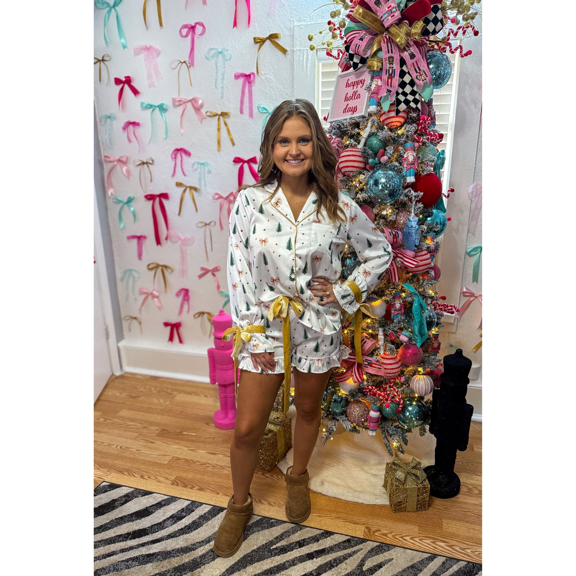 Winter wonderland pj set. White pjs with green Christmas tress outlined mustard and velvet mustard bows. Matching pj shorts with elastic waistband and pockets.