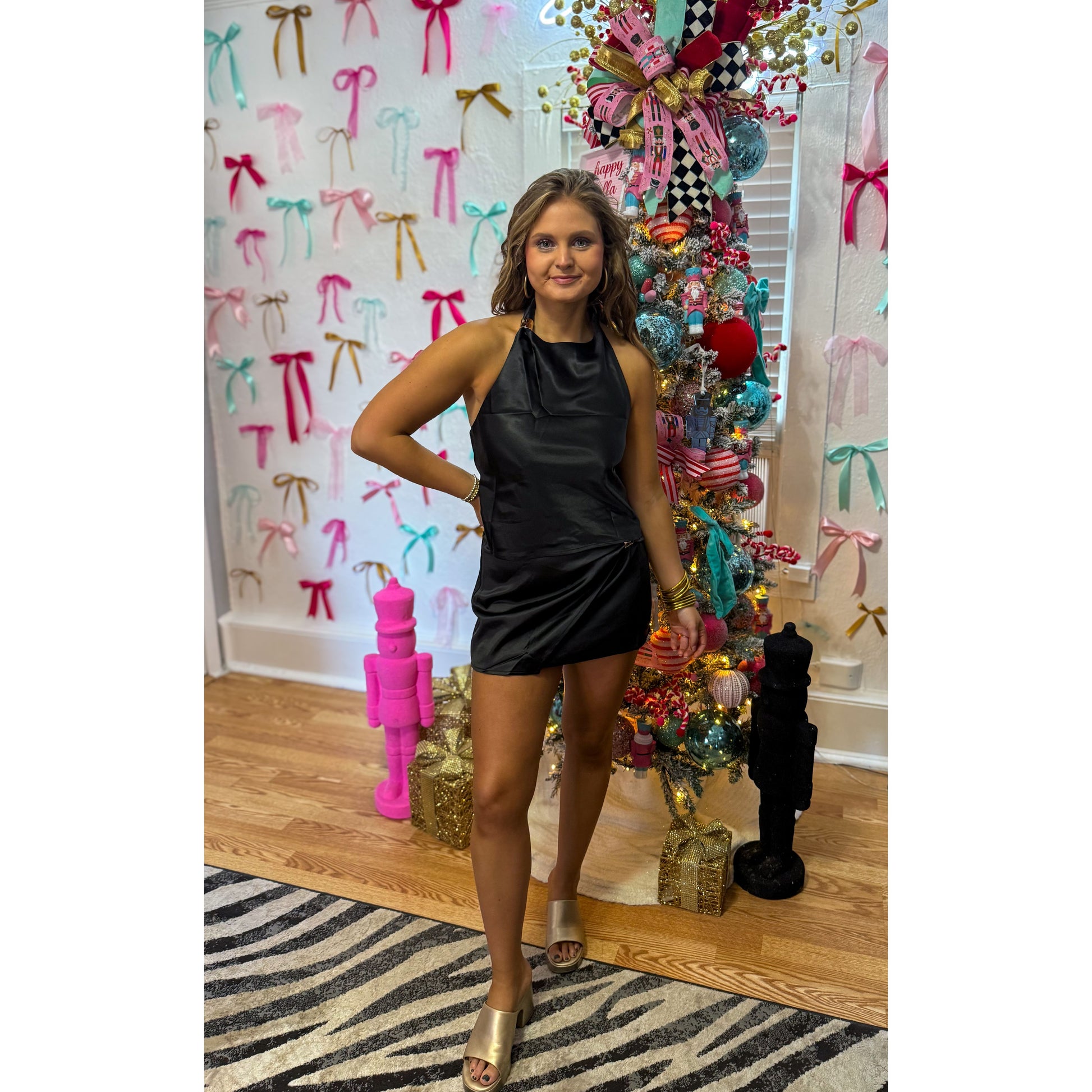 Black satin set. Top is halter neck with gold detail along the neck and it is lined. Skirt has back zipper with gold detail along the front.