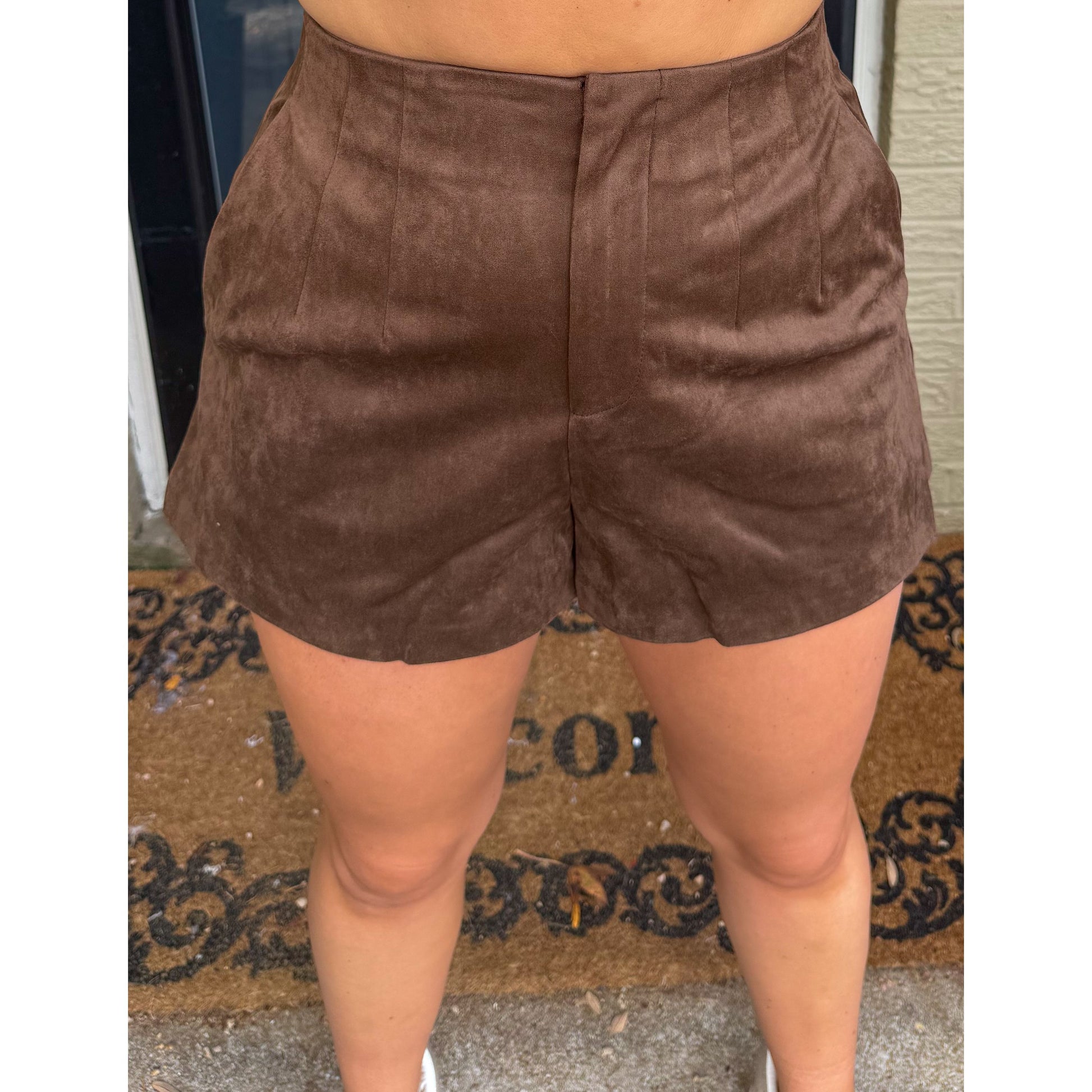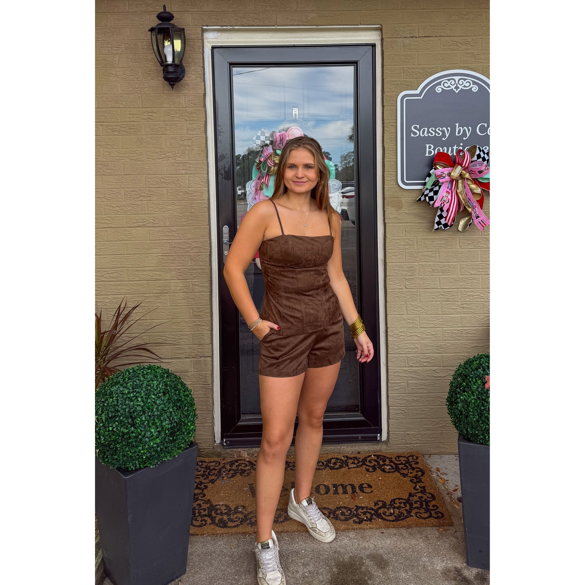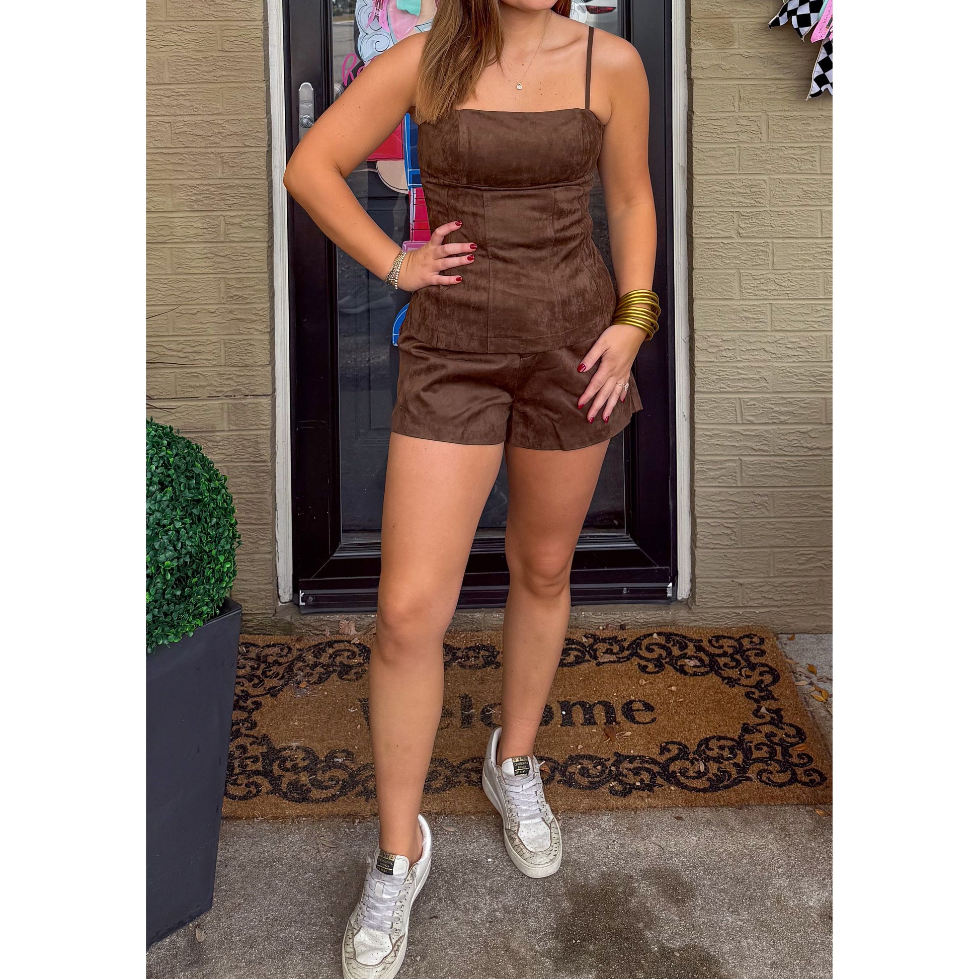 Faux suede set in brown.. Top is square neckline with adjustable spaghetti straps, boning material along the top. Matching bottoms have button and zipper closure with pockets.
