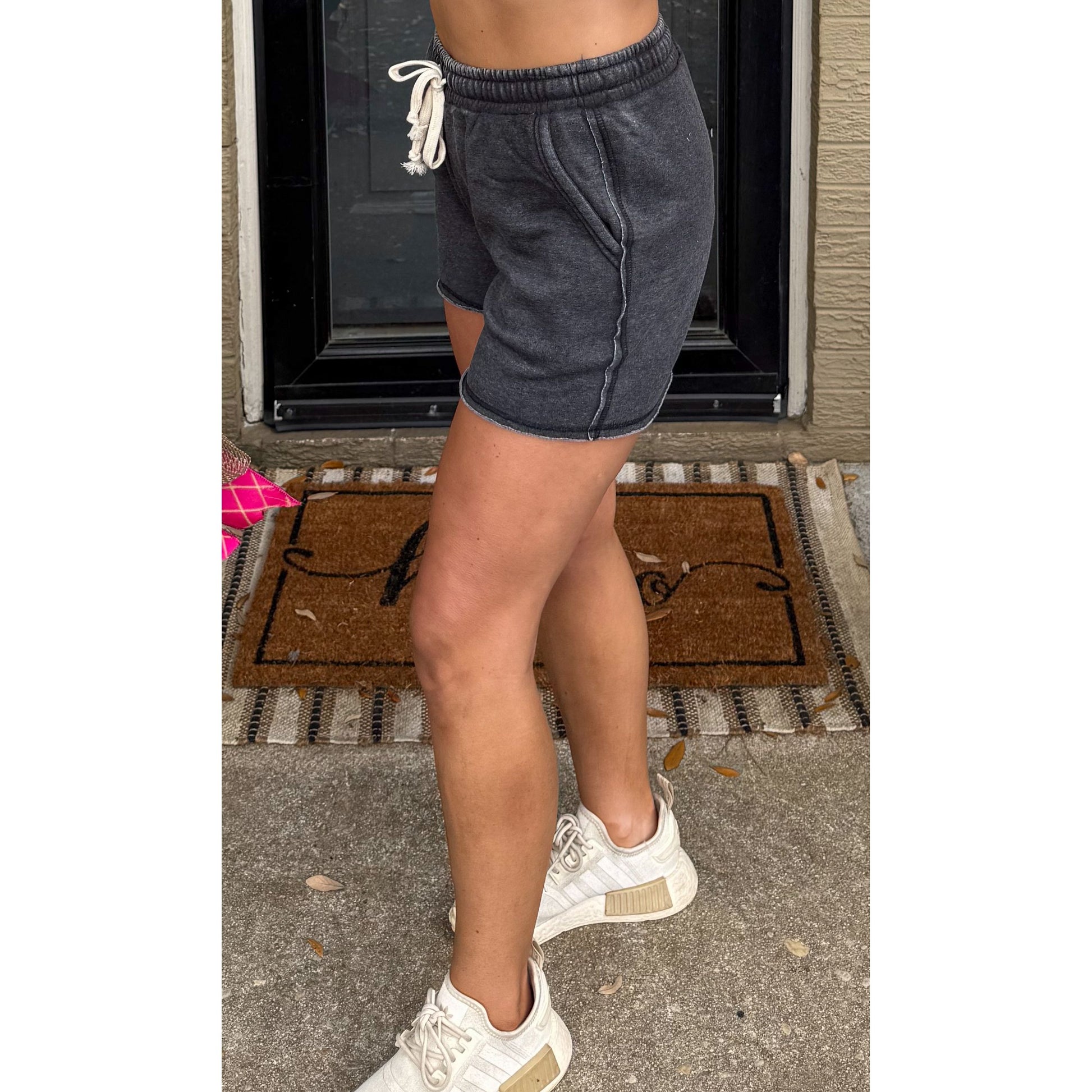 Charcoal grey lounge shorts with elastic waistband and tie to make tighter/looser.