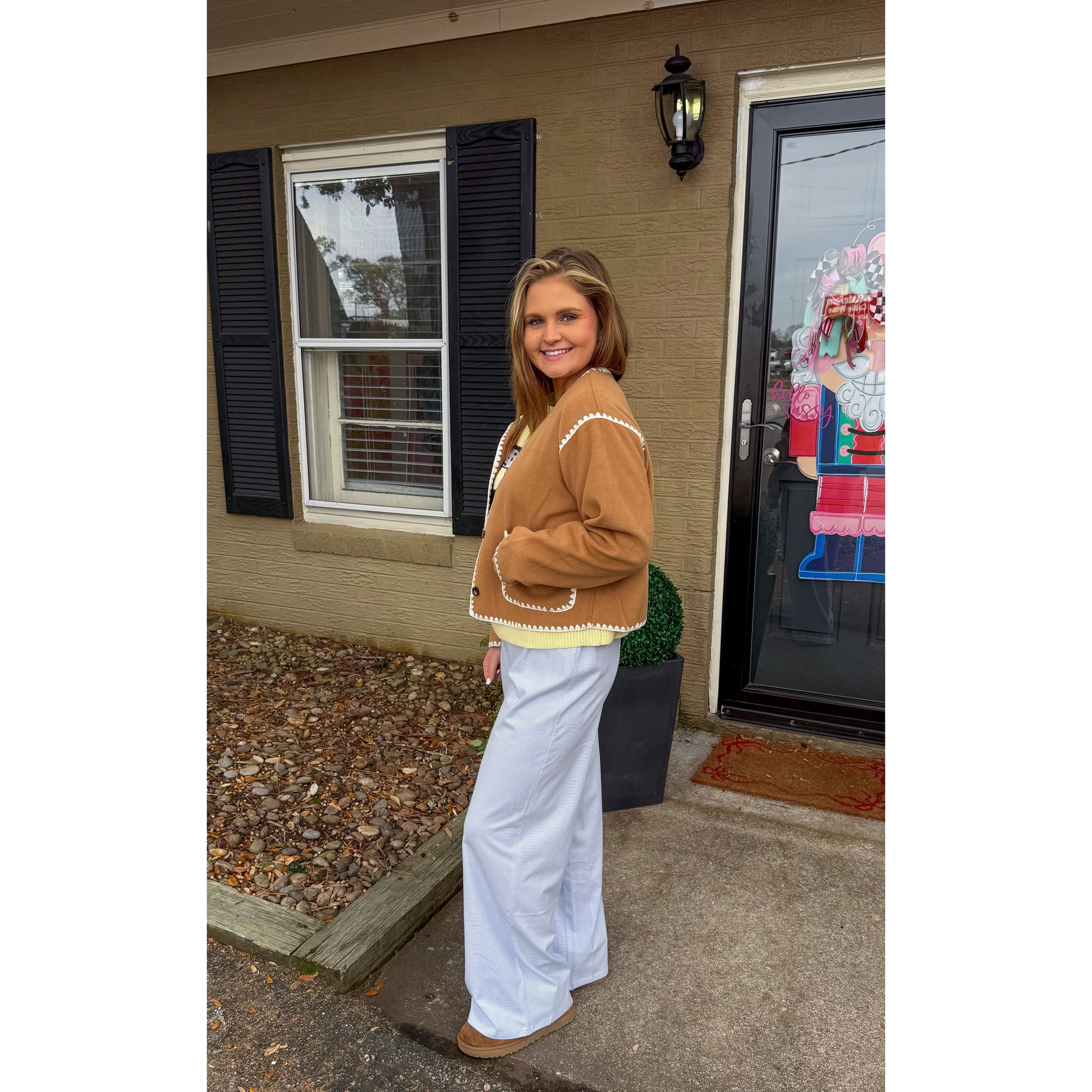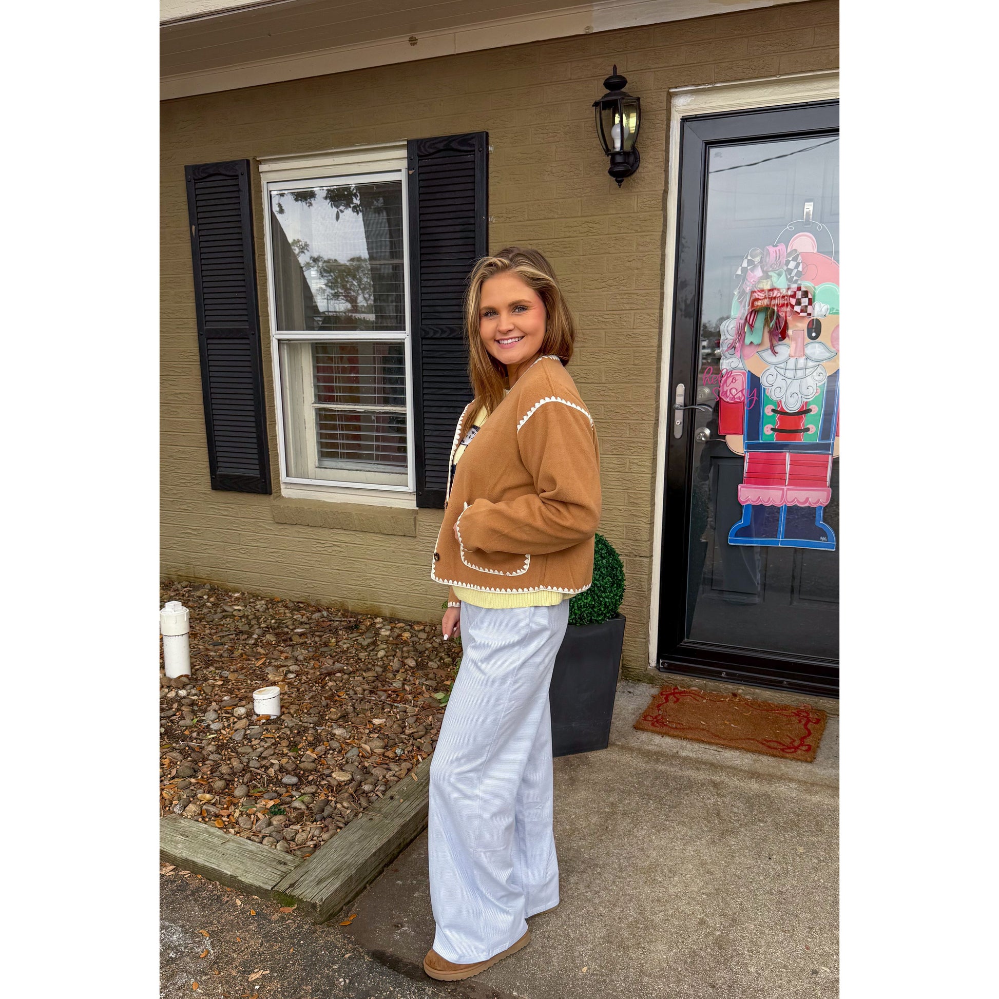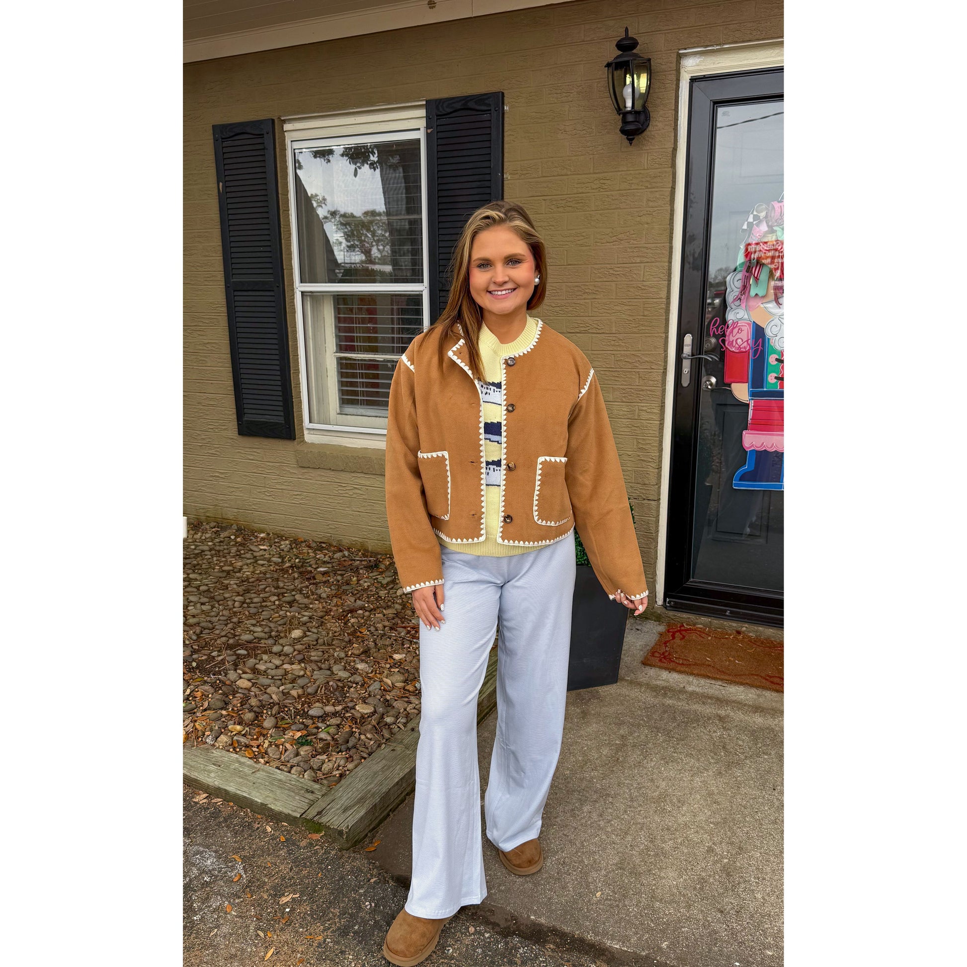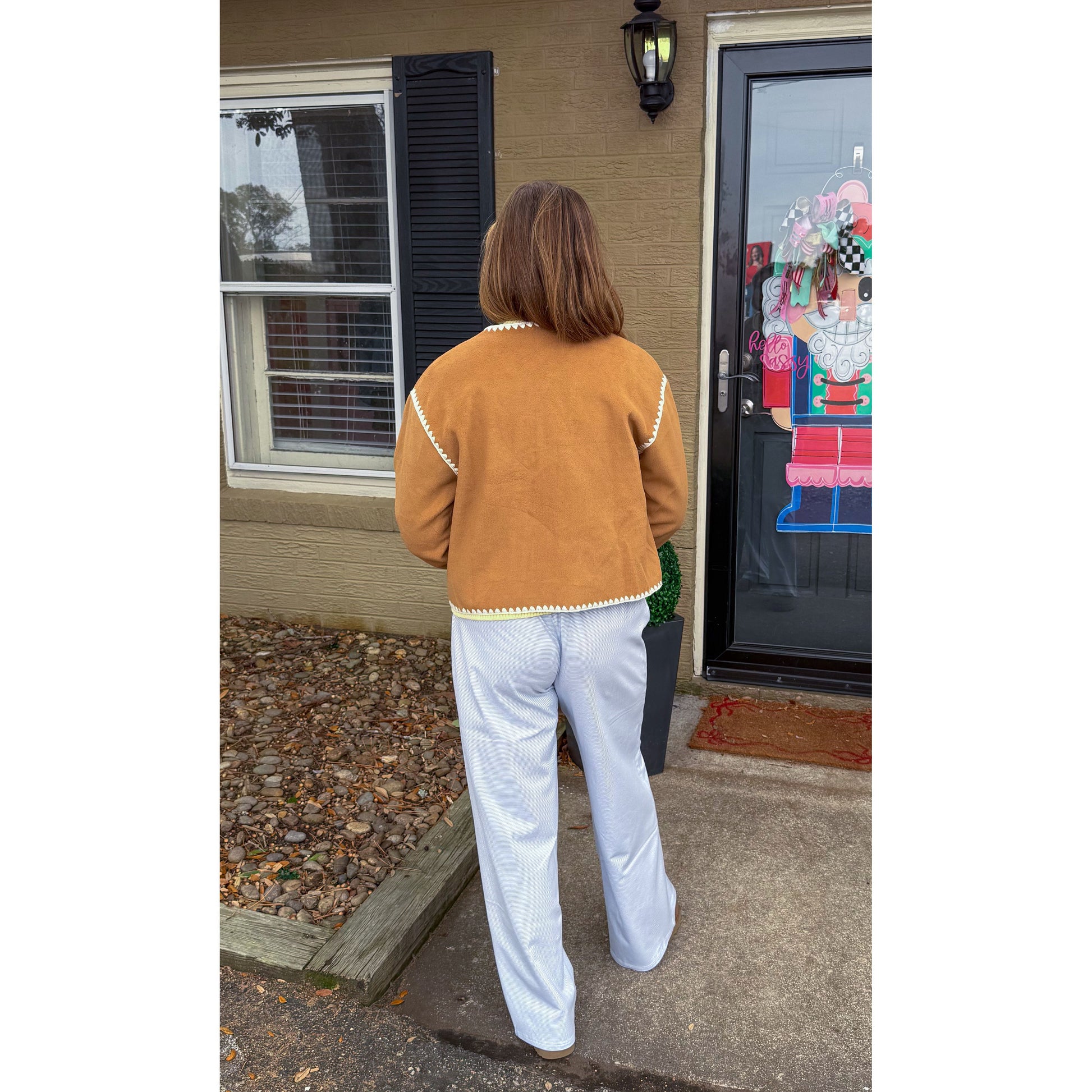 Camel color jacket with cream detail along the trim of jacket. Button of closure with pockets in the front.