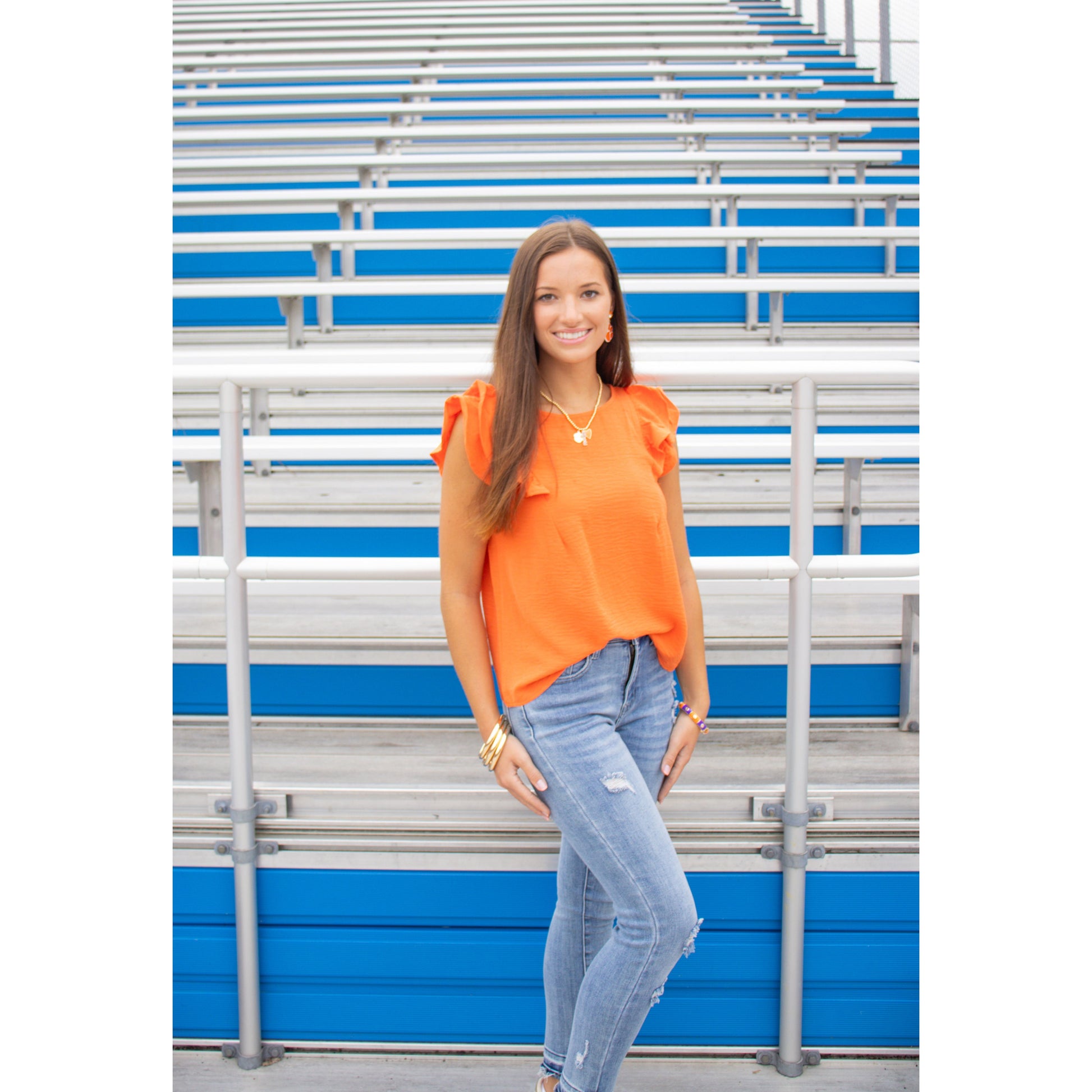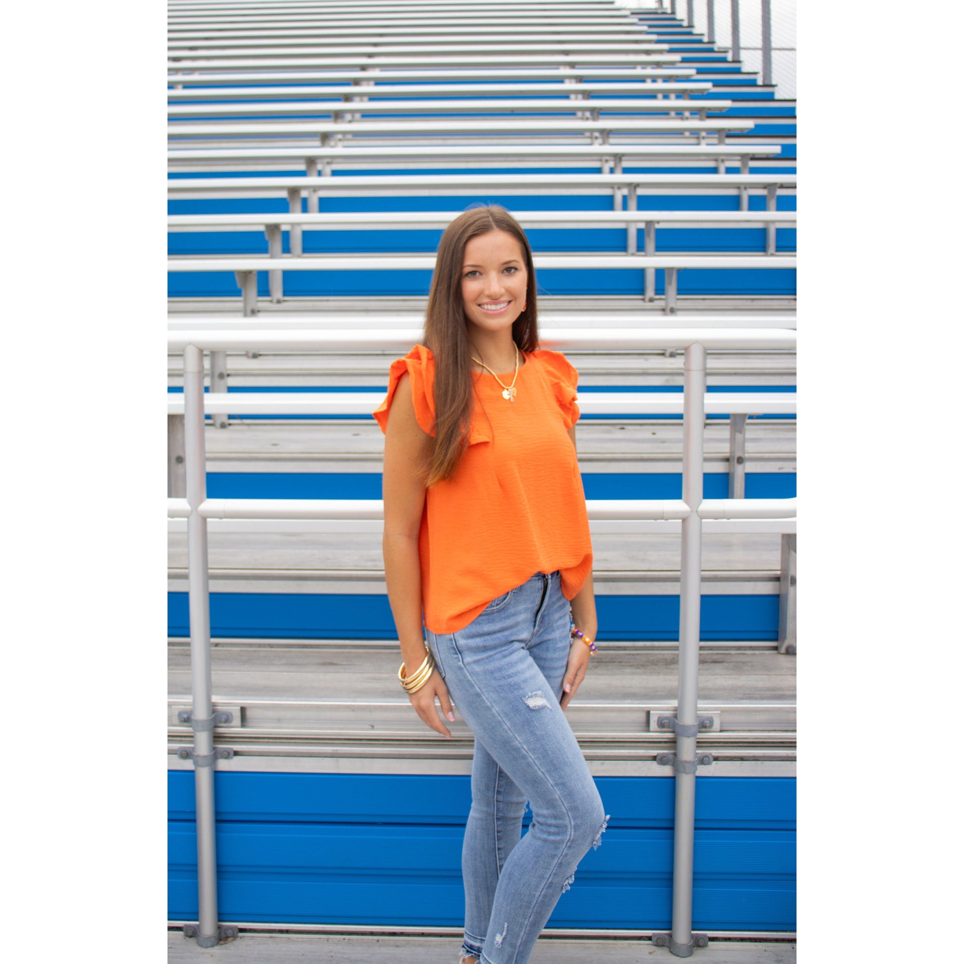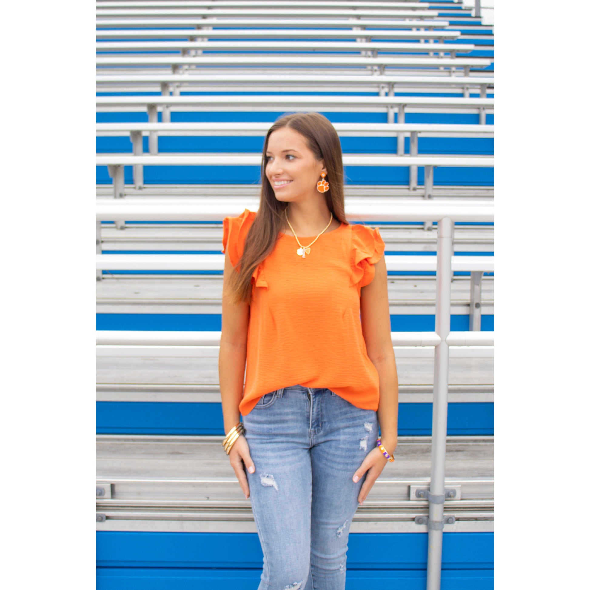 Round neckline orange top with ruffle detail along the sleeves and keyhole closure along the back of top.