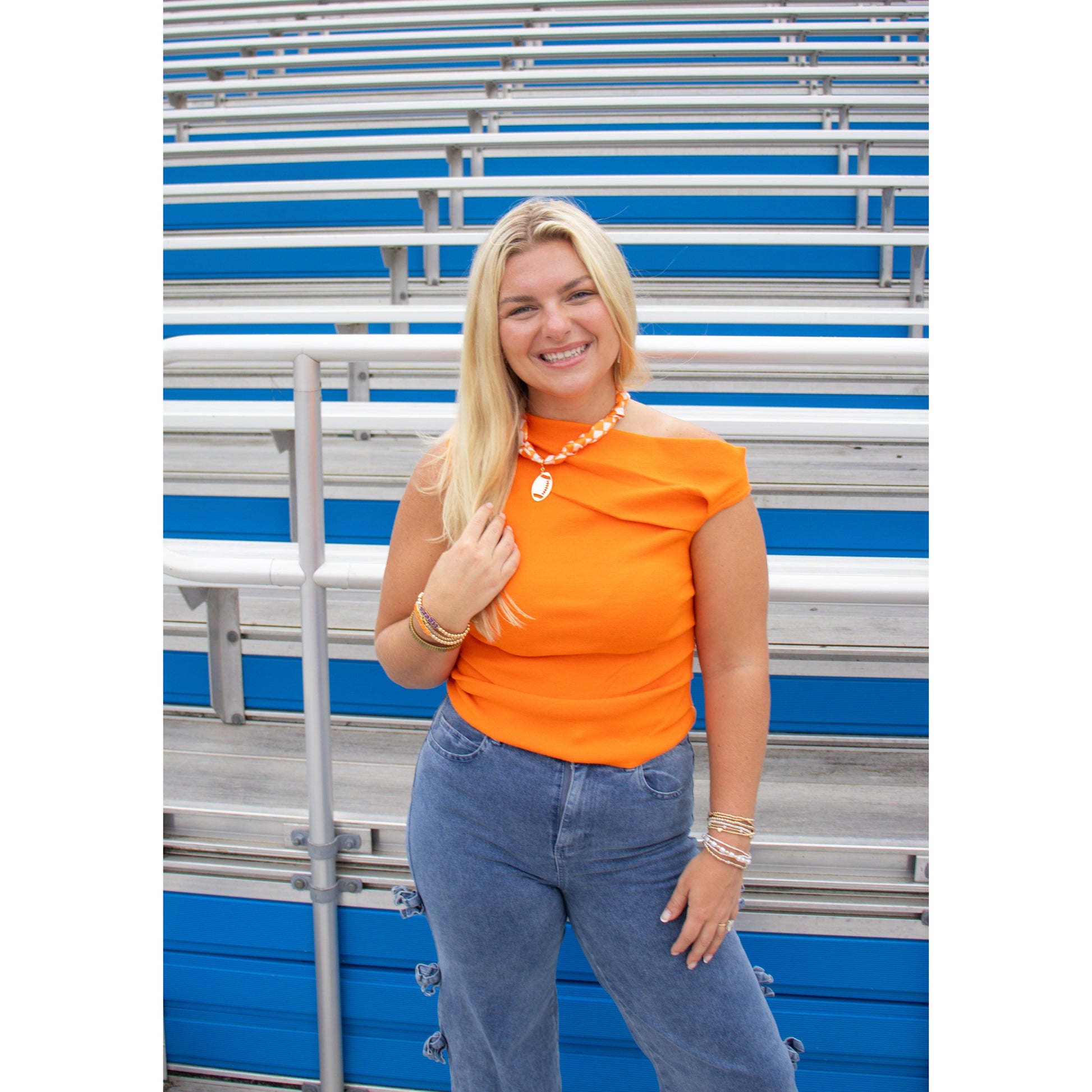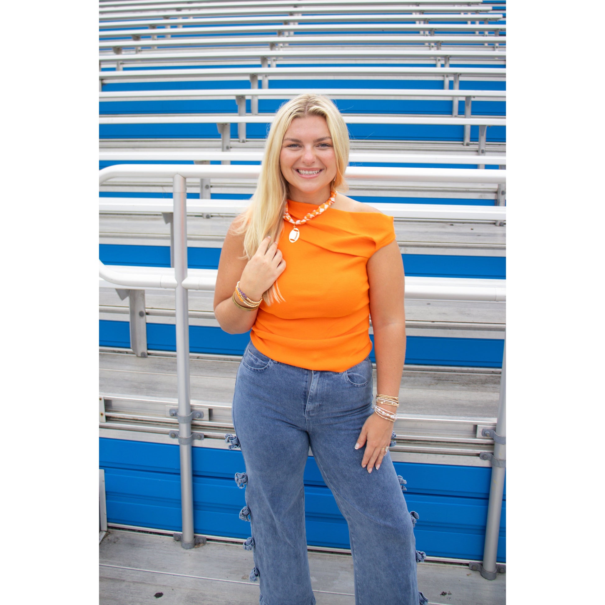 Orange asymmetrical neckline top. Ruched detailing along the top.