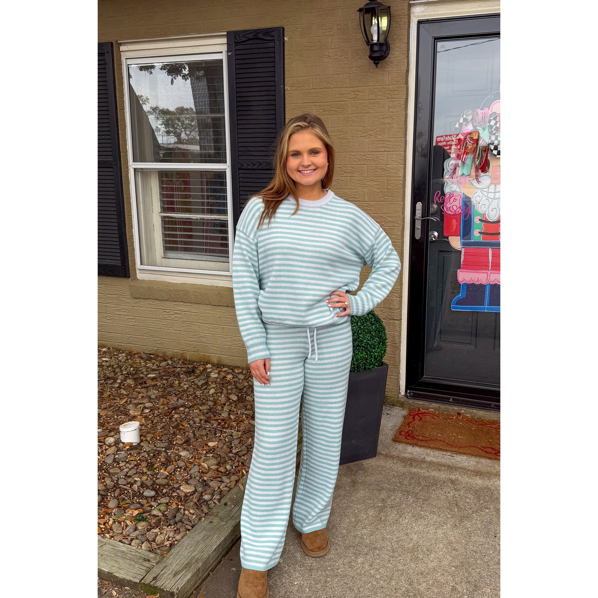 We brought this beauty back by popular demand in a new color! Stripes pattern lounge set. Knit material. Top is long sleeve and oversized. Bottoms are wide leg & elastic waistband to make tighter or looser. Sold as a set but can easily be worn as separates.