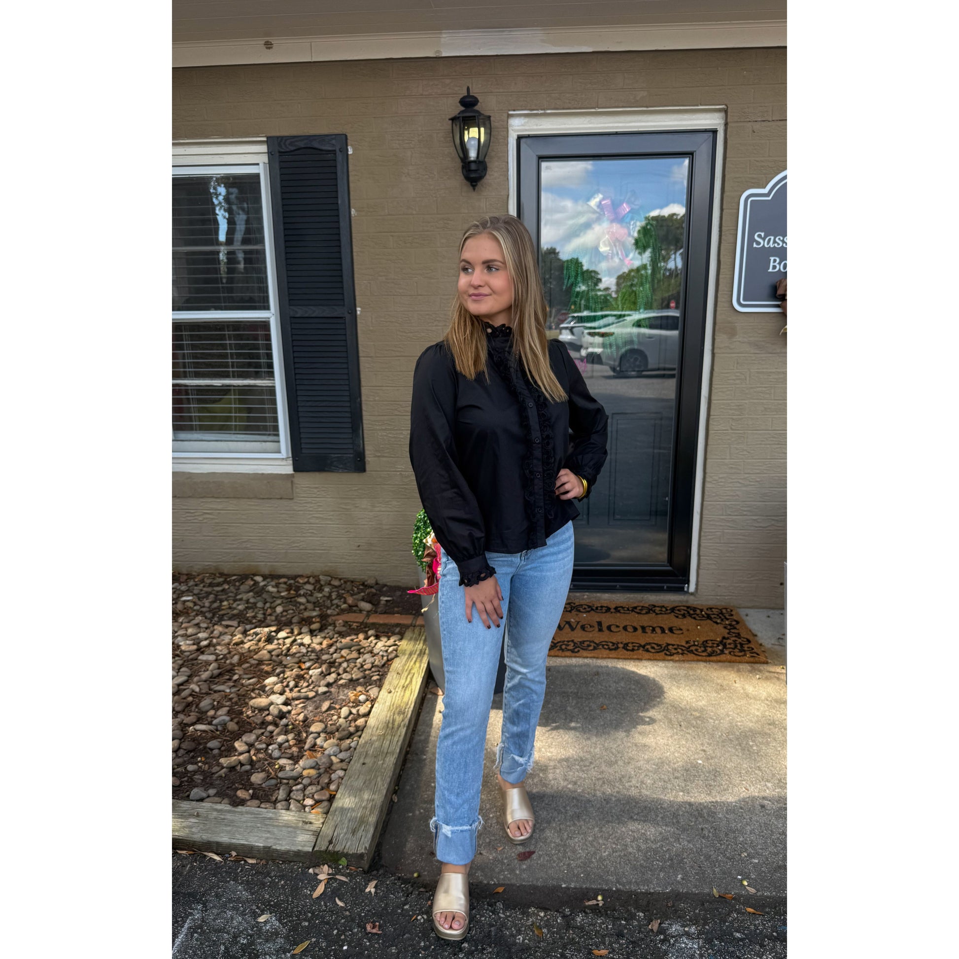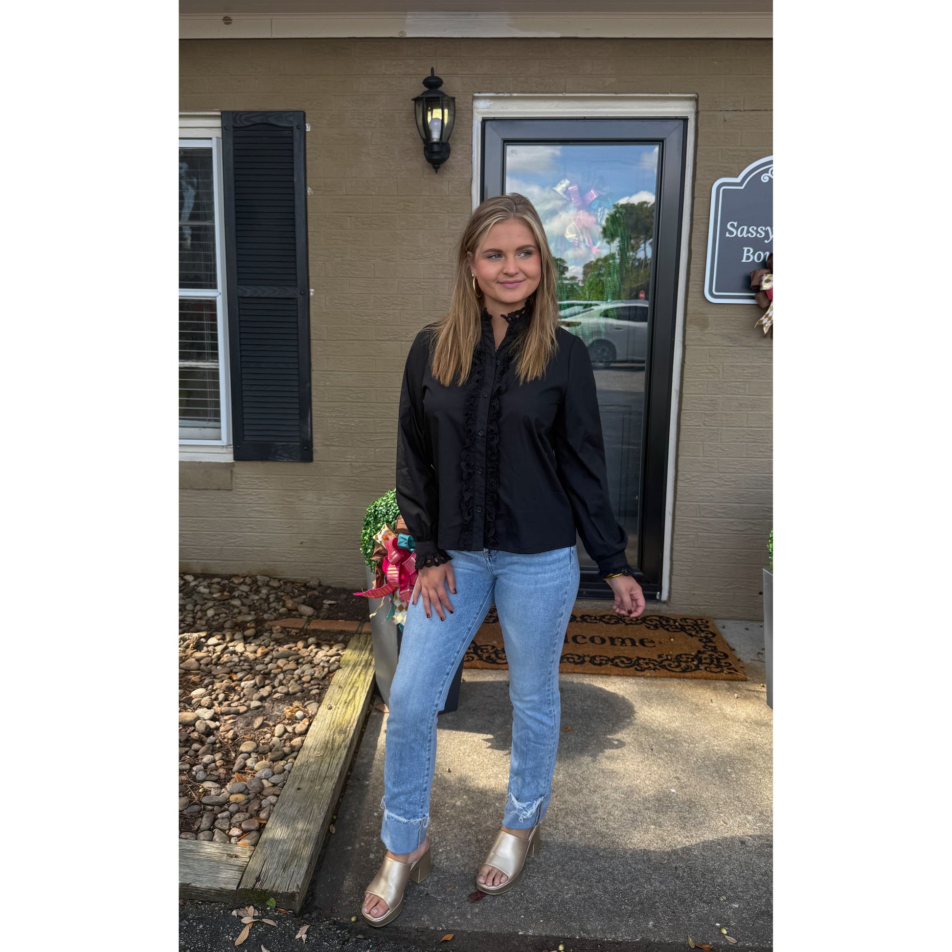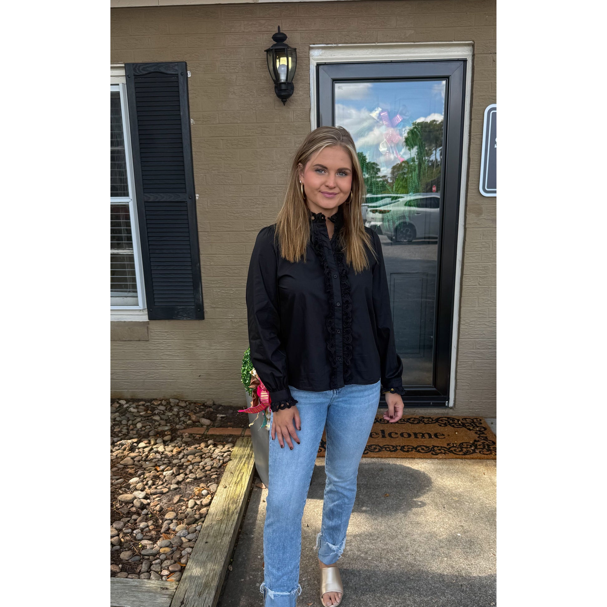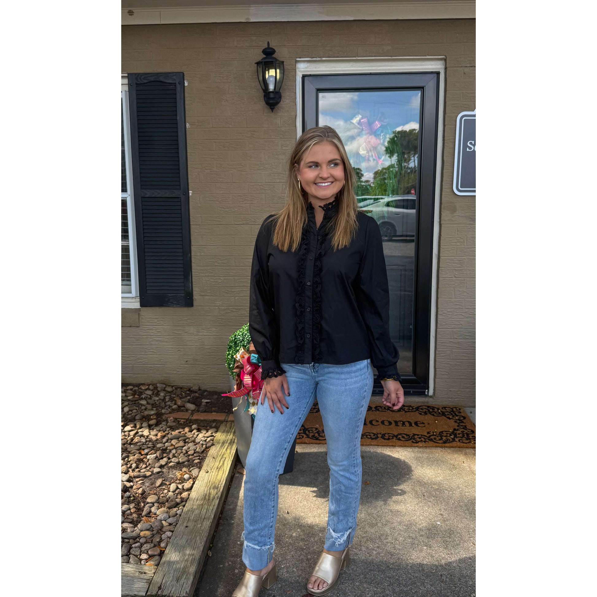 Black long sleeve blouse with eyelet lace detail along the hem of sleeves and along the button down detail of front of blouse. Collar neckline.