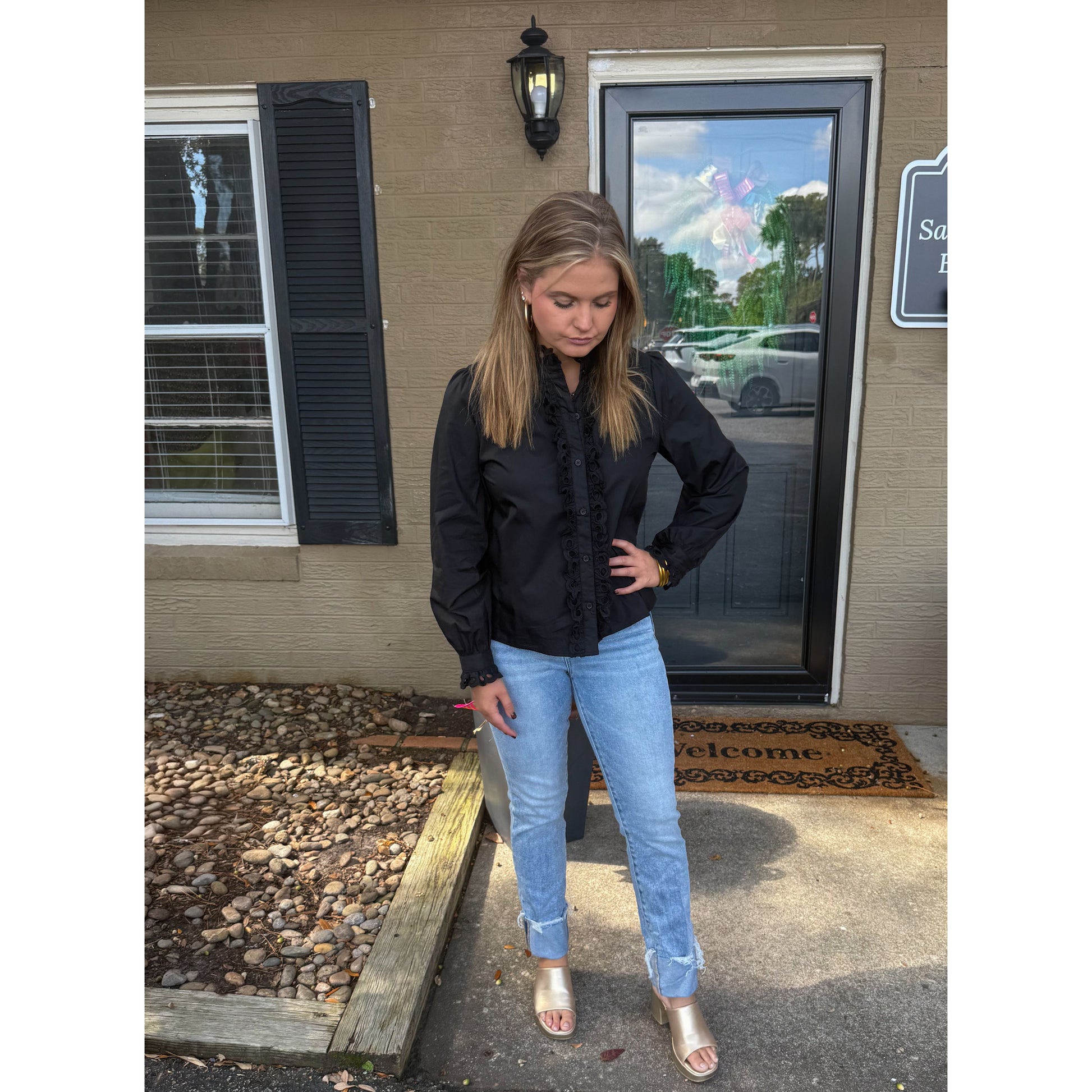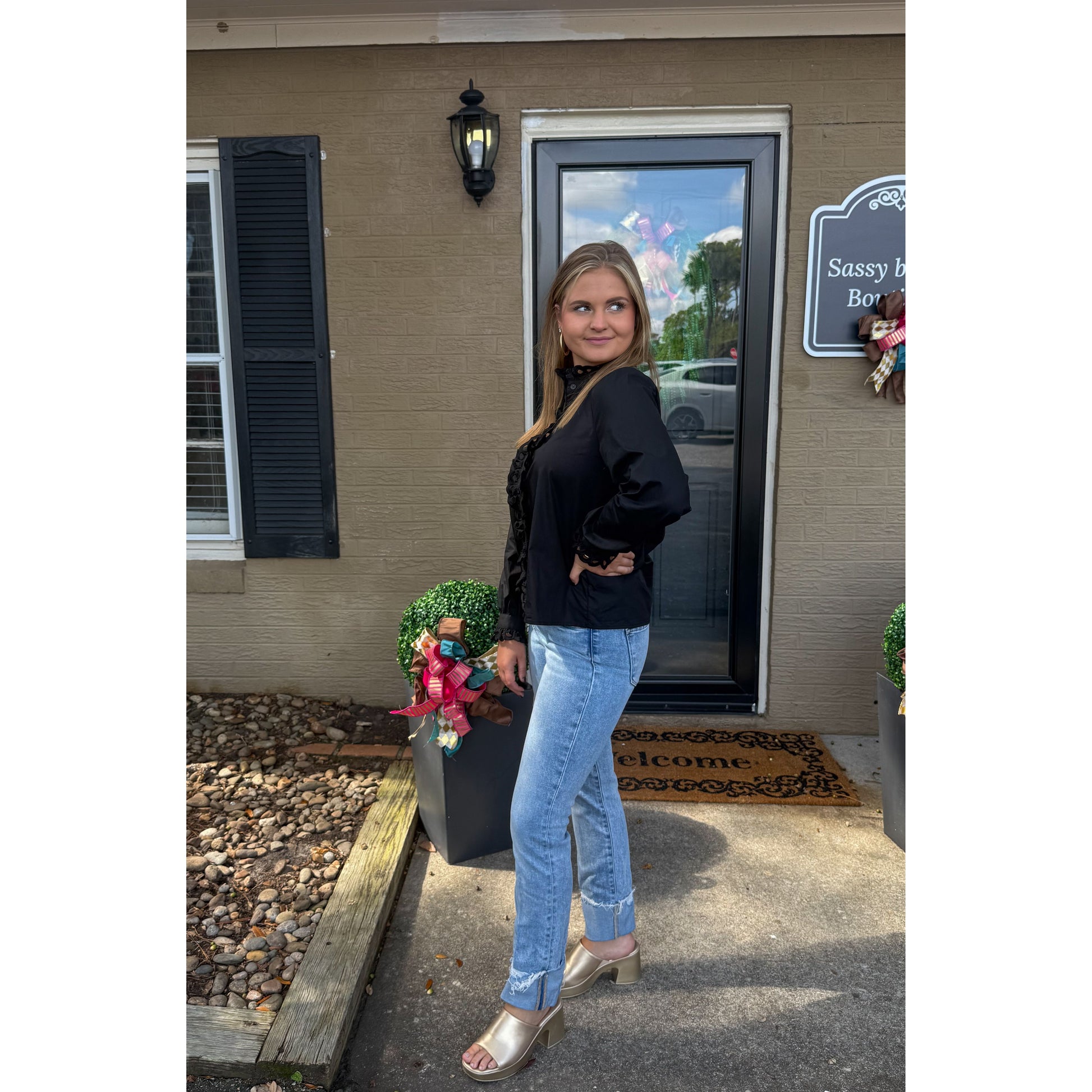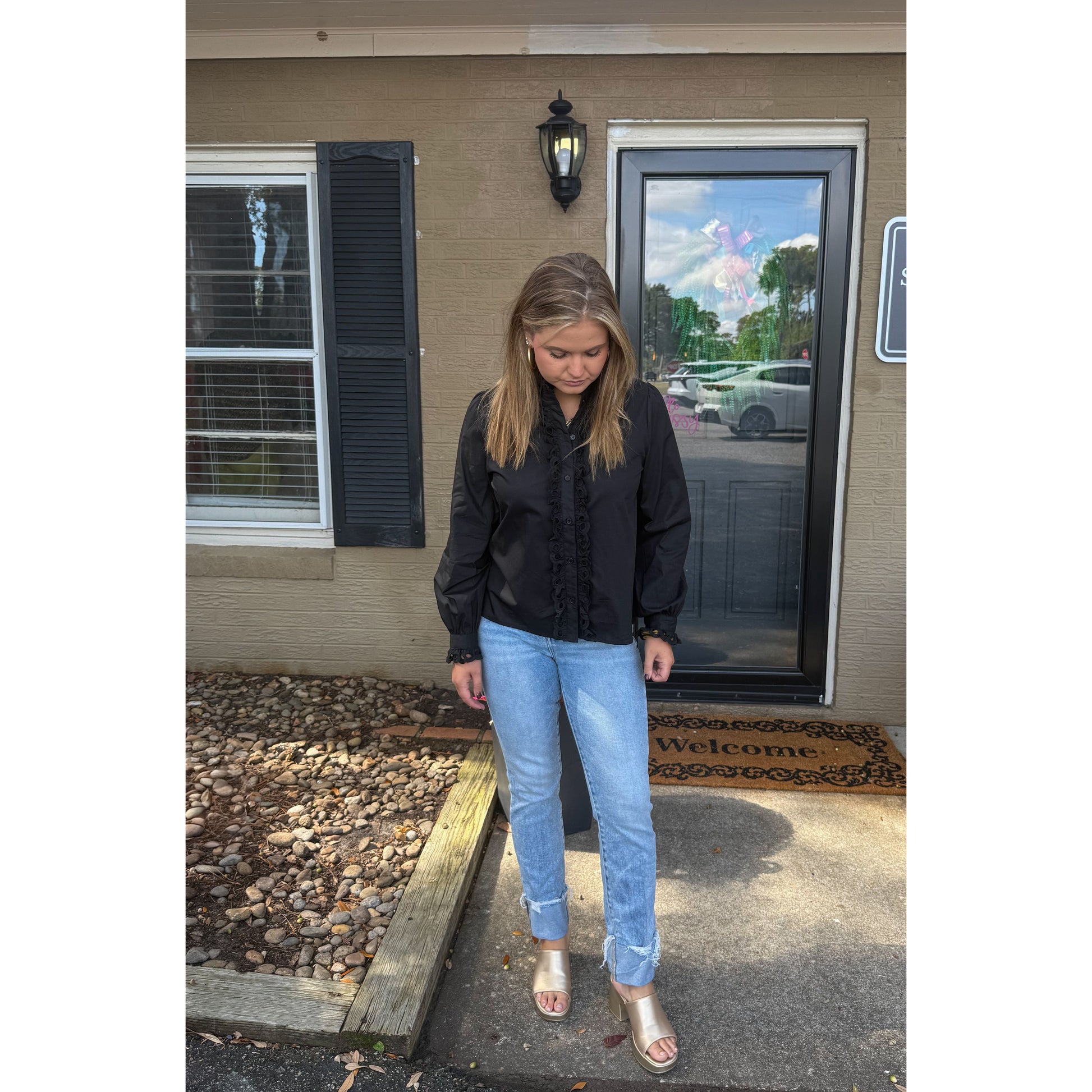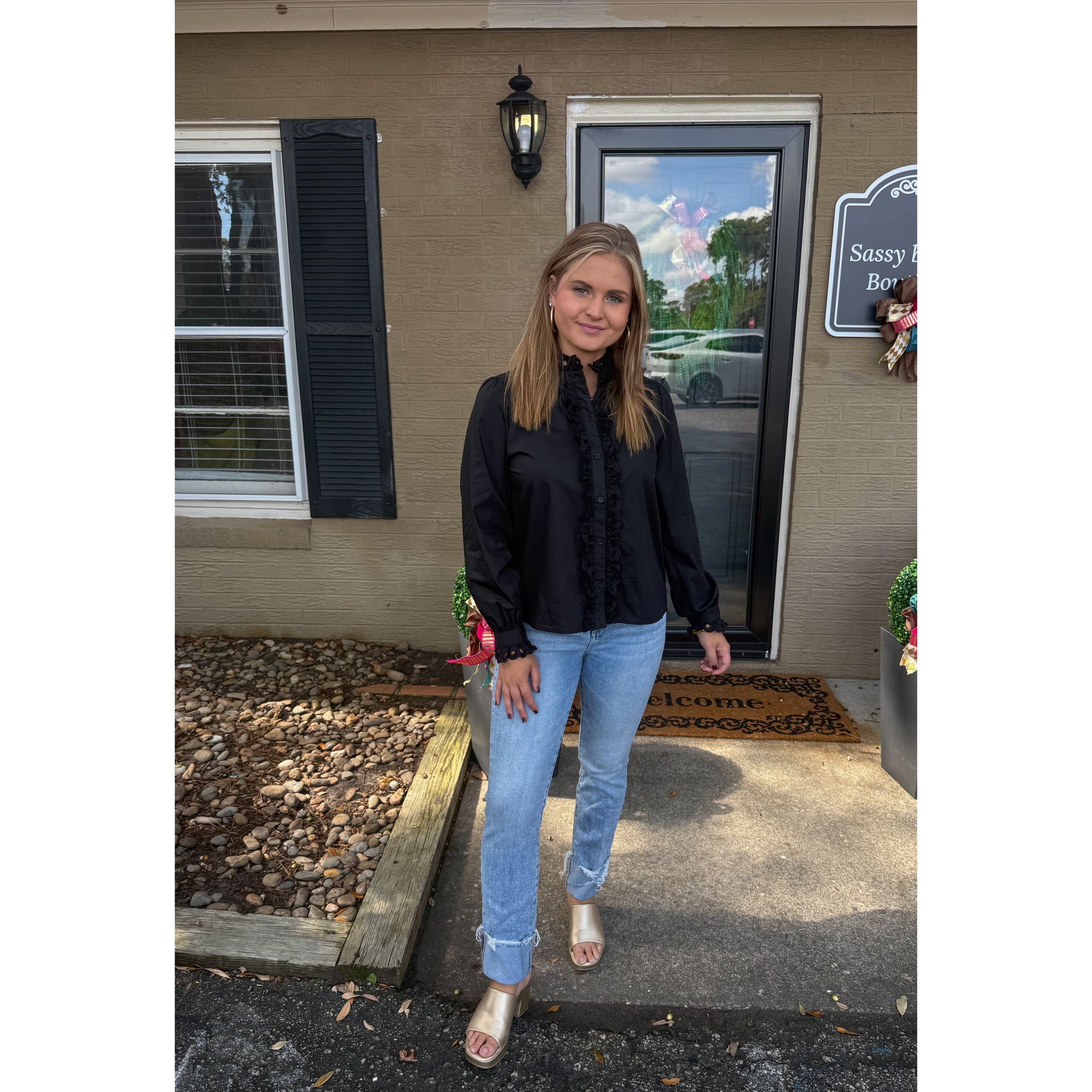 Black long sleeve blouse with eyelet lace detail along the hem of sleeves and along the button down detail of front of blouse. Collar neckline.