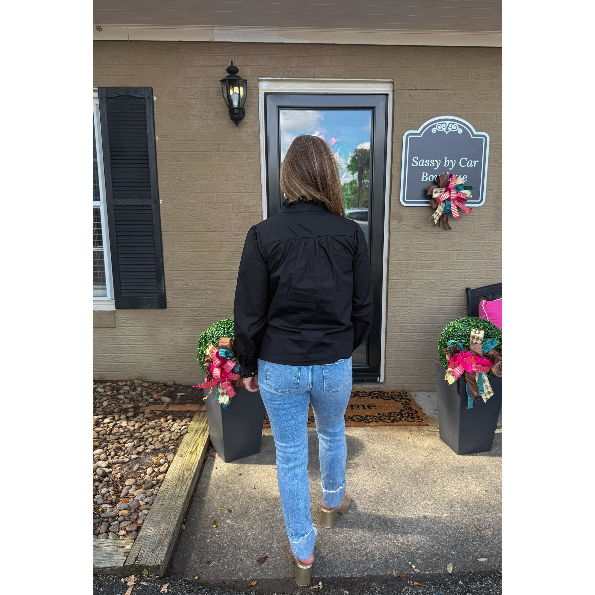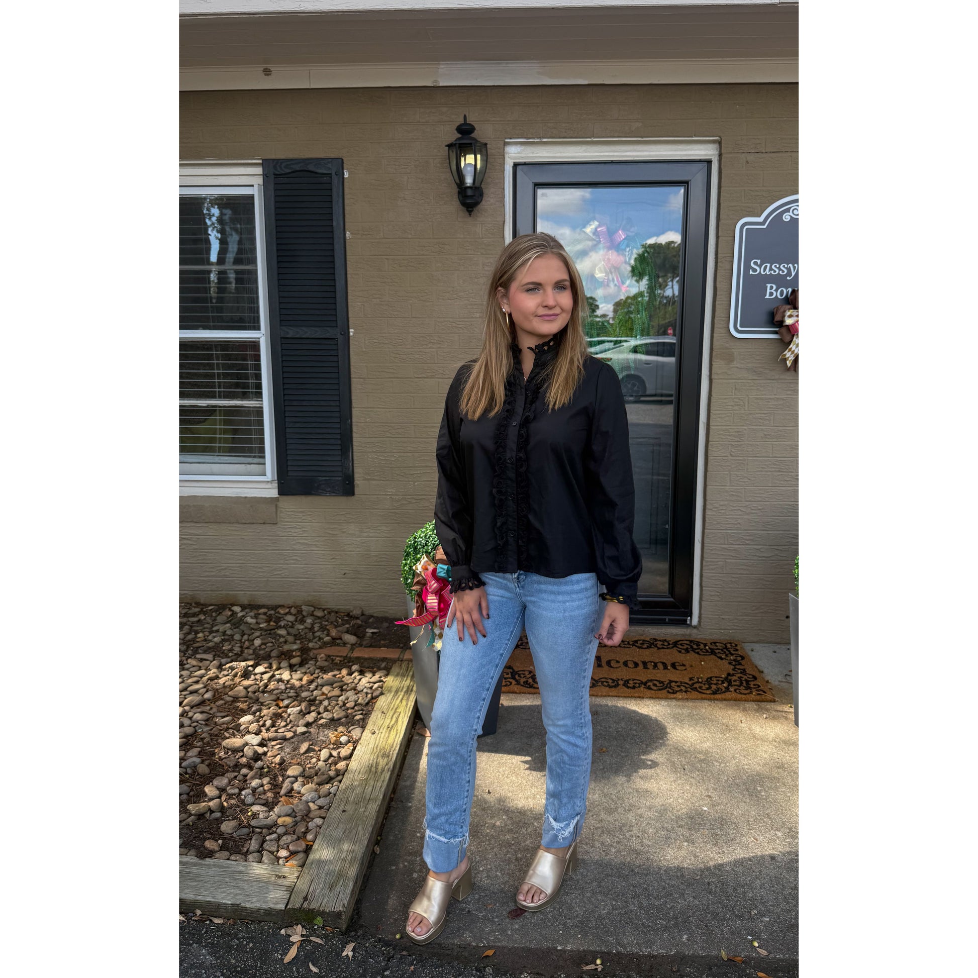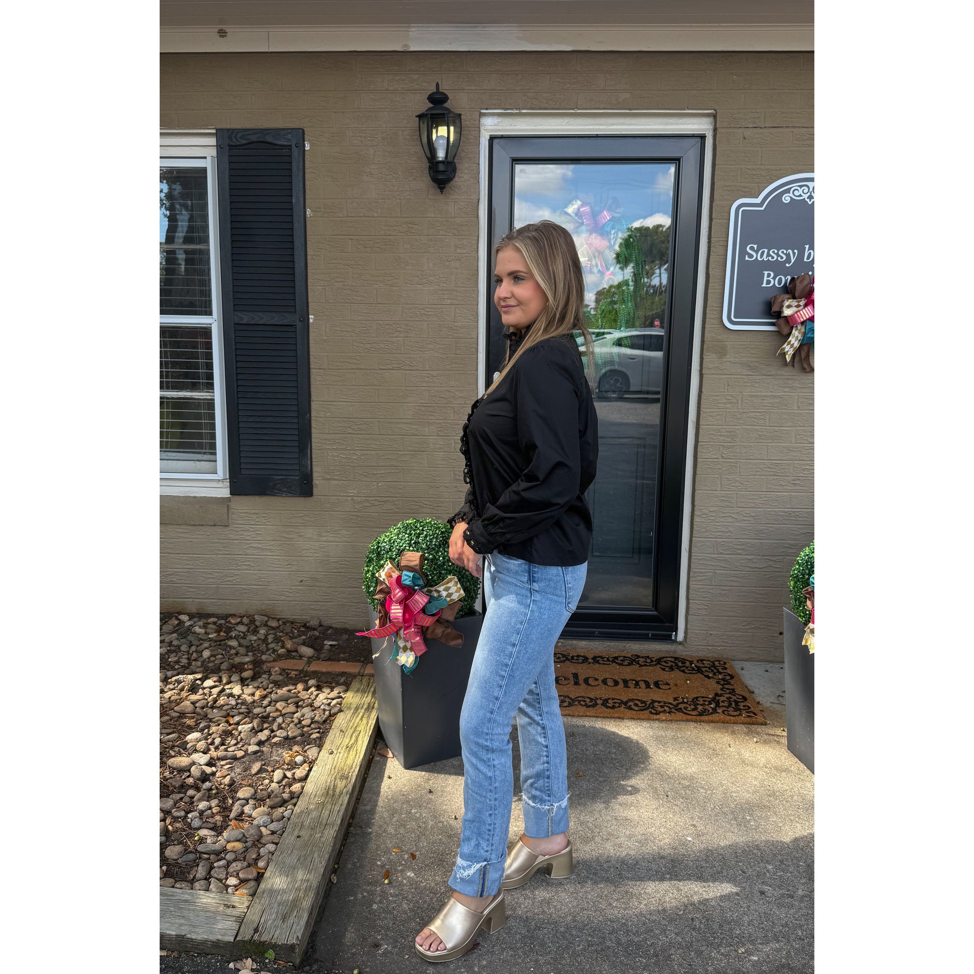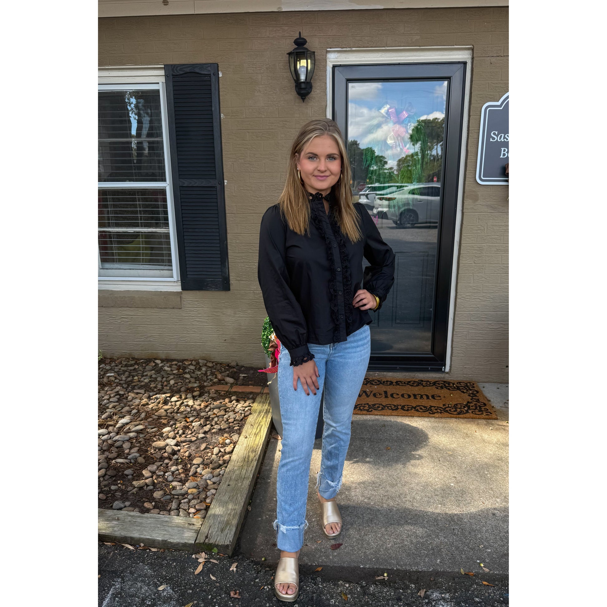 Black long sleeve blouse with eyelet lace detail along the hem of sleeves and along the button down detail of front of blouse. Collar neckline.