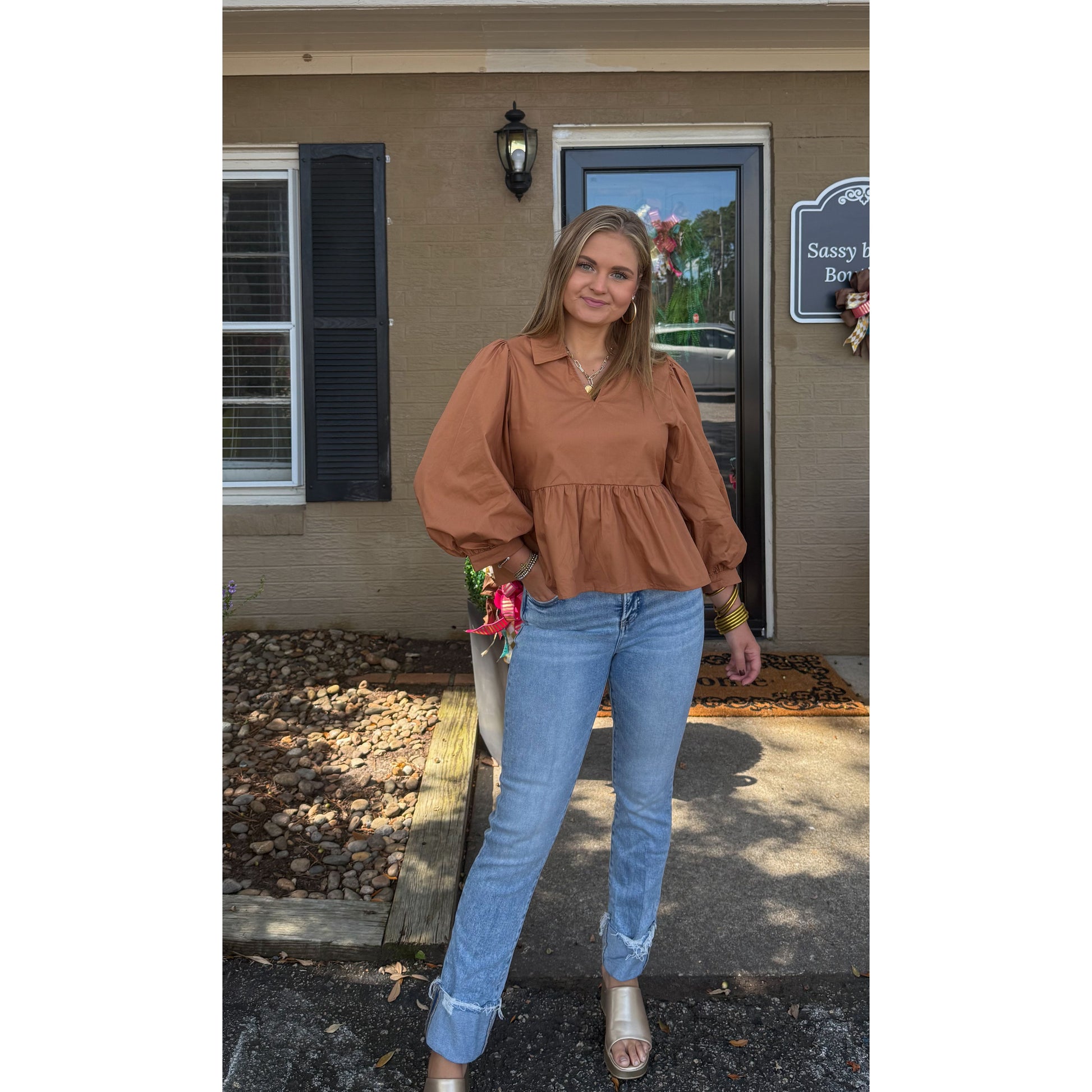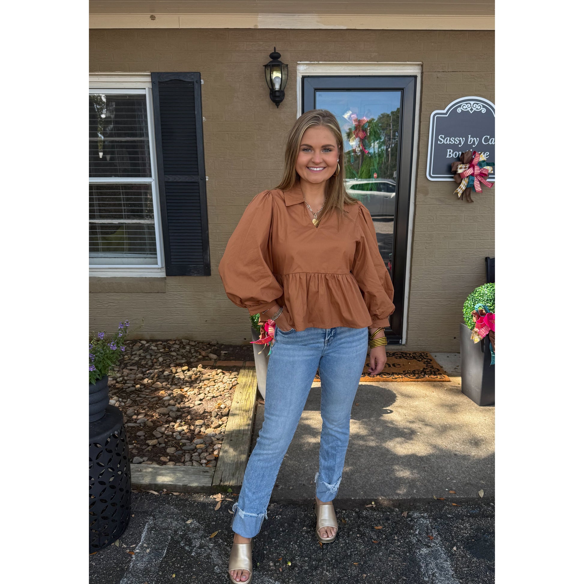 Toffee color blouse. Collar neckline with v-neckline. Balloon sleeve detail, lined, and pleated detail under the chest of top.