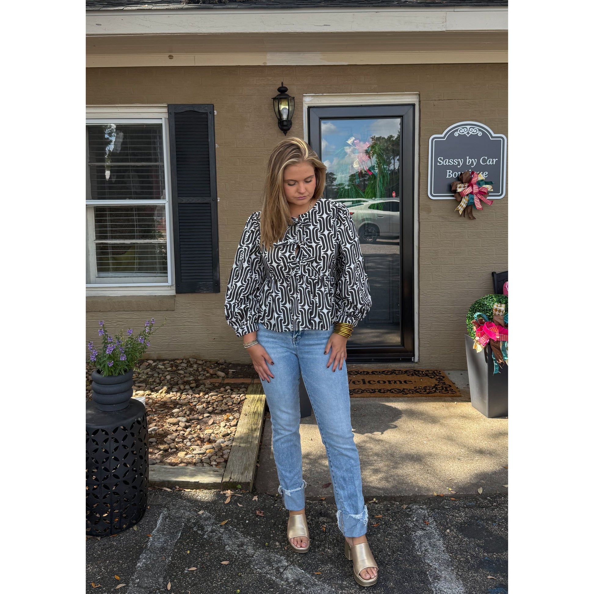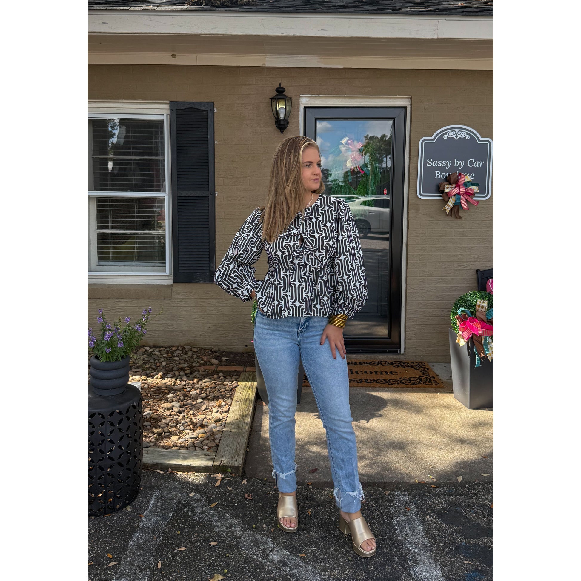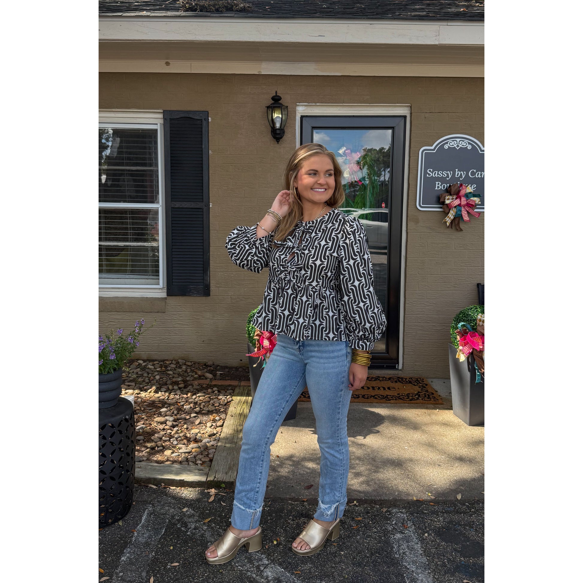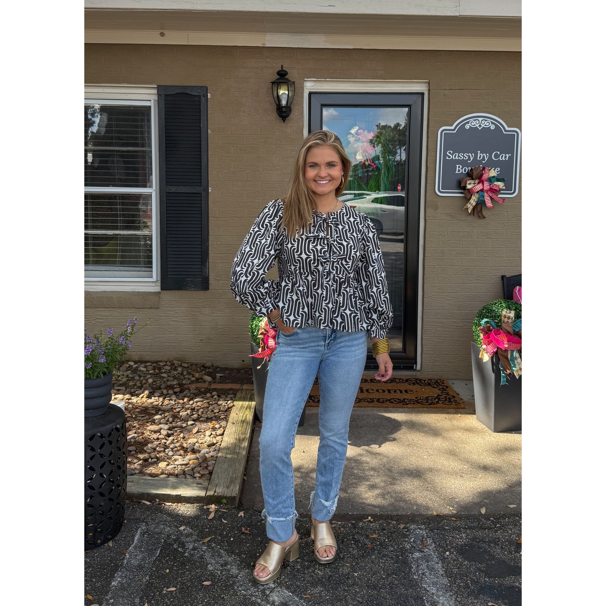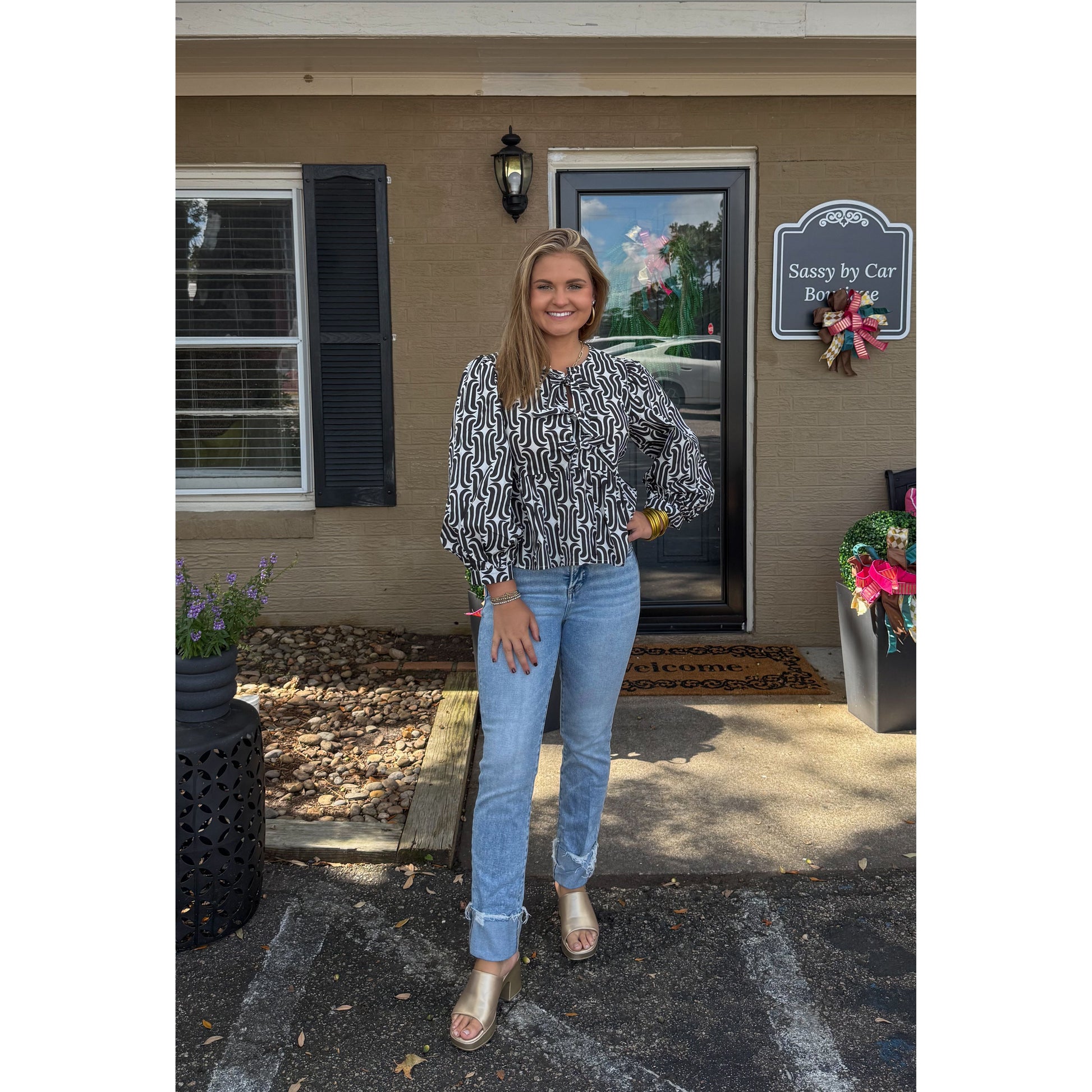 Black/white pattern top. Quarter sleeves, three bow closure along the front of top for an added detail, pleated detail under the chest of top.