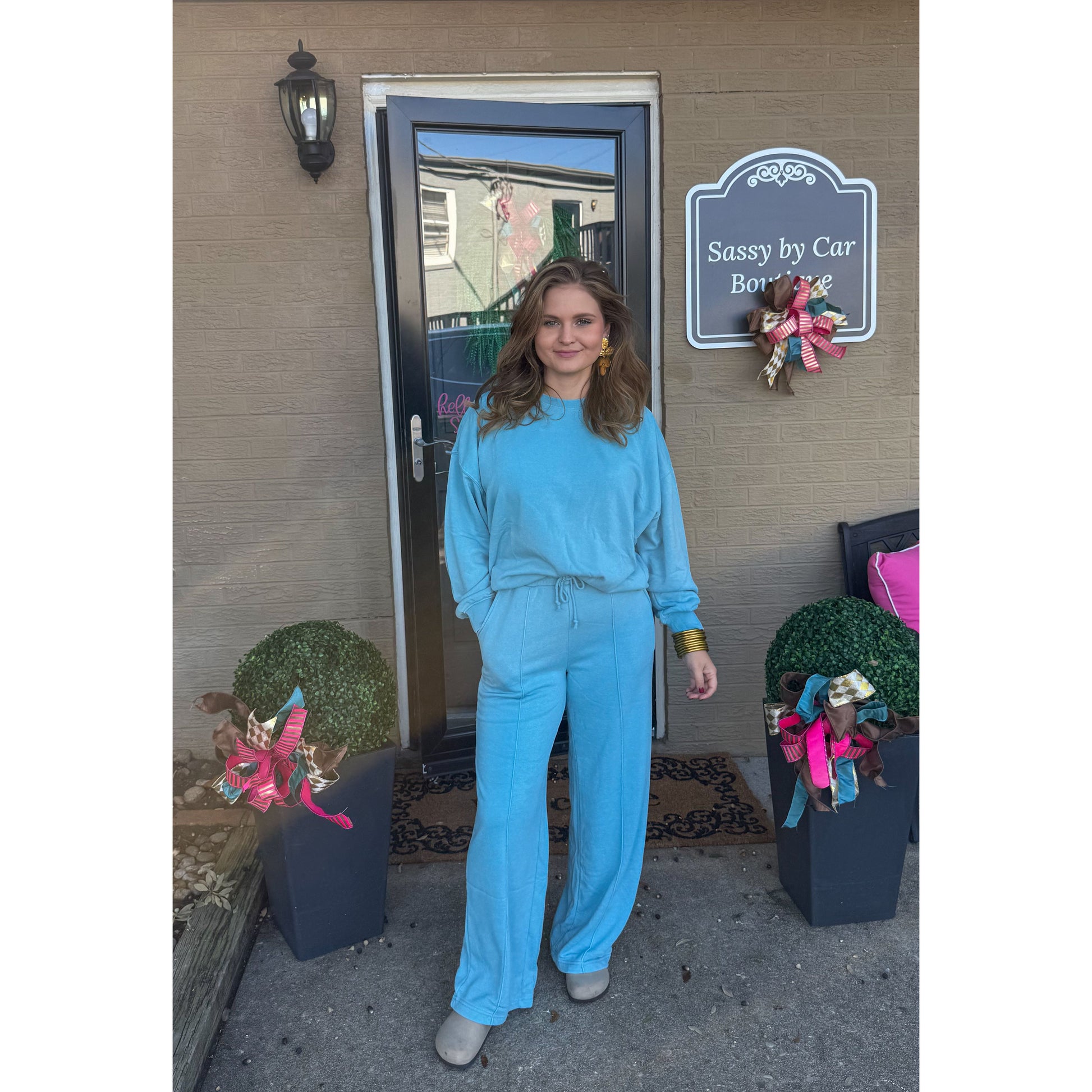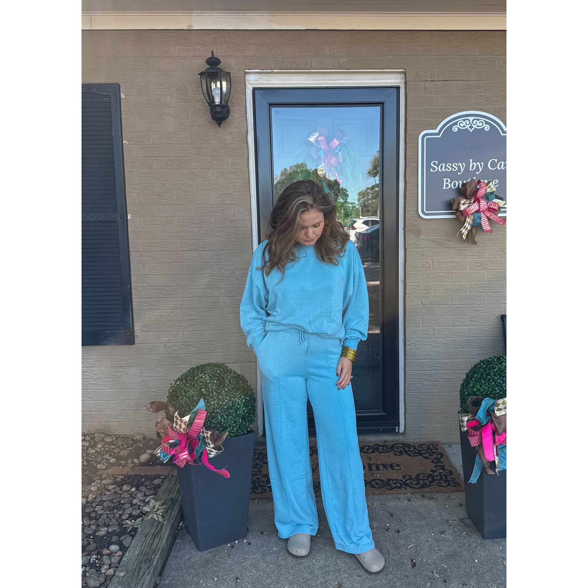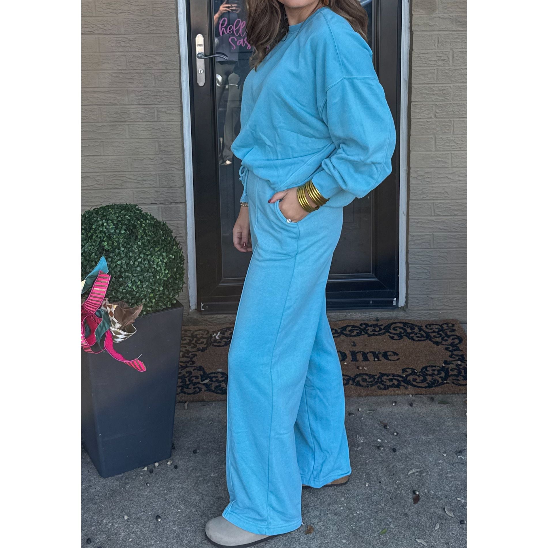 Sold as a set. Ocean blue oversized sweatshirt with ocean blue lounge sweatpants. Sweatpants have an elastic waistband and pockets.