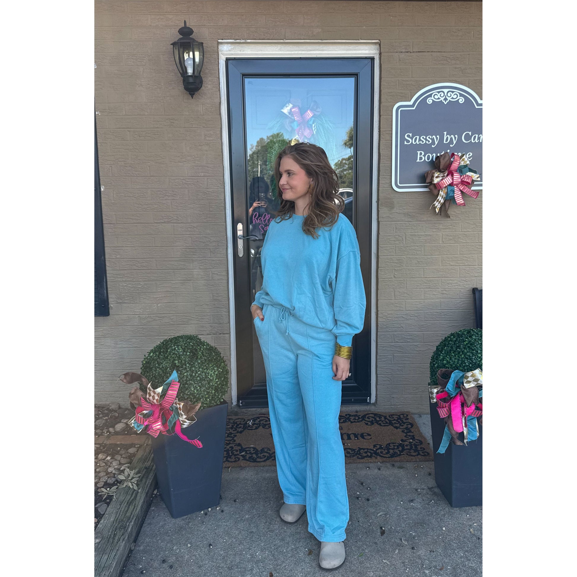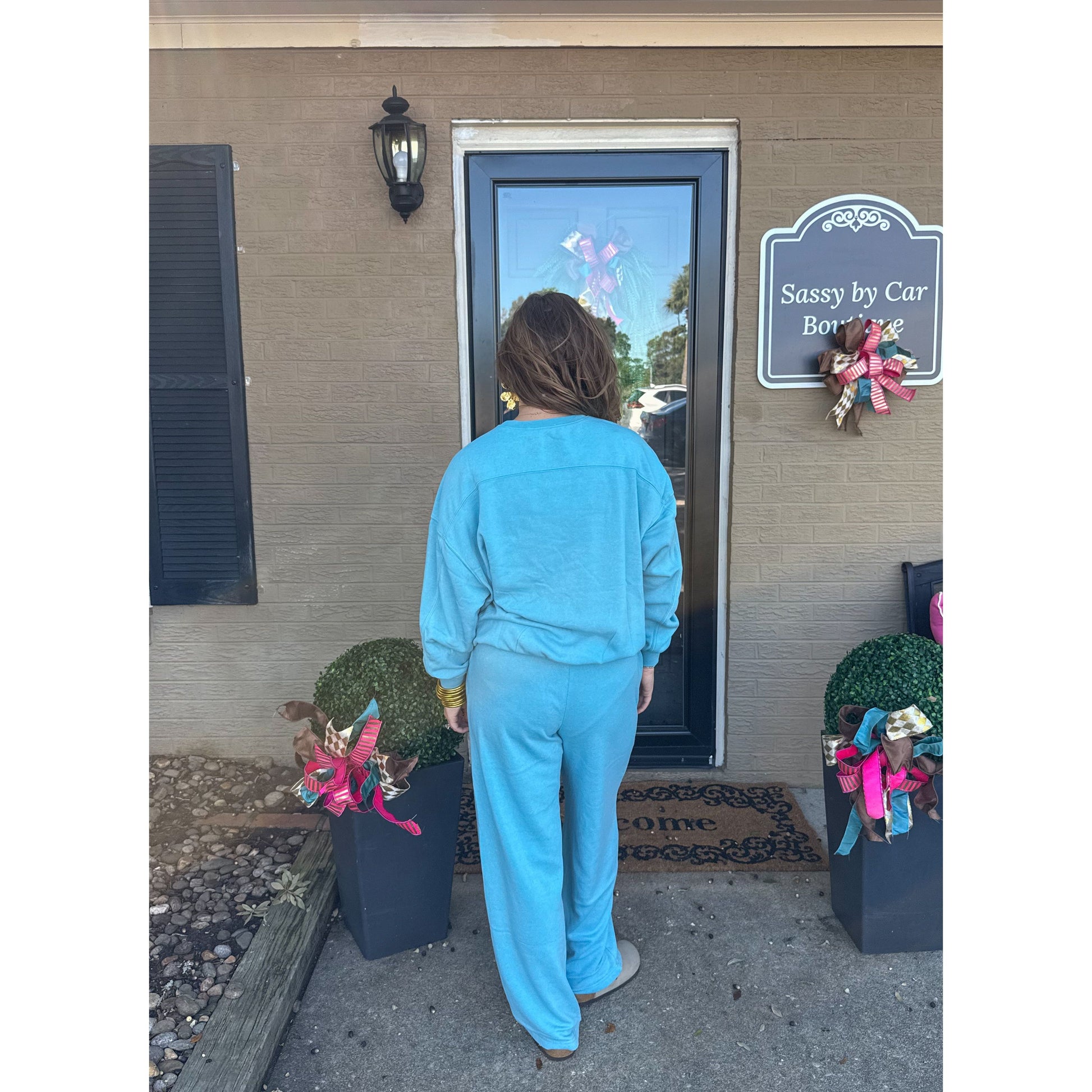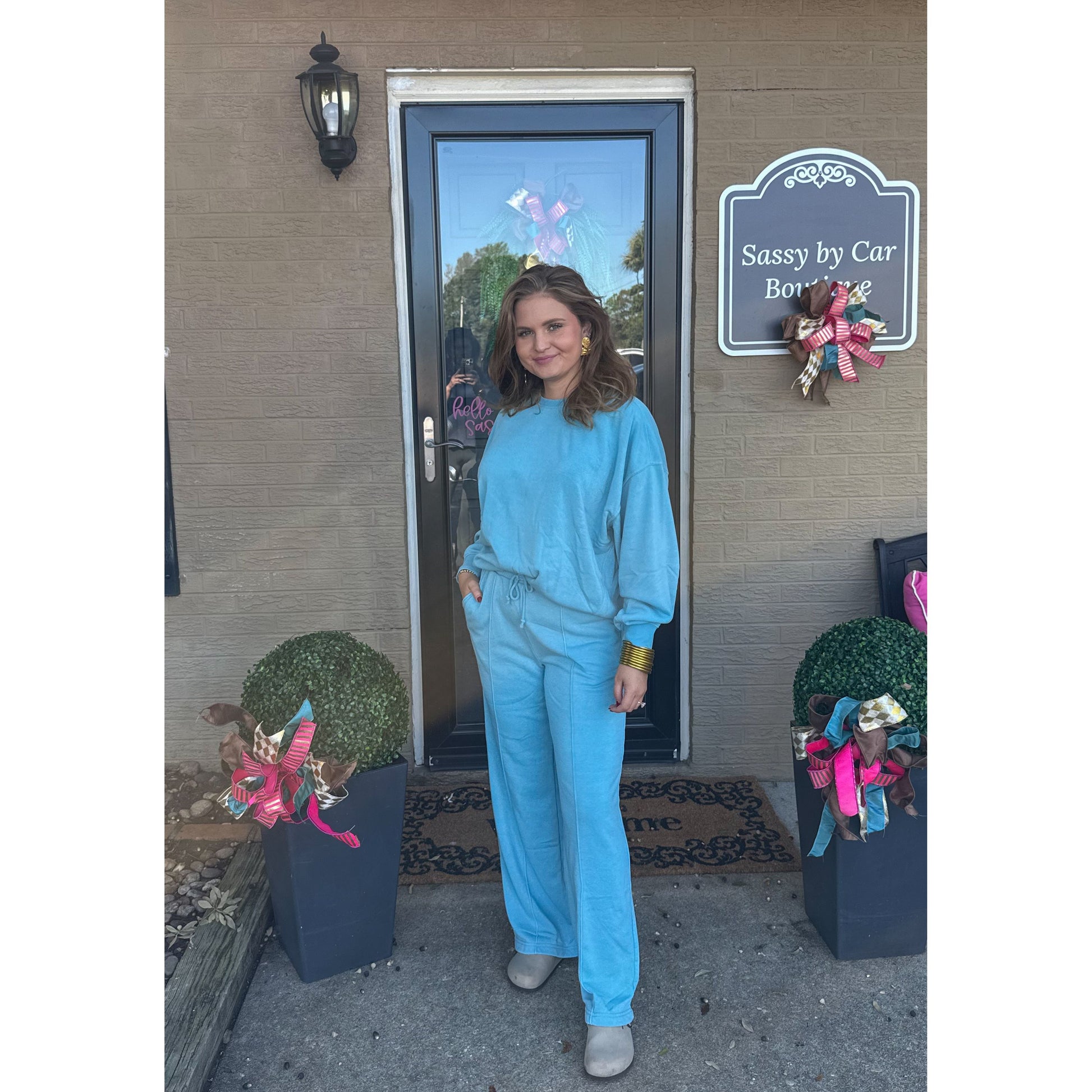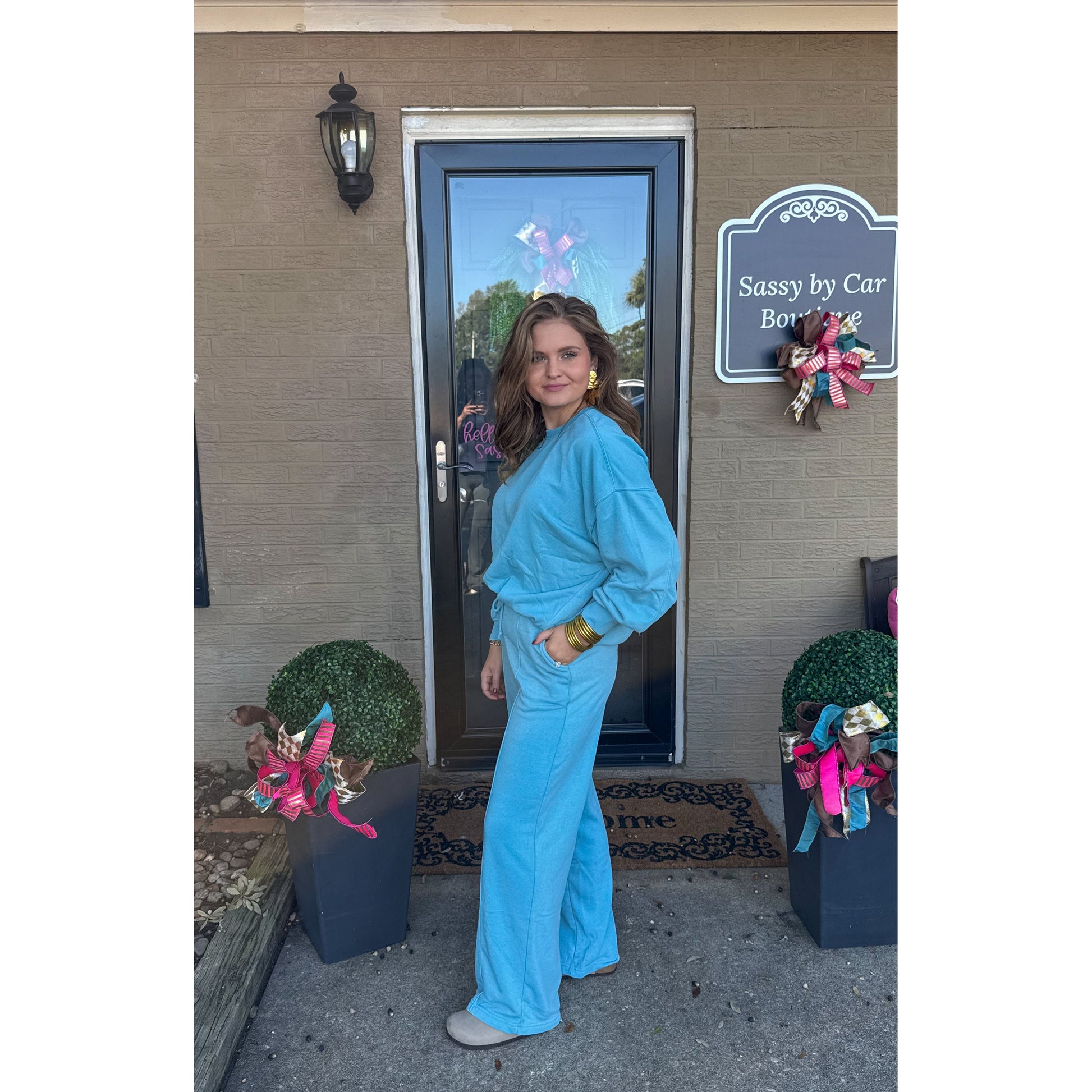 Sold as a set. Ocean blue oversized sweatshirt with ocean blue lounge sweatpants. Sweatpants have an elastic waistband and pockets.