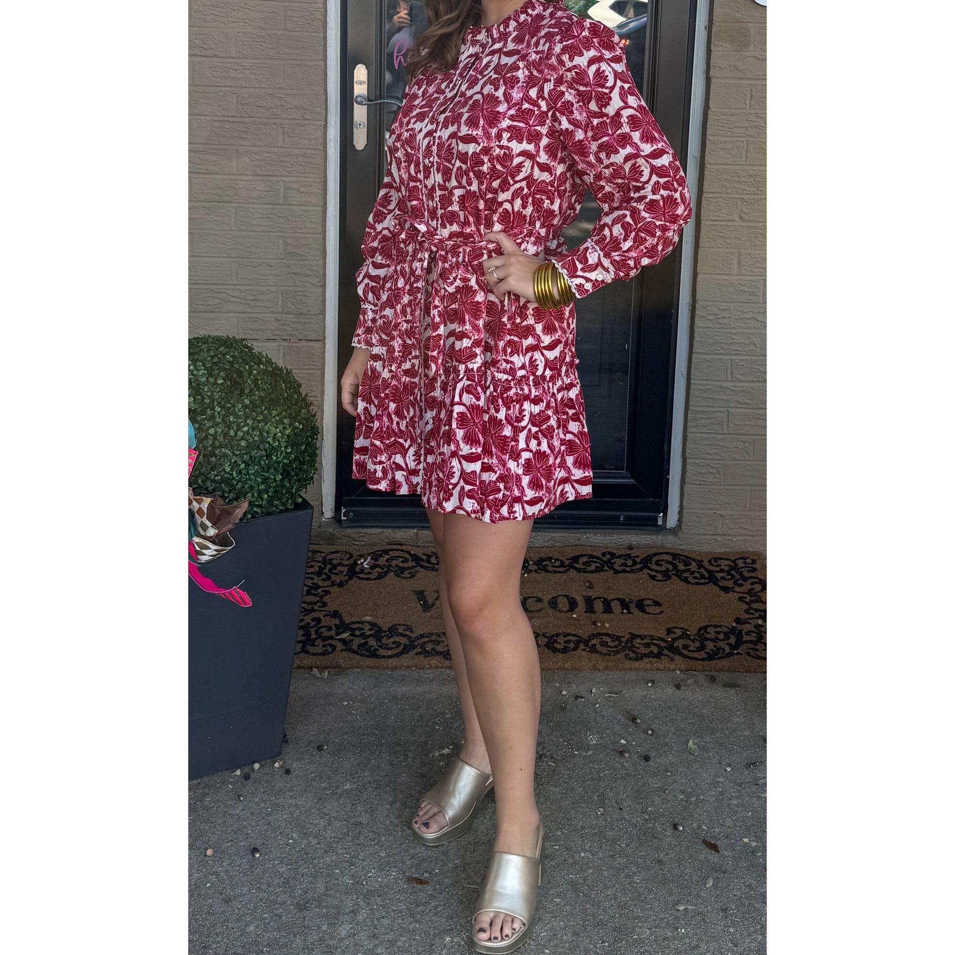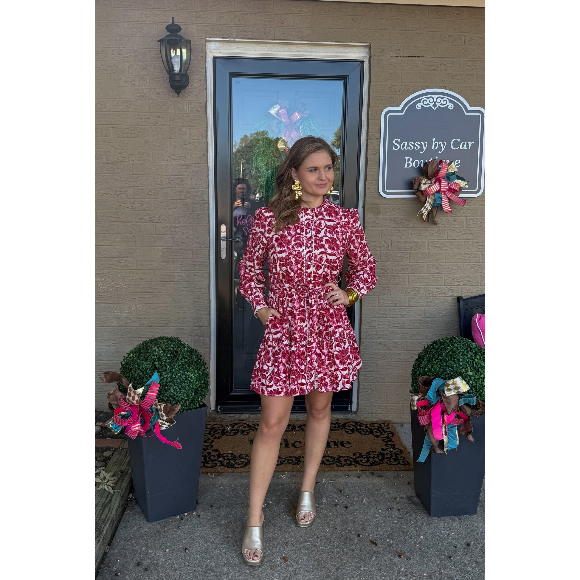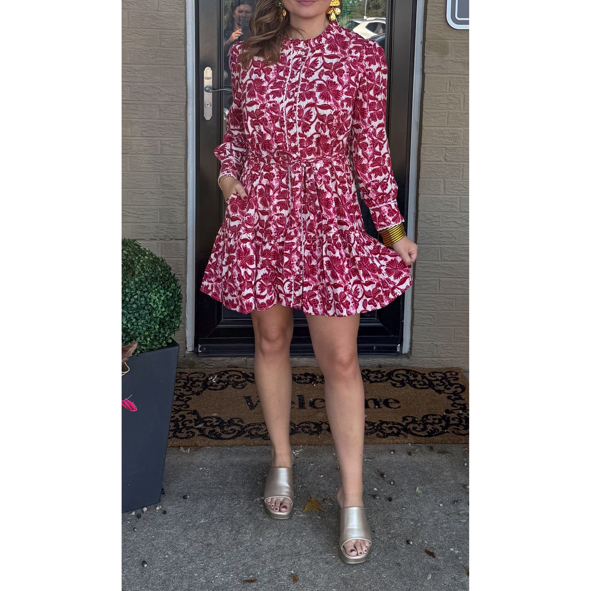 Pink multi color pattern mini dress. Ruffle detail collar with long sleeves and does have pockets with a tie belt.